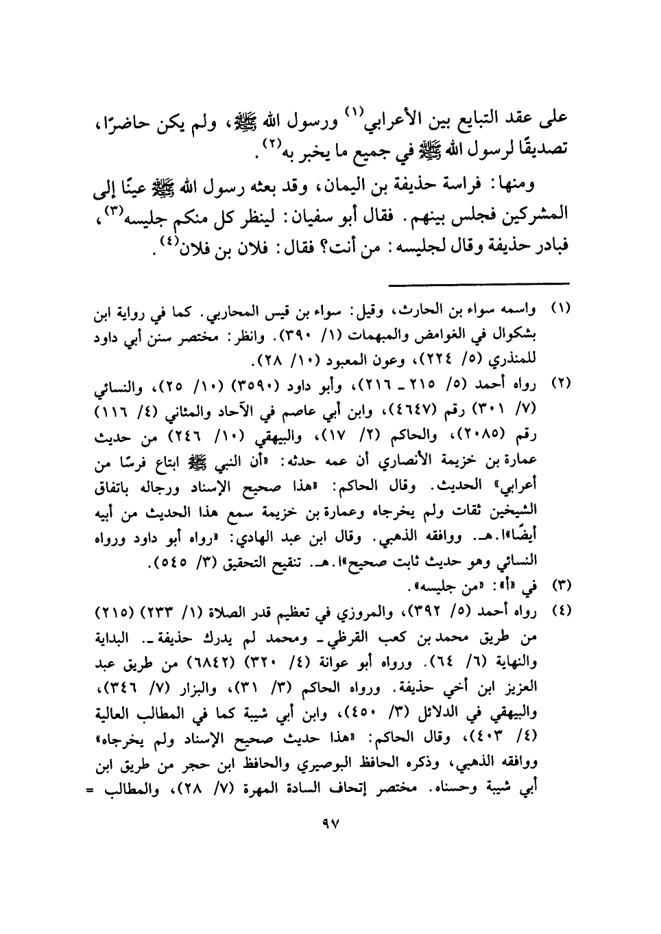 (¬٤) رواه أحمد (٥/ ٣٩٢)، والمروزي في تعظيم قدر الصلاة (١/ ٢٣٣) (٢١٥) من طريق محمد بن كعب القرظي - ومحمد لم يدرك حذيفة -. البداية والنهاية (٦/ ٦٤). ورواه أبو عوانة (٤/ ٣٢٠) (٦٨٤٢) من طريق عبد العزيز ابن أخي حذيفة. ورواه الحاكم (٣/ ٣١)، والبزار (٧/ ٣٤٦)، والبيهقي في الدلائل (٣/ ٤٥٠)، وابن أبي شيبة كما في المطالب العالية (٤/ ٤٠٣)، وقال الحاكم: "هذا حديث صحيح الإسناد ولم يخرجاه" ووافقه الذهبي، وذكره الحافظ البوصيري والحافظ ابن حجر من طريق ابن أبي شيبة وحسناه. مختصر إتحاف السادة المهرة (٧/ ٢٨)، والمطالب =