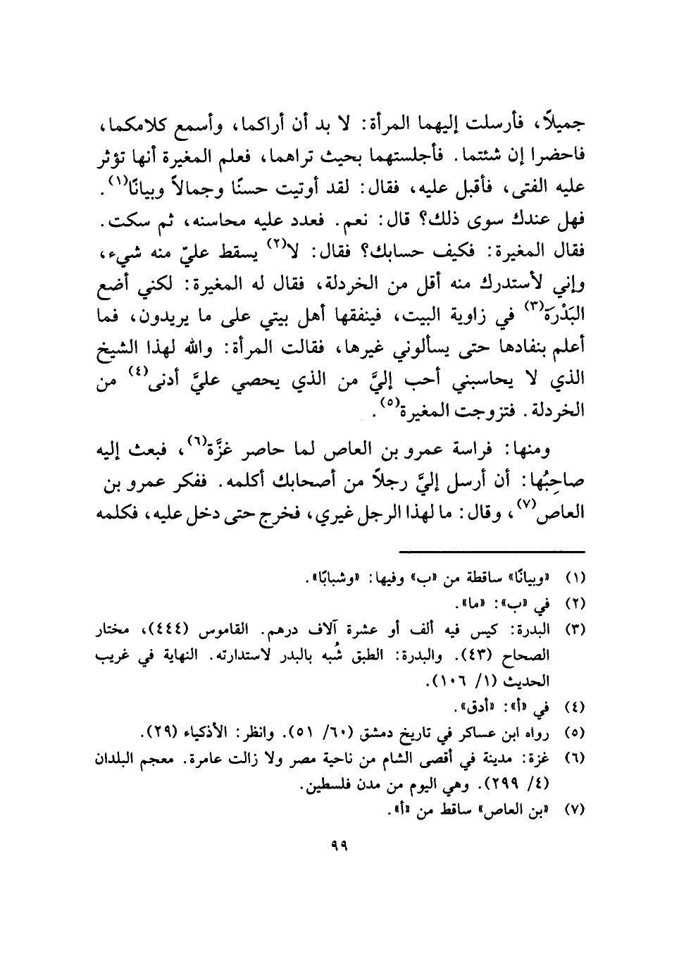 جميلًا، فأرسلت إليهما المرأة: لا بد أن أراكما، وأسمع كلامكما، فاحضرا إن شئتما. فأجلستهما بحيث تراهما، فعلم المغيرة أنها تؤثر عليه الفتى، فأقبل عليه، فقال: لقد أوتيت حسنًا وجمالًا وبيانًا (¬١). فهل عندك سوى ذلك؟ قال: نعم. فعدد عليه محاسنه، ثم سكت. فقال المغيرة: فكيف حسابك؟ فقال: لا (¬٢) يسقط عليّ منه شيء، وإني لأستدرك منه أقل من الخردلة، فقال له المغيرة: لكني أضع البَدْرَة (¬٣) في زاوية البيت، فينفقها أهل بيتي على ما يريدون، فما أعلم بنفادها حتى يسألوني غيرها، فقالت المرأة: والله لهذا الشيخ الذي لا يحاسبني أحب إليَّ من الذي يحصي عليَّ أدنى (¬٤) من الخردلة. فتزوجت المغيرة (¬٥).