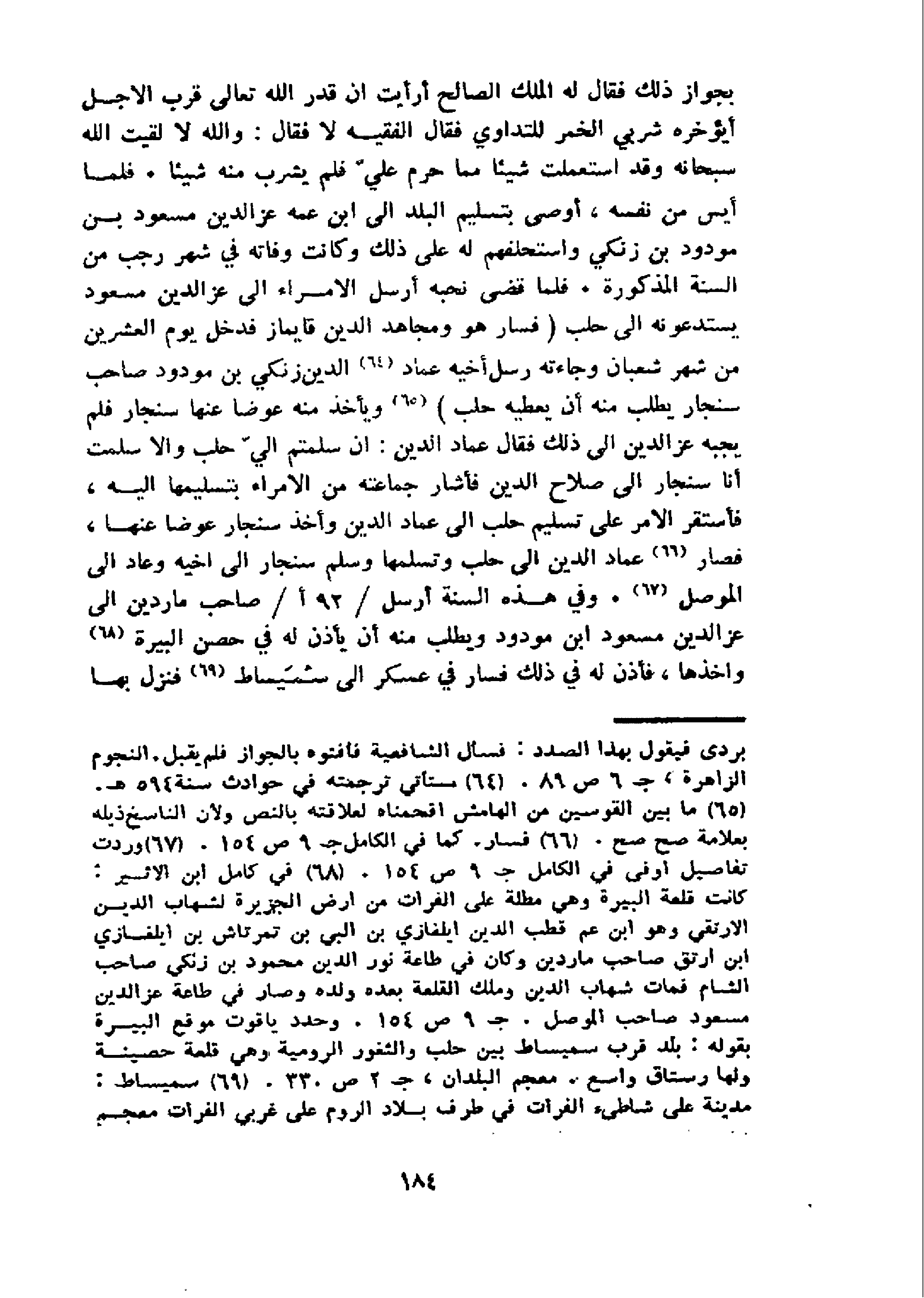 بجواز ذلك فقال له الملك الصالح أرأيت ان قدر الله تعالى قرب الاجل أيؤخره شربي الخمر للتداوي فقال الفقيه لا فقال: والله لا لقيت الله سبحانه وقد استعملت شيئا مما حرم عليّ فلم يشرب منه شيئا. فلما أيس من نفسه، أوصى بتسليم البلد الى ابن عمه عز الدين مسعود بن مودود بن زنكي واستحلفهم له على ذلك وكانت وفاته في شهر رجب من السنة المذكورة. فلما قضى نحبه أرسل الامراء الى عز الدين مسعود يستدعونه الى حلب (فسار هو ومجاهد الدين قايماز فدخل يوم العشرين من شهر شعبان وجاءته رسل أخيه عماد 64 الدين زنكي بن مودود صاحب سنجار يطلب منه أن يعطيه حلب) 65 و يأخذ منه عوضا عنها سنجار فلم يجبه عز الدين الى ذلك فقال عماد الدين: ان سلمتم اليّ حلب والا سلمت أنا سنجار الى صلاح الدين فأشار جماعته من الامراء بتسليمها اليه، فأستقر الامر على تسليم حلب الى عماد الدين وأخذ سنجار عوضا عنها، فصار 66 عماد الدين الى حلب وتسلمها وسلم سنجار الى اخيه وعاد الى الموصل 67.