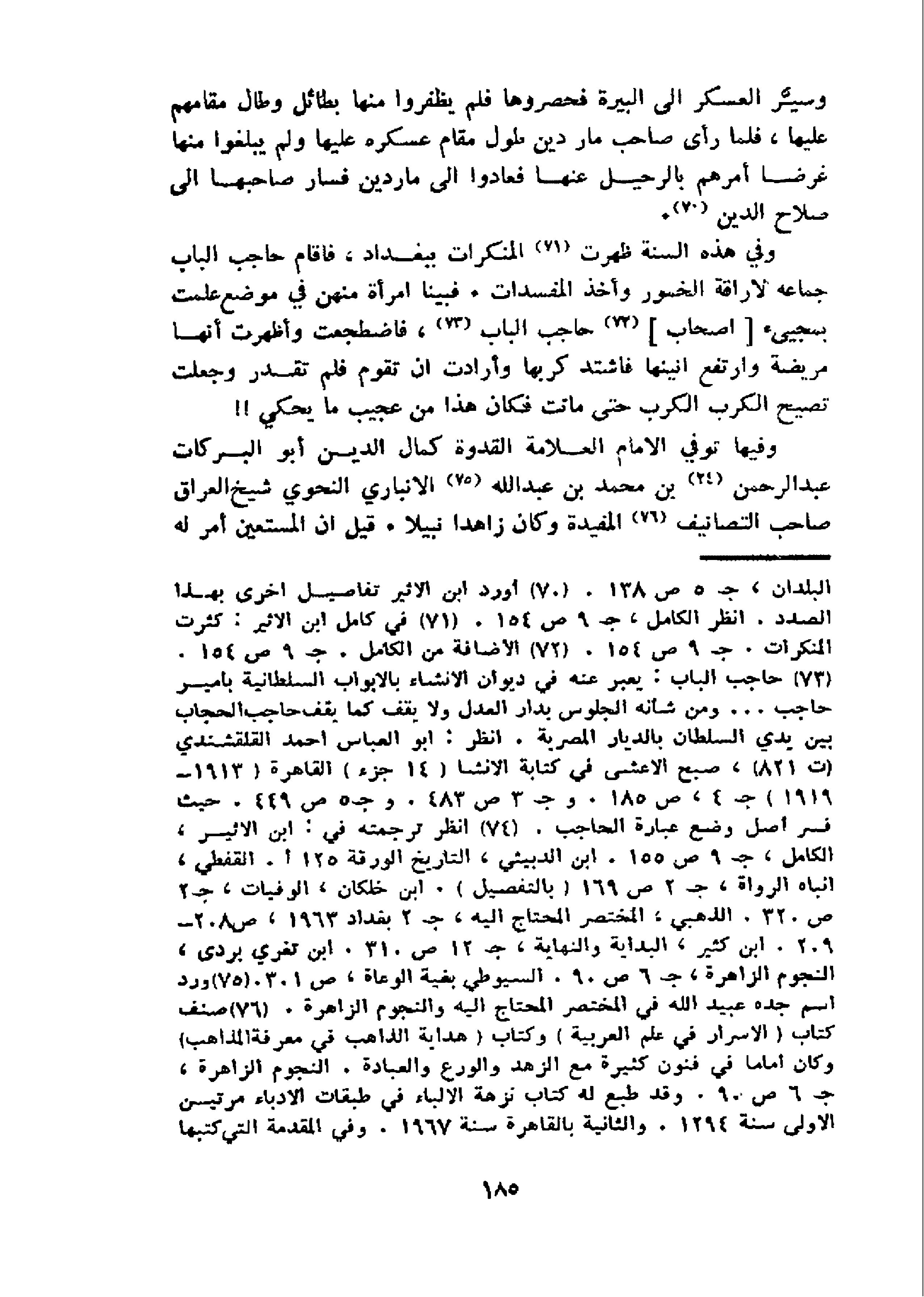 وفيها توفي الامام العلامة القدوة كمال الدين أبو البركات عبد الرحمن 74 بن محمد بن عبد الله 75 الانباري النحوي شيخ العراق صاحب التصانيف 76 المفيدة وكان زاهدا نبيلا. قيل ان المستعين أمر له