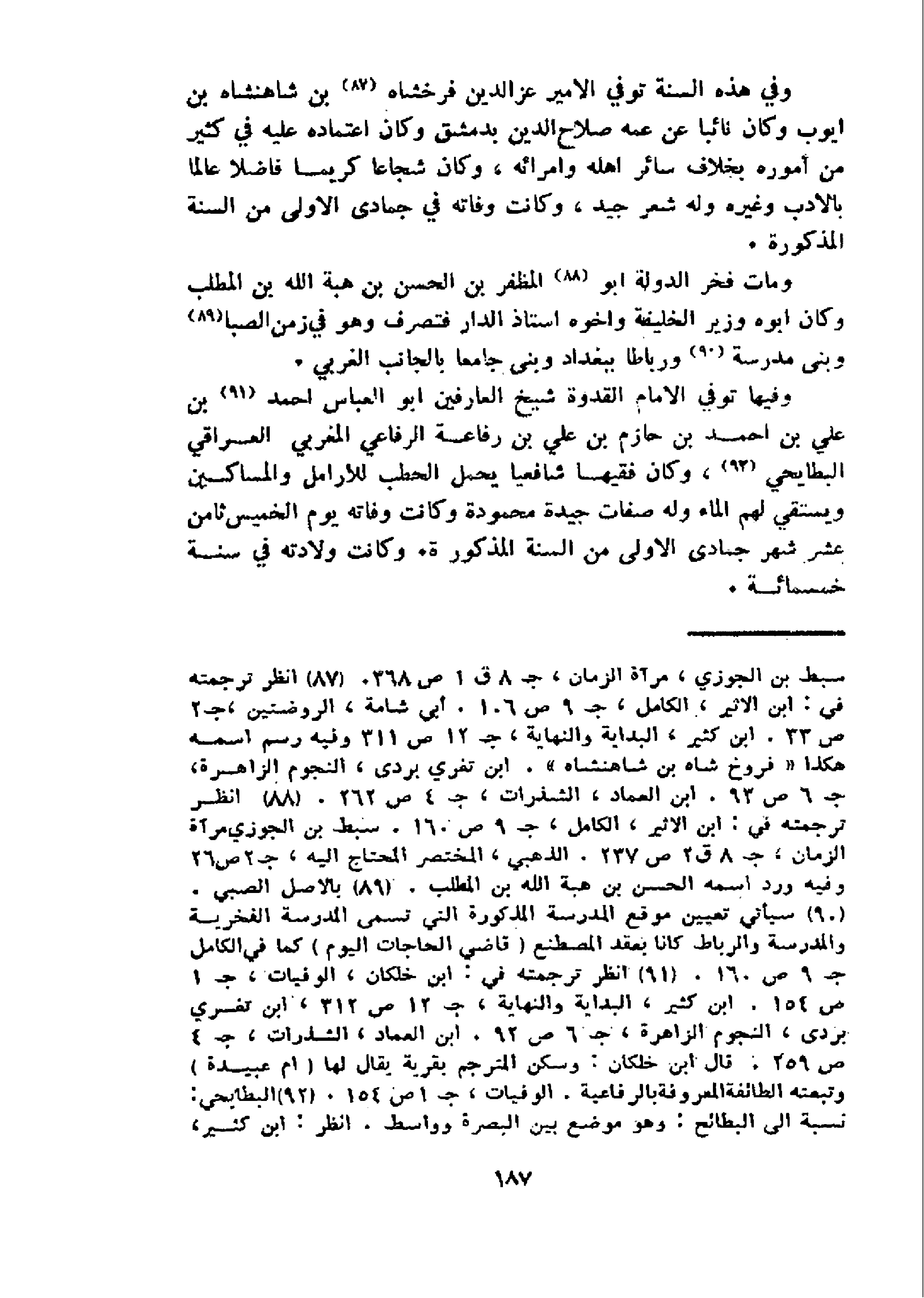 و في هذه السنة توفي الامير عز الدين فرخشاه 87 بن شاهنشاه بن ايوب وكان نائبا عن عمه صلاح الدين بدمشق وكان اعتماده عليه في كثير من أموره بخلاف سائر اهله وامرائه، وكان شجاعا كريما فاضلا عالما بالادب وغيره وله شعر جيد، وكانت وفاته في جمادى الاولى من السنة المذكورة.