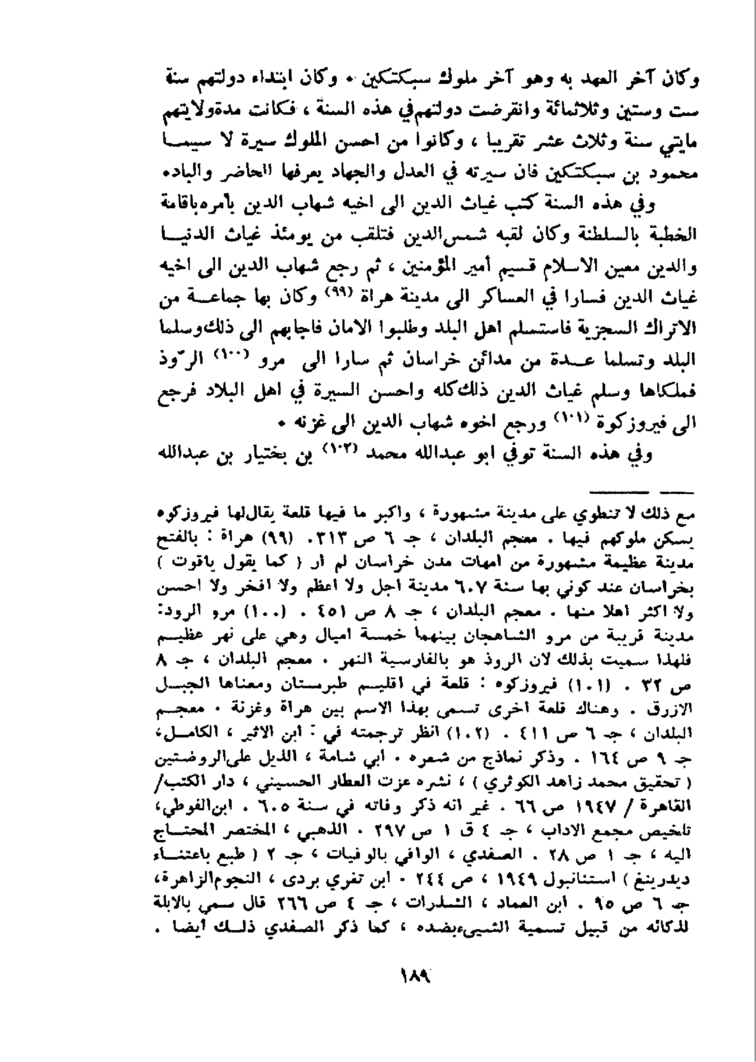 و كان آخر العهد به وهو آخر ملوك سبكتكين. وكان ابتداء دولتهم سنة ست وستين وثلاثمائة وانقرضت دولتهم في هذه السنة، فكانت مدة ولايتهم مايتي سنة وثلاث عشر تقريبا، وكانوا من احسن الملوك سيرة لا سيما محمود بن سبكتكين فان سيرته في العدل والجهاد يعرفها الحاضر والباد.