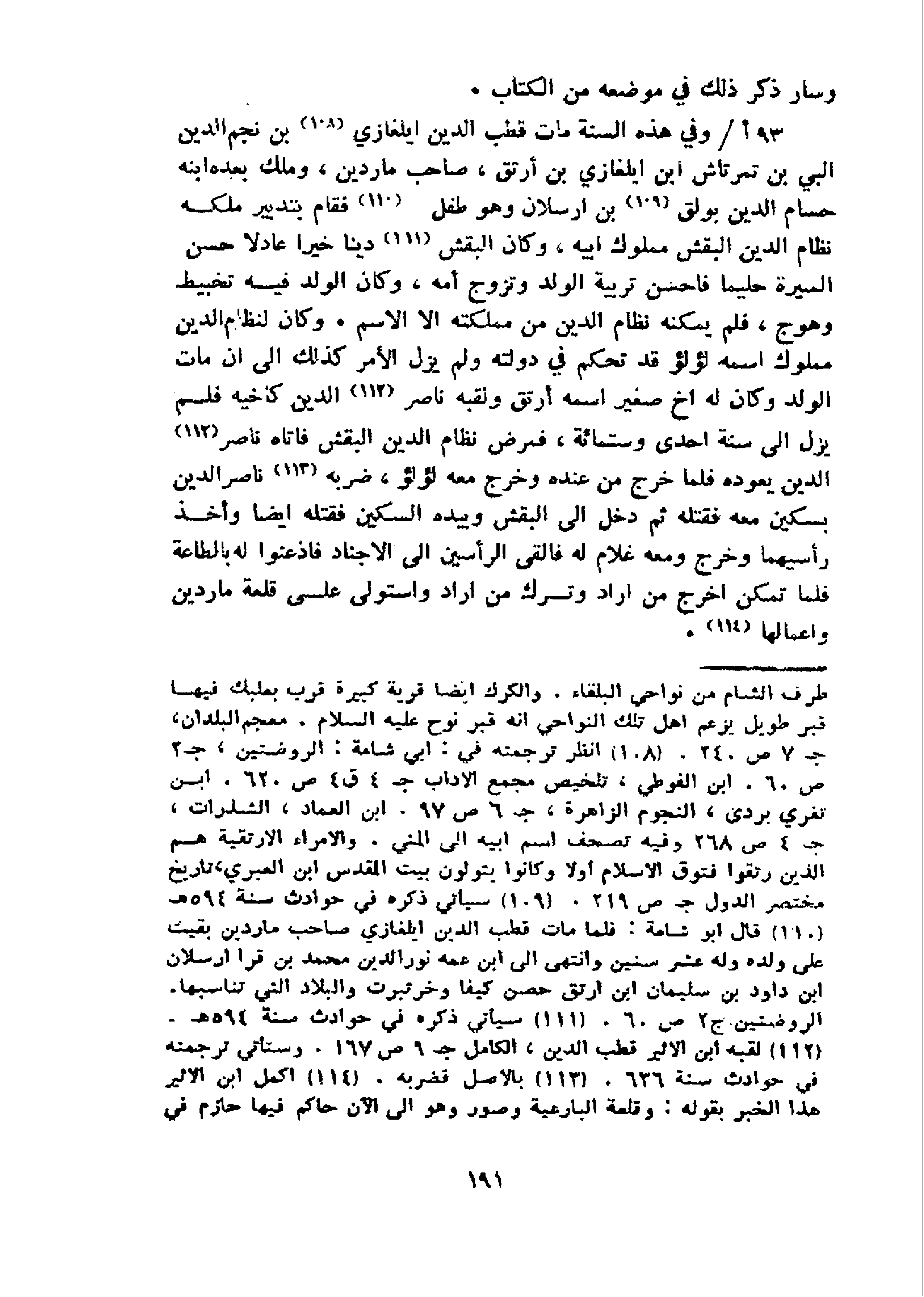 93 أ/و في هذه السنة مات قطب الدين ايلغازي 108 بن نجم الدين البي بن تمرتاش ابن ايلغازي بن أرتق، صاحب ماردين، وملك بعده ابنه حسام الدين بولق 109 بن ارسلان وهو طفل 110 فقام بتدبير ملكه نظام الدين البقش مملوك ابيه، وكان البقش 111 دينا خيرا عادلا حسن السيرة حليما فاحسن تربية الولد وتزوج أمه، وكان الولد فيه تخبيط وهوج، فلم يمكنه نظام الدين من مملكته الا الاسم. وكان لنظام الدين مملوك اسمه لؤلؤ قد تحكم في دولته ولم يزل الأمر كذلك الى ان مات الولد وكان له اخ صغير اسمه أرتق ولقبه ناصر 112 الدين كاخيه فلم يزل الى سنة احدى وستمائة، فمرض نظام الدين البقش فاتاه ناصر 112 الدين يعوده فلما خرج من عنده وخرج معه لؤلؤ، ضربه 113 ناصر الدين بسكين معه فقتله ثم دخل الى البقش وبيده السكين فقتله ايضا وأخذ رأسيهما وخرج ومعه غلام له فالقى الرأسين الى الاجناد فاذعنوا له بالطاعة فلما تمكن اخرج من اراد وترك من اراد واستولى على قلعة ماردين واعمالها 114.