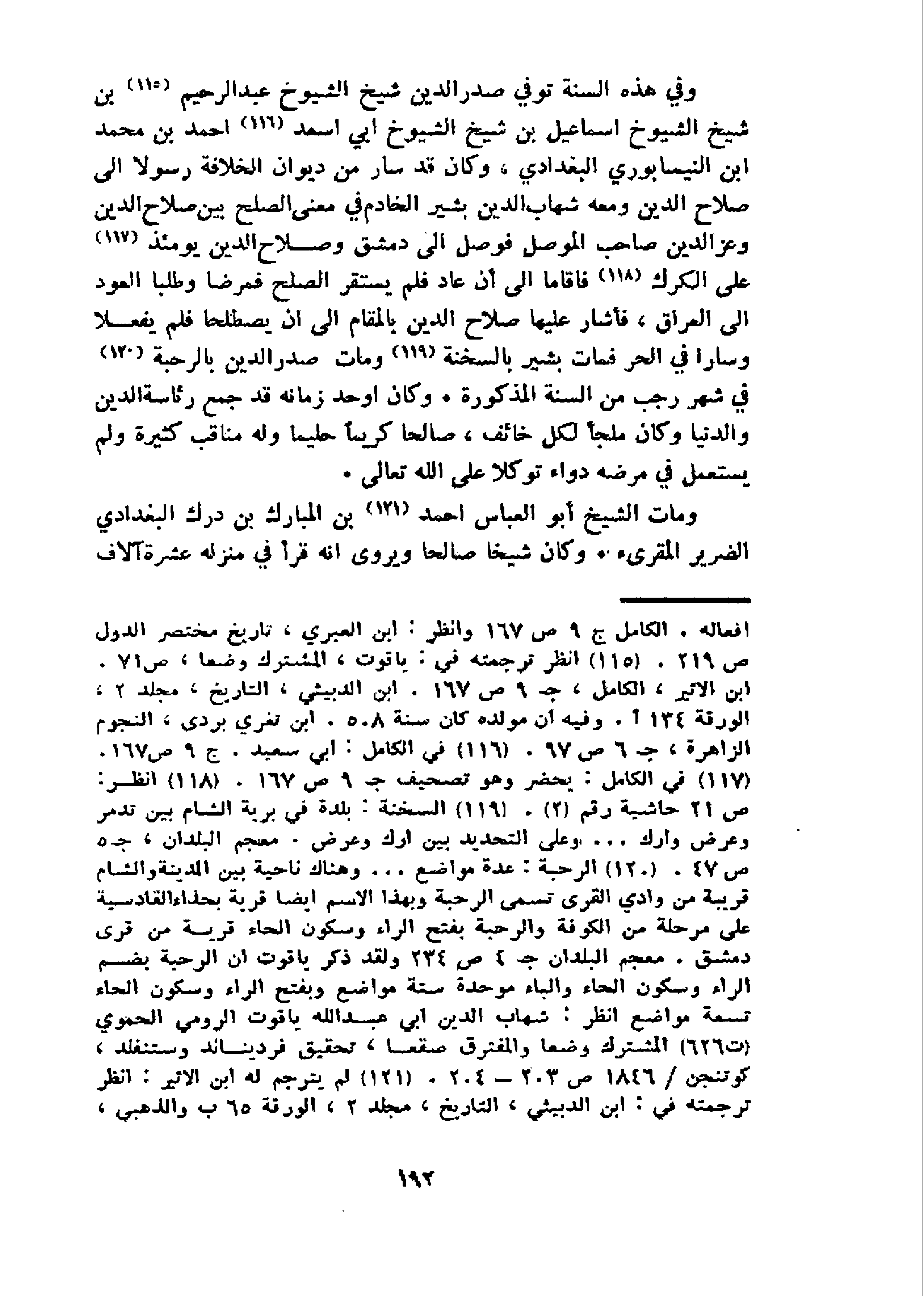 و في هذه السنة توفي صدر الدين شيخ الشيوخ عبد الرحيم 115 بن شيخ الشيوخ اسماعيل بن شيخ الشيوخ ابي اسعد 116 احمد بن محمد ابن النيسابوري البغدادي، وكان قد سار من ديوان الخلافة رسولا الى صلاح الدين ومعه شهاب الدين بشير الخادم في معنى الصلح بين صلاح الدين وعز الدين صاحب الموصل فوصل الى دمشق وصلاح الدين يومئذ 117 على الكرك 118 فاقاما الى أن عاد فلم يستقر الصلح فمرضا وطلبا العود الى العراق، فأشار عليها صلاح الدين بالمقام الى ان يصطلحا فلم يفعلا وسارا في الحر فمات بشير بالسخنة 119 و مات صدر الدين بالرحبة 120