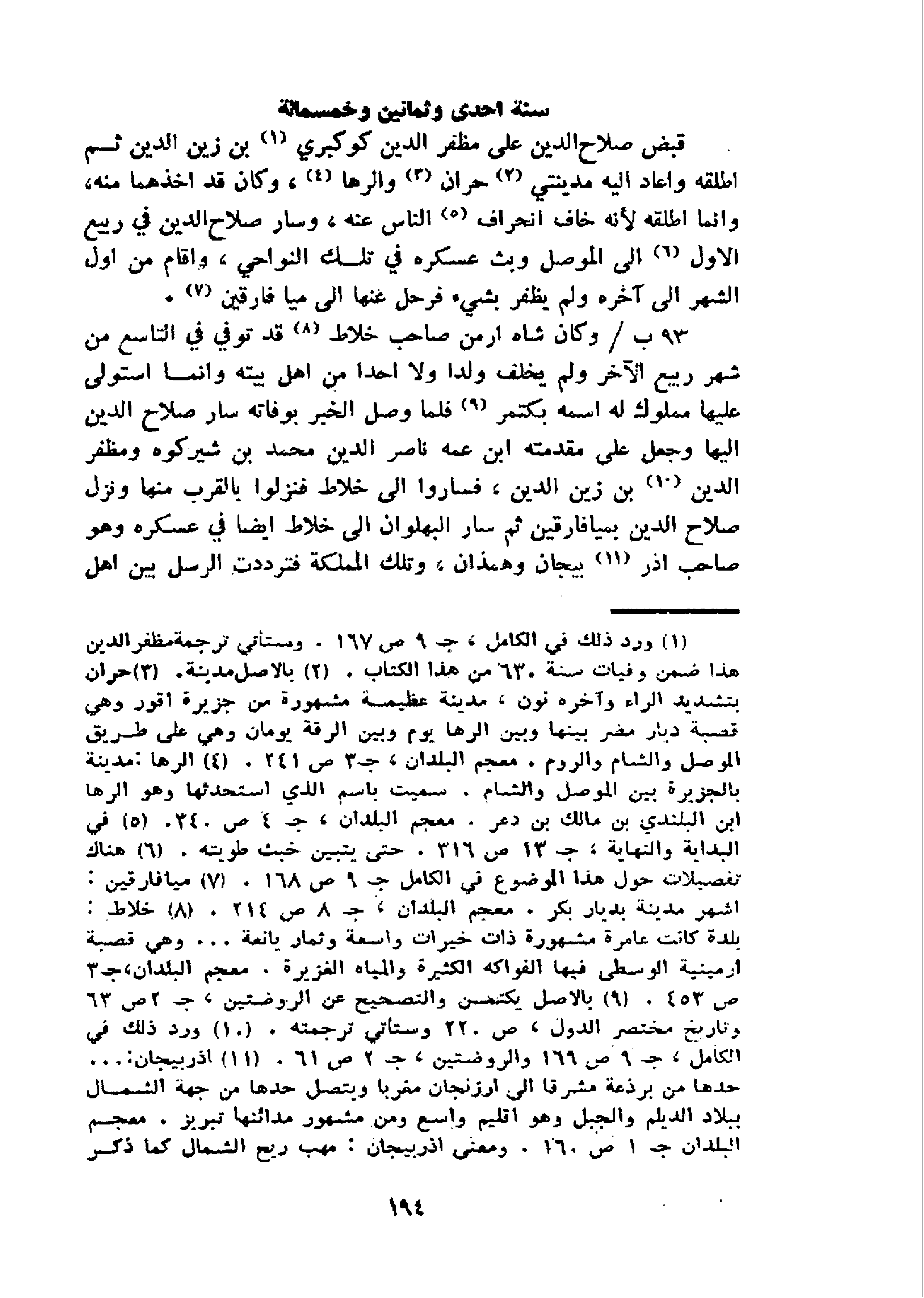 93 ب/و كان شاه ارمن صاحب خلاط 8 قد توفي في التاسع من شهر ربيع الآخر ولم يخلف ولدا ولا احدا من اهل بيته وانما استولى عليها مملوك له اسمه بكتمر 9 فلما وصل الخبر بوفاته سار صلاح الدين اليها وجعل على مقدمته ابن عمه ناصر الدين محمد بن شيركوه ومظفر الدين 10 بن زين الدين، فساروا الى خلاط فنزلوا بالقرب منها ونزل صلاح الدين بميافارقين ثم سار البهلوان الى خلاط ايضا في عسكره وهو صاحب اذر 11 بيجان وهمذان، وتلك المملكة فترددت الرسل بين اهل
