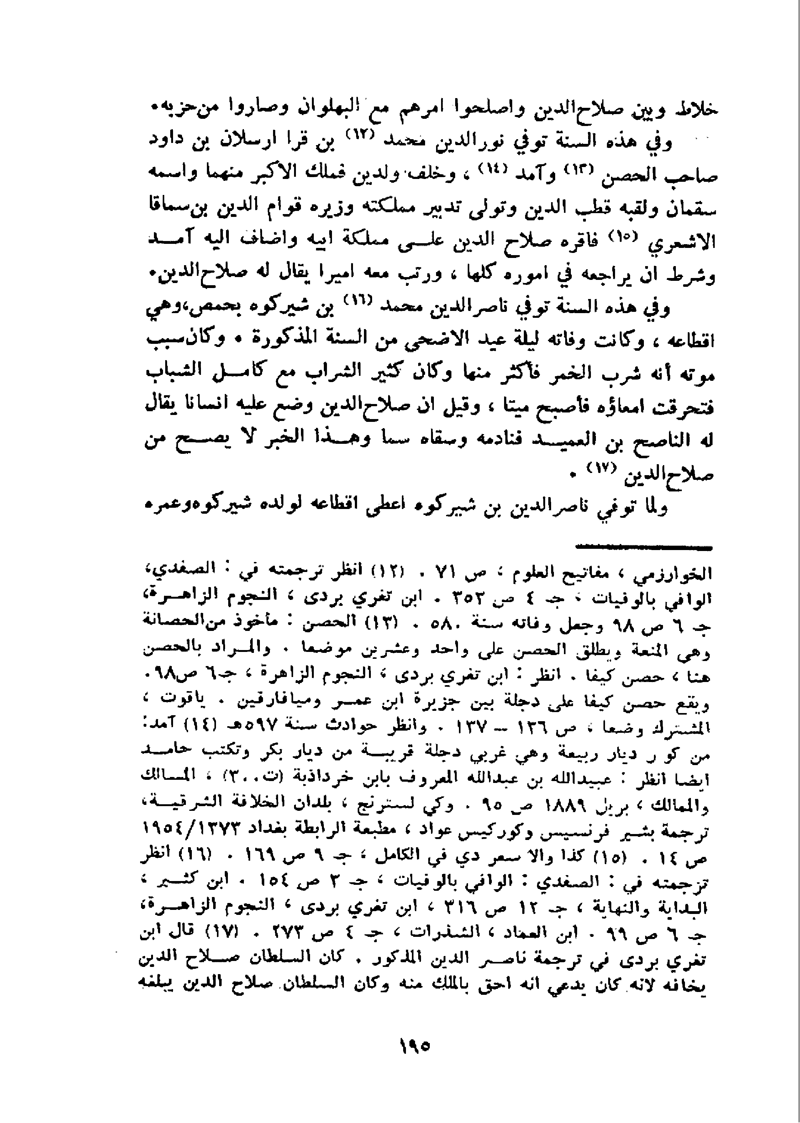 و في هذه السنة توفي نور الدين محمد 12 بن قرا ارسلان بن داود صاحب الحصن 13 و آمد 14، و خلف ولدين فملك الاكبر منهما واسمه سقمان ولقبه قطب الدين وتولى تدبير مملكته وزيره قوام الدين بن سماقا الاشعري 15 فاقره صلاح الدين على مملكة ابيه واضاف اليه آمد وشرط ان يراجعه في اموره كلها، ورتب معه اميرا يقال له صلاح الدين.