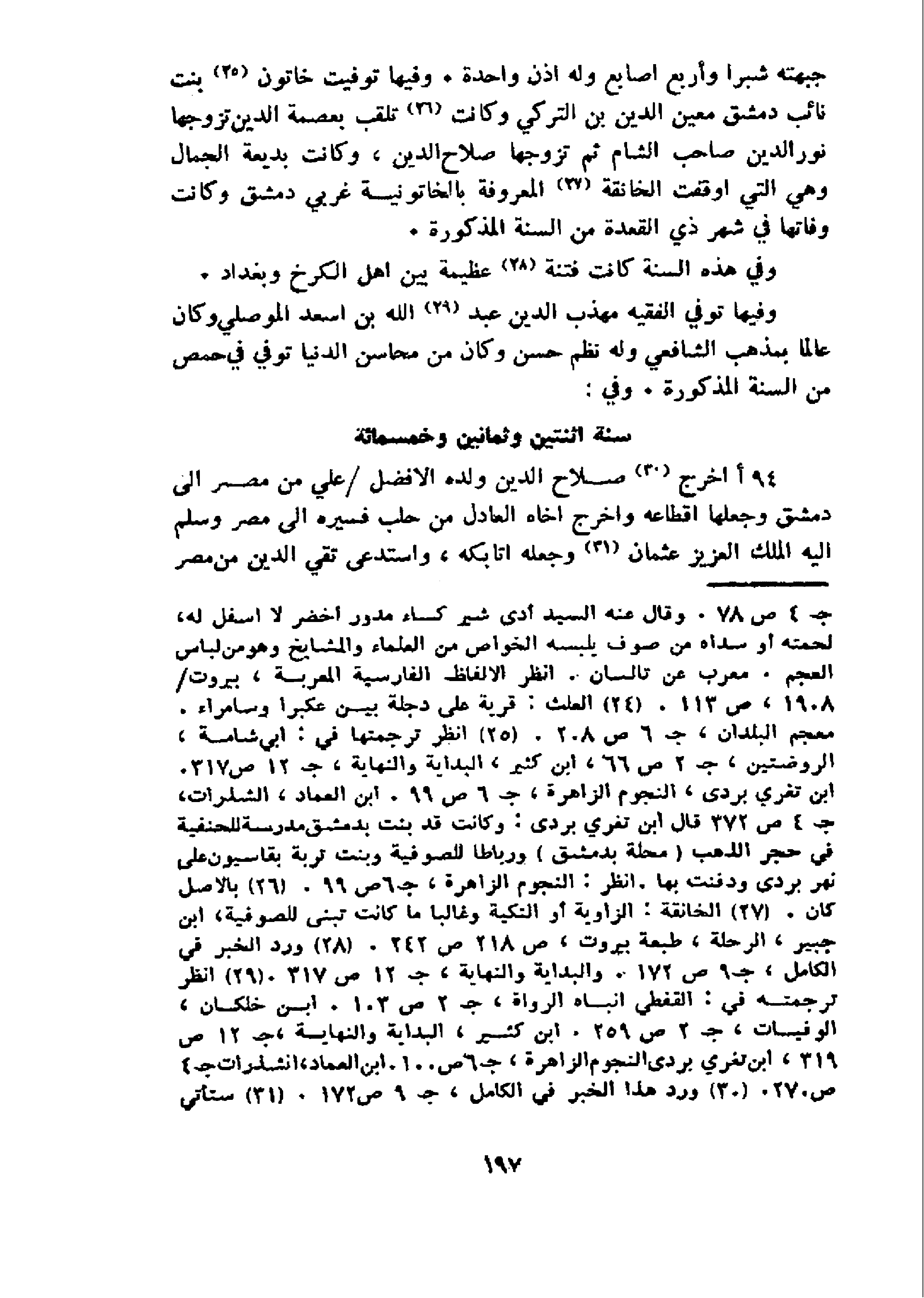 جبهته شبرا وأربع اصابع وله اذن واحدة. وفيها توفيت خاتون 25 بنت نائب دمشق معين الدين بن التركي وكانت 26 تلقب بعصمة الدين تزوجها نور الدين صاحب الشام ثم تزوجها صلاح الدين، وكانت بديعة الجمال وهي التي اوقفت الخانقة 27 المعروفة بالخاتونية غربي دمشق وكانت وفاتها في شهر ذي القعدة من السنة المذكورة.