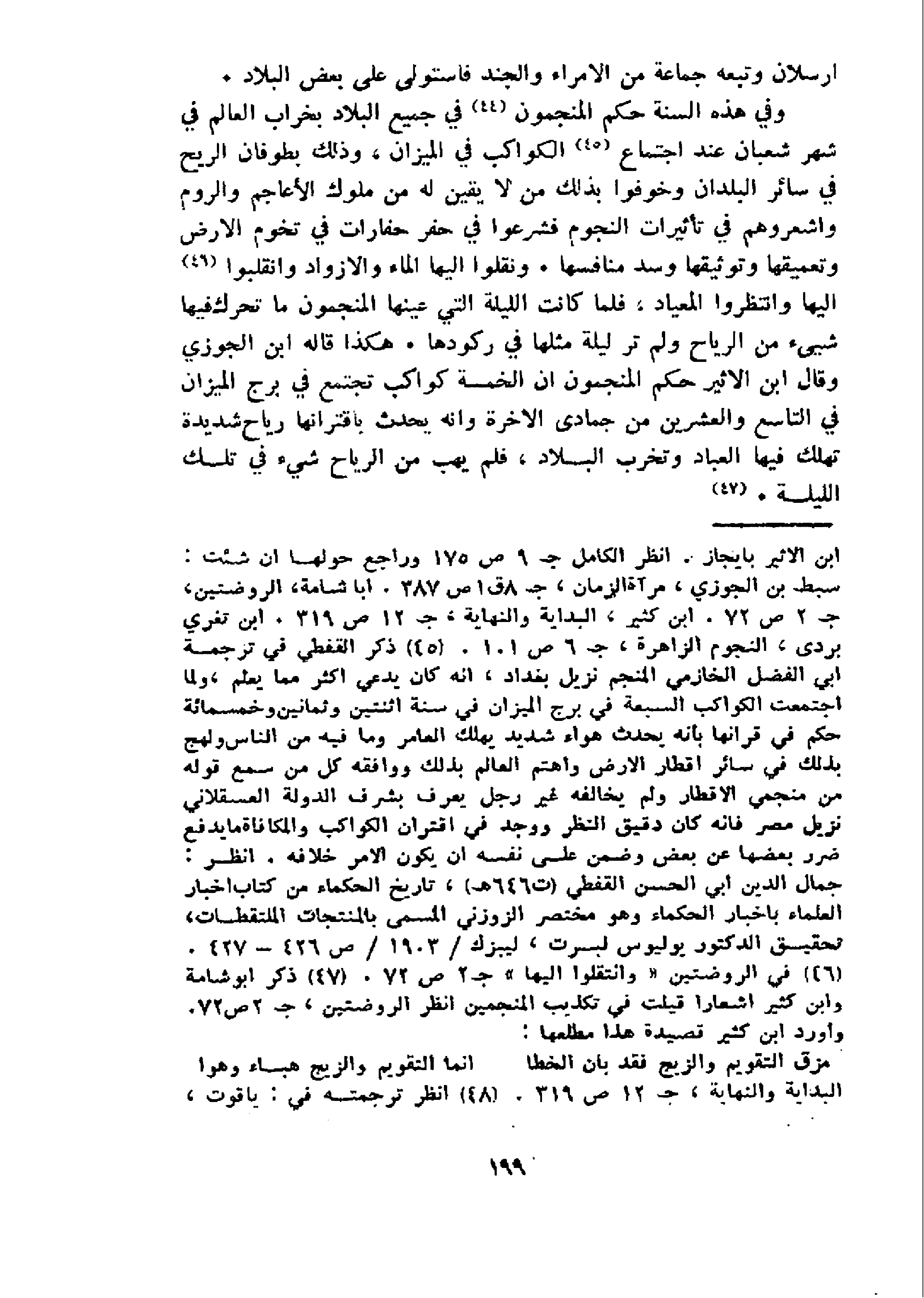 و في هذه السنة حكم المنجمون 44 في جميع البلاد بخراب العالم في شهر شعبان عند اجتماع 45 الكواكب في الميزان، وذلك بطوفان الريح في سائر البلدان وخوفوا بذلك من لا يقين له من ملوك الأعاجم والروم واشعروهم في تأثيرات النجوم فشرعوا في حفر حفارات في تخوم الارض وتعميقها وتوثيقها وسد منافسها. ونقلوا اليها الماء والازواد وانقلبوا 46 اليها وانتظروا المعياد، فلما كانت الليلة التي عينها المنجمون ما تحرك فيها شيىء من الرياح ولم تر ليلة مثلها في ركودها. هكذا قاله ابن الجوزي وقال ابن الاثير حكم المنجمون ان الخمسة كواكب تجتمع في برج الميزان في التاسع والعشرين من جمادى الاخرة وانه يحدث باقترانها رياح شديدة تهلك فيها العباد وتخرب البلاد، فلم يهب من الرياح شيء في تلك الليلة. 47