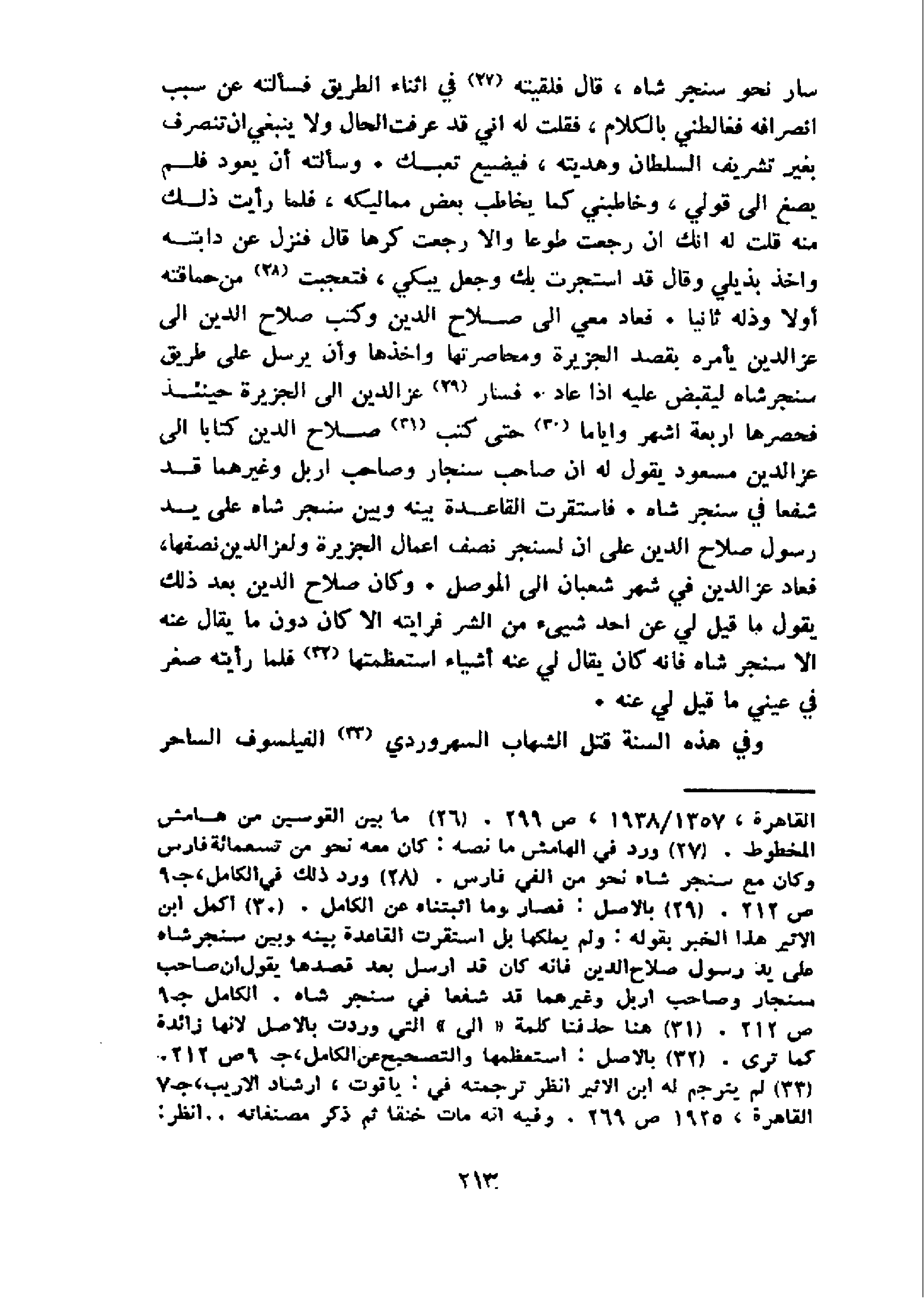 سار نحو سنجر شاه، قال فلقيته 27 في اثناء الطريق فسألته عن سبب انصرافه فغالطني بالكلام، فقلت له اني قد عرفت الحال ولا ينبغي ان تنصرف بغير تشريف السلطان وهديته، فيضيع تعبك. وسألته أن يعود فلم يصغ الى قولي، وخاطبني كما يخاطب بعض مماليكه، فلما رأيت ذلك منه قلت له انك ان رجعت طوعا والا رجعت كرها قال فنزل عن دابته واخذ بذيلي وقال قد استجرت بك وجعل يبكي، فتعجبت 28 من حماقته أولا وذله ثانيا. فعاد معي الى صلاح الدين وكتب صلاح الدين الى عز الدين يأمره بقصد الجزيرة ومحاصرتها واخذها وأن يرسل على طريق سنجر شاه ليقبض عليه اذا عاد. فسار 29 عز الدين الى الجزيرة حينئذ فحصرها اربعة اشهر واياما 30 حتى كتب 31 صلاح الدين كتابا الى عز الدين مسعود يقول له ان صاحب سنجار وصاحب اربل وغيرهما قد شفعا في سنجر شاه. فاستقرت القاعدة بينه وبين سنجر شاه على يد رسول صلاح الدين على ان لسنجر نصف اعمال الجزيرة ولعز الدين نصفها، فعاد عز الدين في شهر شعبان الى الموصل. وكان صلاح الدين بعد ذلك يقول ما قيل لي عن احد شيىء من الشر فرايته الا كان دون ما يقال عنه الا سنجر شاه فانه كان يقال لي عنه أشياء استعظمتها 32 فلما رأيته صغر في عيني ما قيل لي عنه.