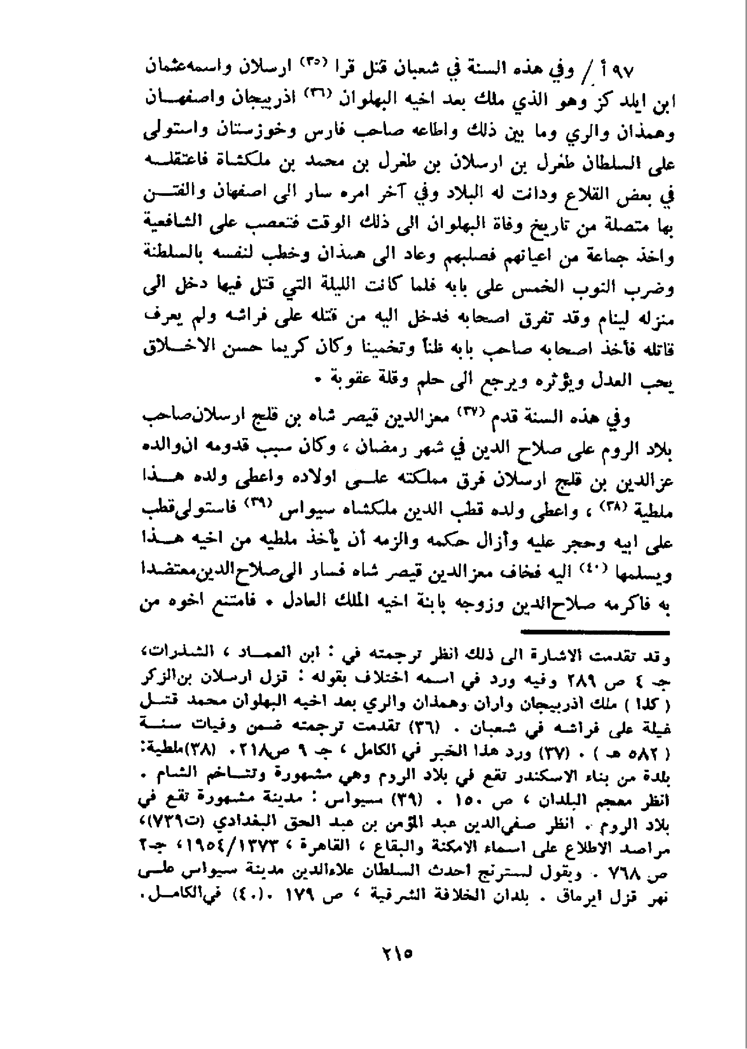 97 أ/و في هذه السنة في شعبان قتل قرا 35 ارسلان واسمه عثمان ابن ايلدكز وهو الذي ملك بعد اخيه البهلوان 36 اذربيجان واصفهان وهمذان والري وما بين ذلك واطاعه صاحب فارس وخوزستان واستولى على السلطان طغرل بن ارسلان بن طغرل بن محمد بن ملكشاه فاعتقله في بعض القلاع ودانت له البلاد وفي آخر امره سار الى اصفهان والفتن بها متصلة من تاريخ وفاة البهلوان الى ذلك الوقت فتعصب على الشافعية واخذ جماعة من اعيانهم فصلبهم وعاد الى همذان وخطب لنفسه بالسلطنة وضرب النوب الخمس على بابه فلما كانت الليلة التي قتل فيها دخل الى منزله لينام وقد تفرق اصحابه فدخل اليه من قتله على فراشه ولم يعرف قاتله فأخذ اصحابه صاحب بابه ظنا وتخمينا وكان كريما حسن الاخلاق يحب العدل ويؤثره ويرجع الى حلم وقلة عقوبة.