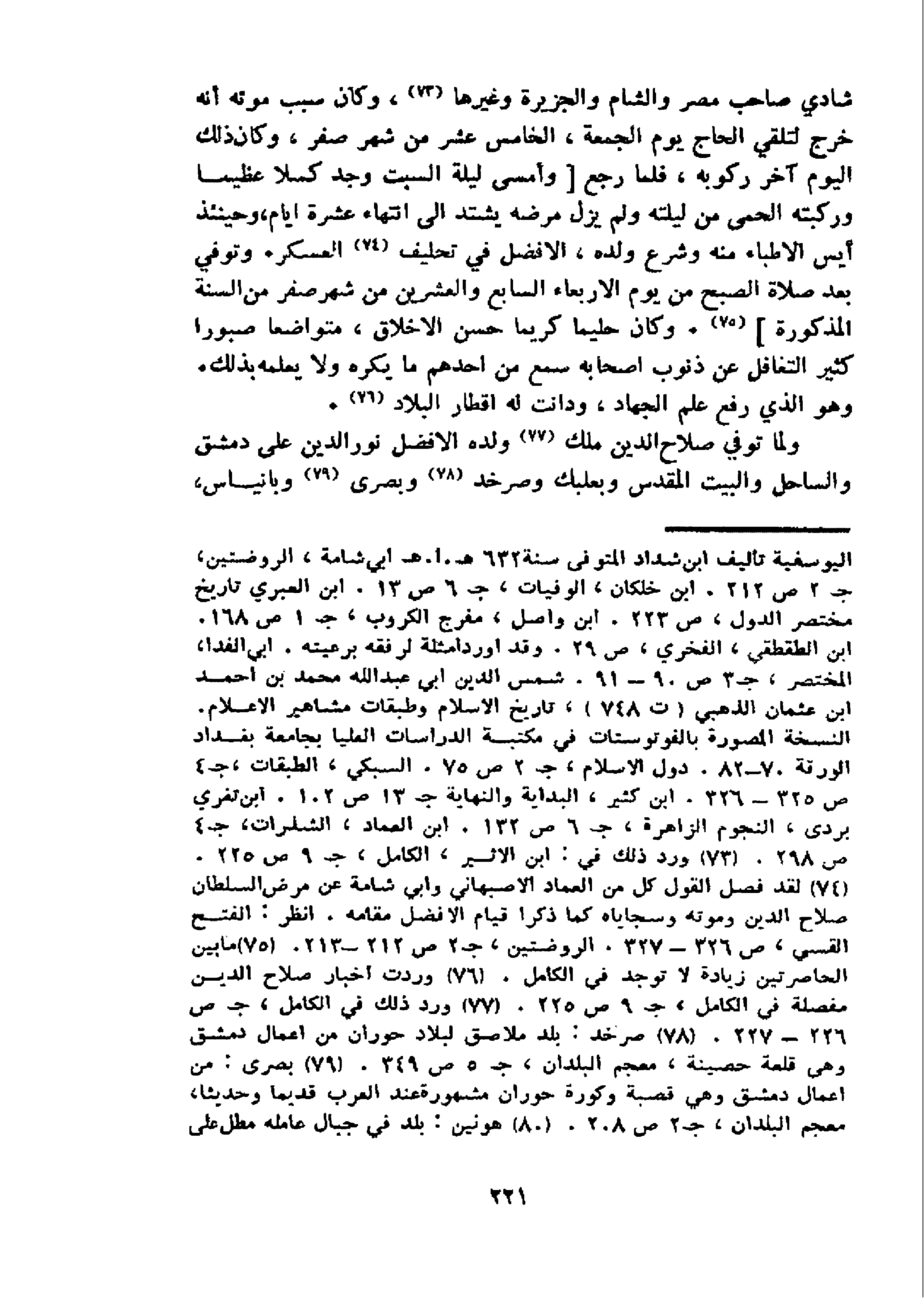 شادي صاحب مصر والشام والجزيرة وغيرها 73، و كان سبب موته أنه خرج لتلقي الحاج يوم الجمعة، الخامس عشر من شهر صفر، وكان ذلك اليوم آخر ركوبه، فلما رجع [و أمسى ليلة السبت وجد كسلا عظيما وركبته الحمى من ليلته ولم يزل مرضه يشتد الى انتهاء عشرة ايام، وحينئذ أيس الاطباء منه وشرع ولده، الافضل في تحليف 74 العسكر. وتوفي بعد صلاة الصبح من يوم الاربعاء السابع والعشرين من شهر صفر من السنة المذكورة] 75.و كان حليما كريما حسن الاخلاق، متواضعا صبورا كثير التغافل عن ذنوب اصحابه سمع من احدهم ما يكره ولا يعلمه بذلك.