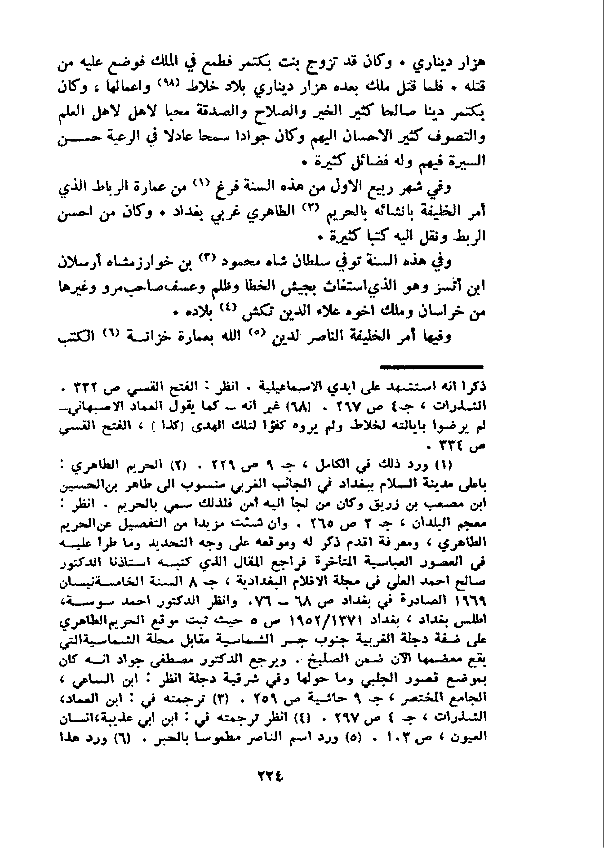 وفي شهر ربيع الاول من هذه السنة فرغ 1 من عمارة الرباط الذي أمر الخليفة بانشائه بالحريم 2 الطاهري غربي بغداد. وكان من احسن الربط ونقل اليه كتبا كثيرة.