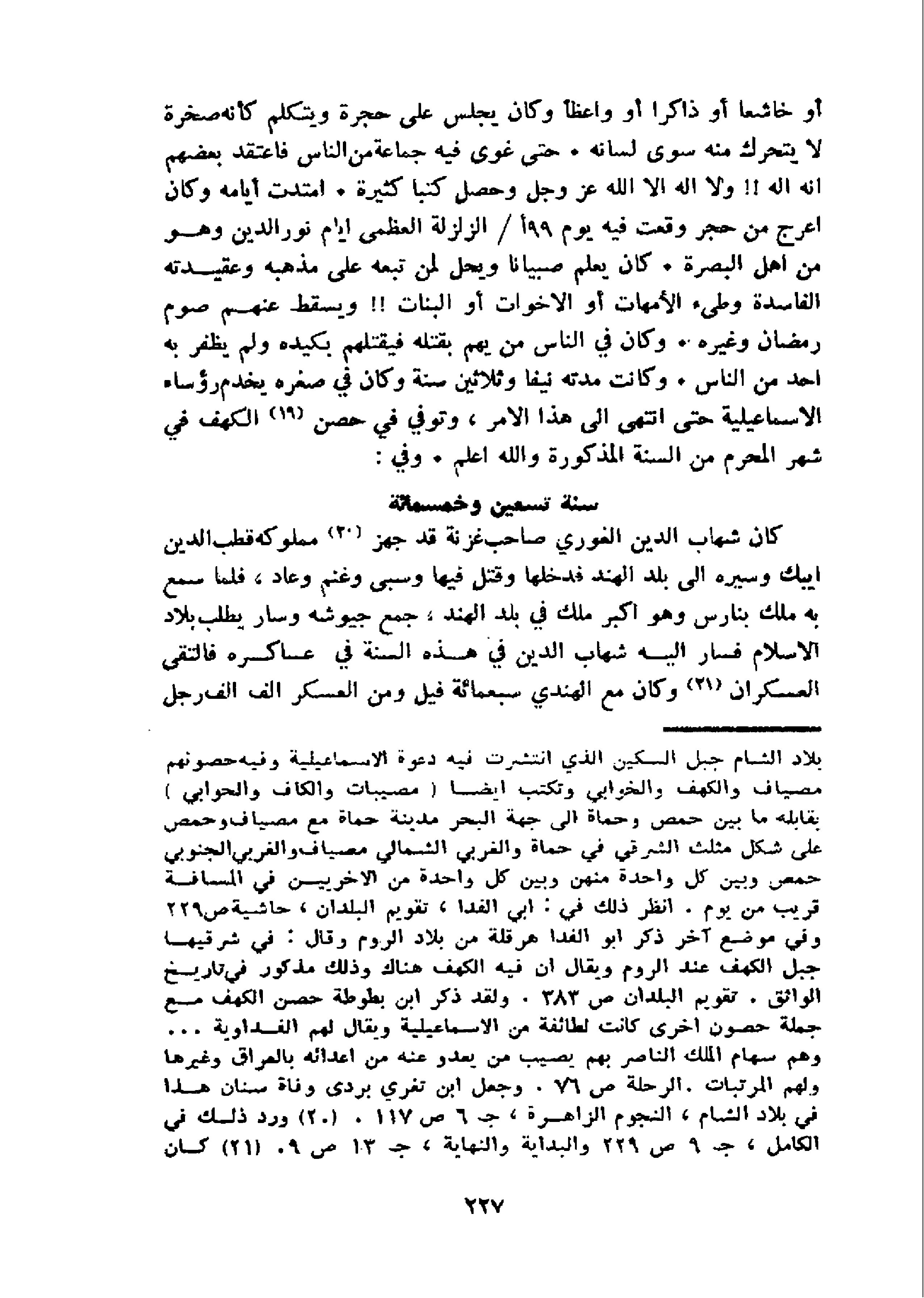 أو خاشعا أو ذاكرا أو واعظا وكان يجلس على حجرة ويتكلم كأنه صخرة لا يتحرك منه سوى لسانه. حتى غوى فيه جماعة من الناس فاعتقد بعضهم انه اله!! ولا اله الا الله عز وجل وحصل كتبا كثيرة. امتدت أيامه وكان اعرج من حجر وقعت فيه يوم 99 أ/الزلزلة العظمى ايام نور الدين وهو من اهل البصرة. كان يعلم صبيانا ويحل لمن تبعه على مذهبه وعقيدته الفاسدة وطىء الأمهات أو الاخوات أو البنات!! ويسقط عنهم صوم رمضان وغيره. وكان في الناس من يهم بقتله فيقتلهم بكيده ولم يظفر به احد من الناس. وكانت مدته نيفا وثلاثين سنة وكان في صغره يخدم رؤساء الاسماعيلية حتى انتهى الى هذا الامر، وتوفي في حصن 19 الكهف في شهر المحرم من السنة المذكورة والله اعلم. وفي: