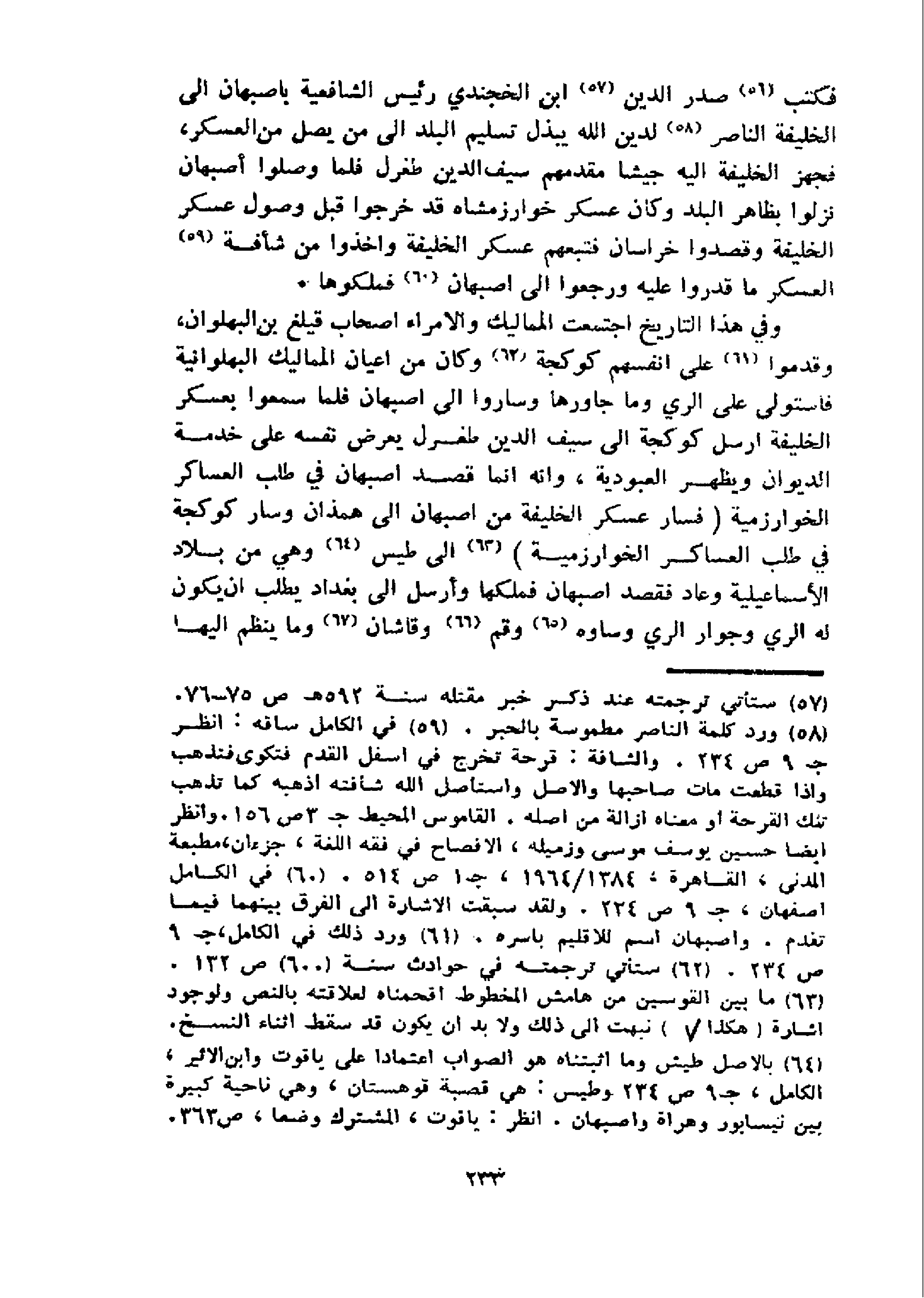 فكتب 56 صدر الدين 57 ابن الخجندي رئيس الشافعية باصبهان الى الخليفة الناصر 58 لدين الله يبذل تسليم البلد الى من يصل من العسكر، فجهز الخليفة اليه جيشا مقدمهم سيف الدين طغرل فلما وصلوا أصبهان نزلوا بظاهر البلد وكان عسكر خوارزمشاه قد خرجوا قبل وصول عسكر الخليفة وقصدوا خراسان فتبعهم عسكر الخليفة واخذوا من شأفة 59 العسكر ما قدروا عليه ورجعوا الى اصبهان 60 فملكوها.