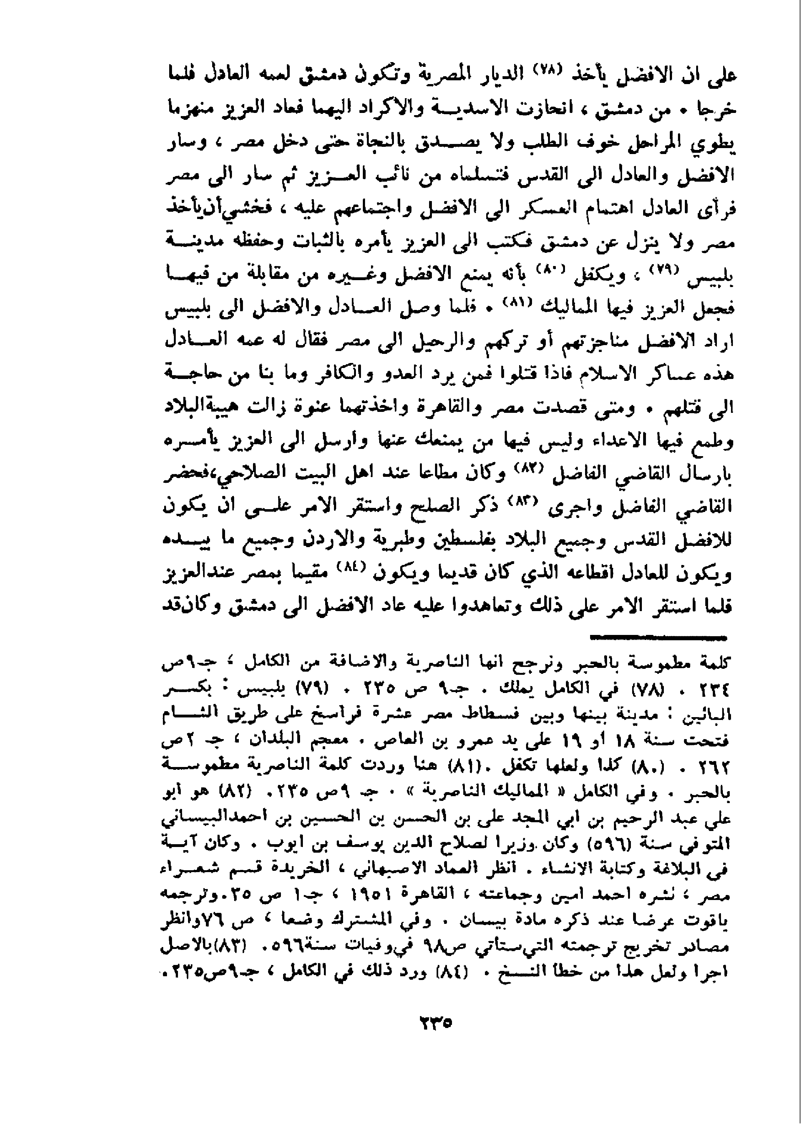 على ان الافضل يأخذ 78 الديار المصرية وتكون دمشق لعمه العادل فلما خرجا. من دمشق، انحازت الاسدية والاكراد اليهما فعاد العزيز منهزما يطوي المراحل خوف الطلب ولا يصدق بالنجاة حتى دخل مصر، وسار الافضل والعادل الى القدس فتسلماه من نائب العزيز ثم سار الى مصر فرأى العادل اهتمام العسكر الى الافضل واجتماعهم عليه، فخشي أن يأخذ مصر ولا ينزل عن دمشق فكتب الى العزيز يأمره بالثبات وحفظه مدينة بلبيس 79، و يكفل 80 بأنه يمنع الافضل وغيره من مقابلة من فيها فجعل العزيز فيها المماليك 81.فلما وصل العادل والافضل الى بلبيس اراد الافضل مناجزتهم أو تركهم والرحيل الى مصر فقال له عمه العادل هذه عساكر الاسلام فاذا قتلوا فمن يرد العدو والكافر وما بنا من حاجة الى قتلهم. ومتى قصدت مصر والقاهرة واخذتهما عنوة زالت هيبة البلاد وطمع فيها الاعداء وليس فيها من يمنعك عنها وارسل الى العزيز يأمره بارسال القاضي الفاضل 82 و كان مطاعا عند اهل البيت الصلاحي، فحضر القاضي الفاضل واجرى 83 ذكر الصلح واستقر الامر على ان يكون للافضل القدس وجميع البلاد بفلسطين وطبرية والاردن وجميع ما بيده ويكون للعادل اقطاعه الذي كان قديما ويكون 84 مقيما بمصر عند العزيز فلما استقر الامر على ذلك وتعاهدوا عليه عاد الافضل الى دمشق وكان قد