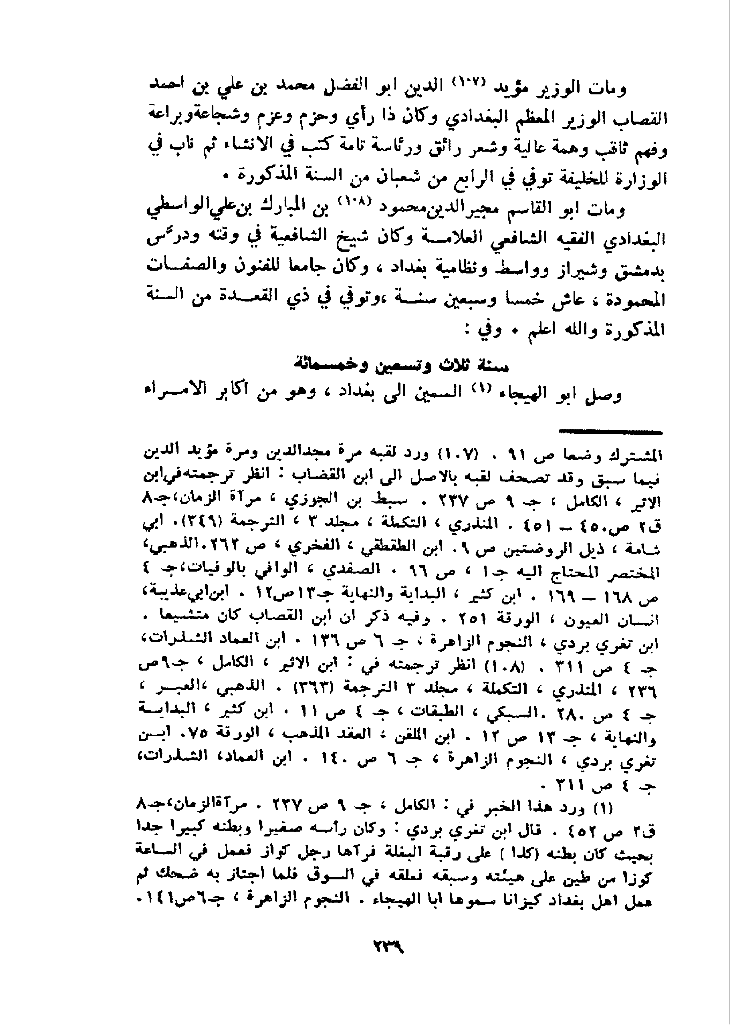 و مات الوزير مؤيد 107 الدين ابو الفضل محمد بن علي بن احمد القصاب الوزير المعظم البغدادي وكان ذا رأي وحزم وعزم وشجاعة وبراعة وفهم ثاقب وهمة عالية وشعر رائق ورئاسة تامة كتب في الانشاء ثم ناب في الوزارة للخليفة توفي في الرابع من شعبان من السنة المذكورة.
