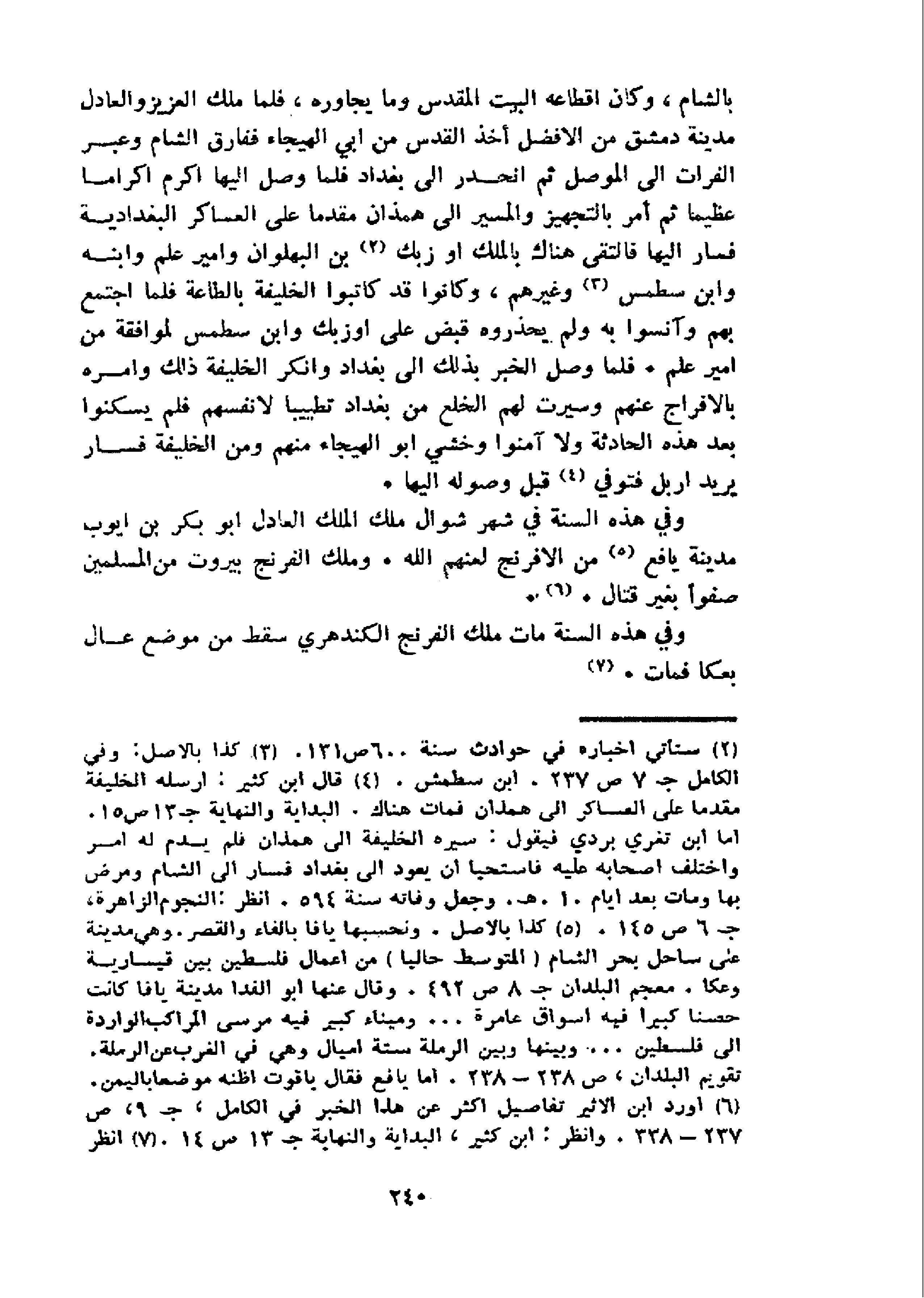 و في هذه السنة في شهر شوال ملك الملك العادل ابو بكر بن ايوب مدينة يافع 5 من الافرنج لعنهم الله. وملك الفرنج بيروت من المسلمين صفوا بغير قتال. 6.