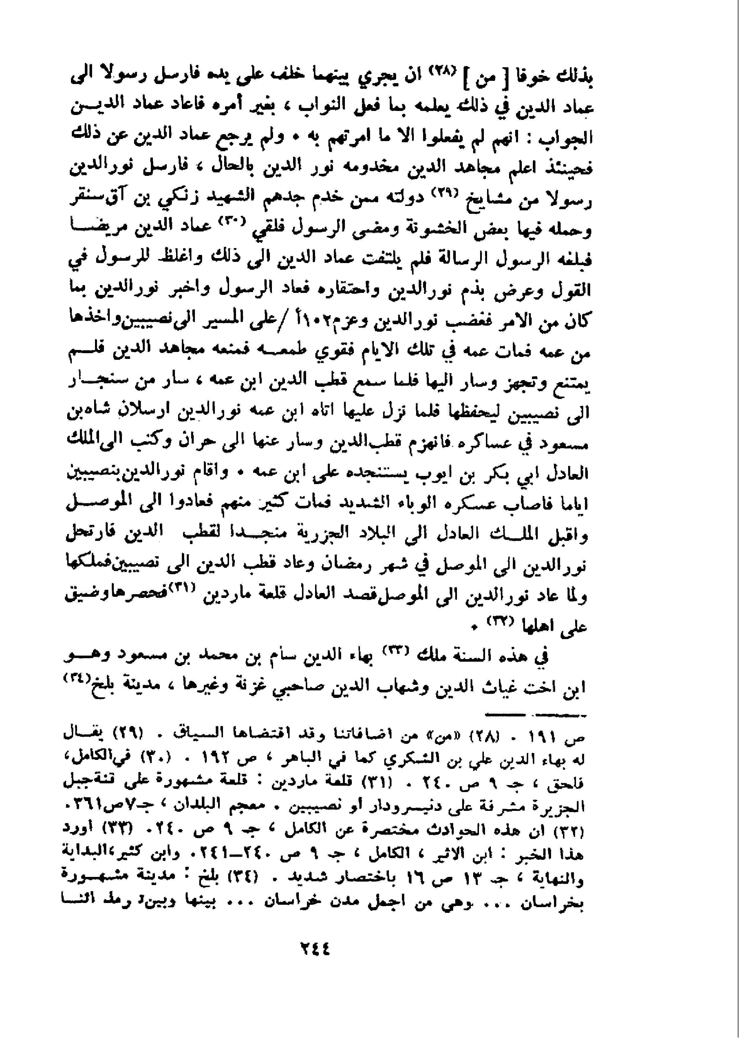 بذلك خوفا [من] 28 ان يجري بينهما خلف على يده فارسل رسولا الى عماد الدين في ذلك يعلمه بما فعل النواب، بغير أمره فاعاد عماد الدين الجواب: انهم لم يفعلوا الا ما امرتهم به. ولم يرجع عماد الدين عن ذلك فحينئذ اعلم مجاهد الدين مخدومه نور الدين بالحال، فارسل نور الدين رسولا من مشايخ 29 دولته ممن خدم جدهم الشهيد زنكي بن آق سنقر وحمله فيها بعض الخشونة ومضى الرسول فلقي 30 عماد الدين مريضا فبلغه الرسول الرسالة فلم يلتفت عماد الدين الى ذلك واغلظ للرسول في القول وعرض بذم نور الدين واحتقاره فعاد الرسول واخبر نور الدين بما كان من الامر فغضب نور الدين وعزم 102 أ/على المسير الى نصيبين واخذها من عمه فمات عمه في تلك الايام فقوي طمعه فمنعه مجاهد الدين فلم يمتنع وتجهز وسار اليها فلما سمع قطب الدين ابن عمه، سار من سنجار الى نصيبين ليحفظها فلما نزل عليها اتاه ابن عمه نور الدين ارسلان شاه بن مسعود في عساكره فانهزم قطب الدين وسار عنها الى حران وكتب الى الملك العادل ابي بكر بن ايوب يستنجده على ابن عمه. واقام نور الدين بنصيبين اياما فاصاب عسكره الوباء الشديد فمات كثير منهم فعادوا الى الموصل واقبل الملك العادل الى البلاد الجزرية منجدا لقطب الدين فارتحل نور الدين الى الموصل في شهر رمضان وعاد قطب الدين الى نصيبين فملكها ولما عاد نور الدين الى الموصل قصد العادل قلعة ماردين 31 فحصرها وضيق على اهلها 32.