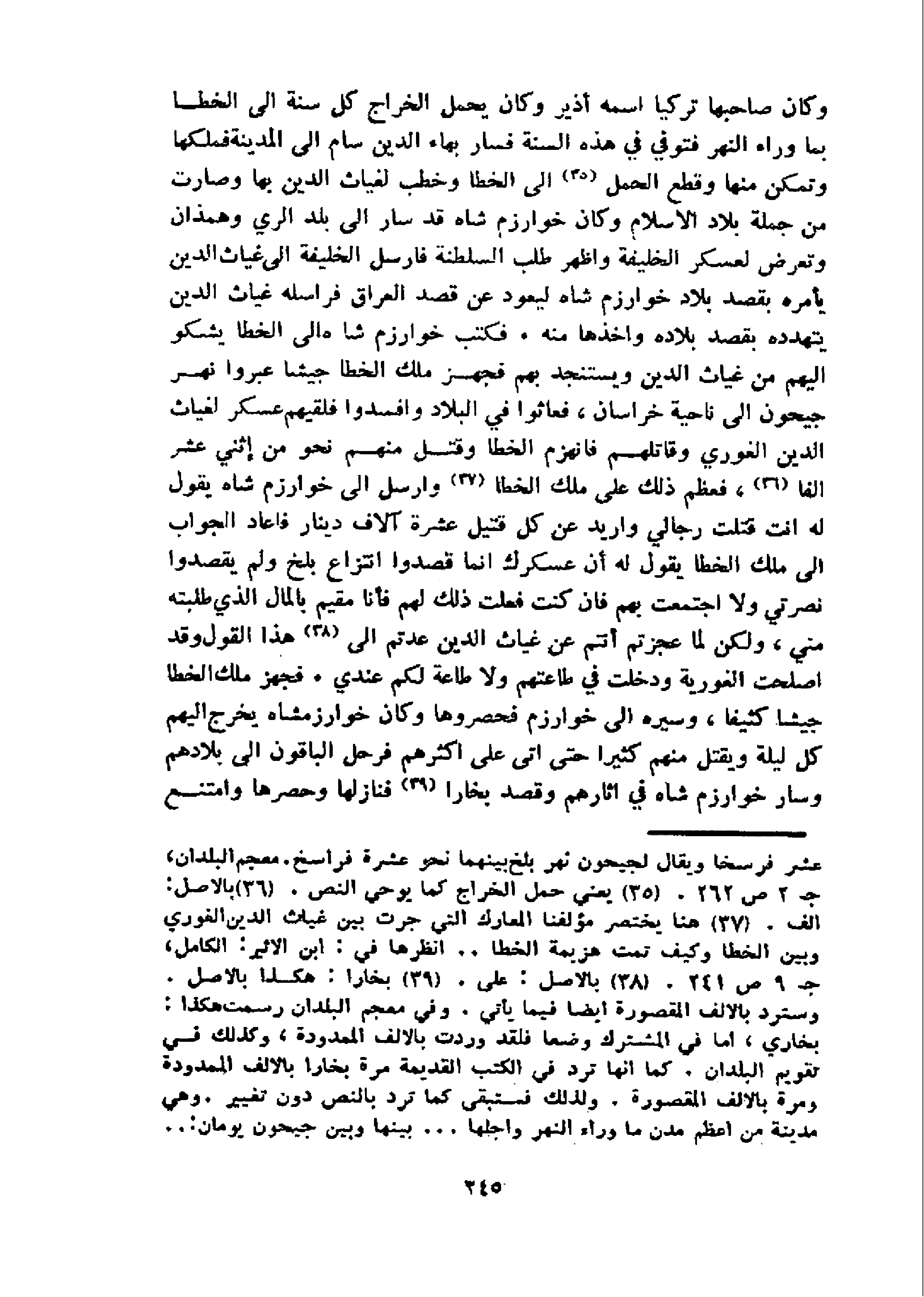 و كان صاحبها تركيا اسمه أذير وكان يحمل الخراج كل سنة الى الخطا بما وراء النهر فتوفي في هذه السنة فسار بهاء الدين سام الى المدينة فملكها وتمكن منها وقطع الحمل 35 الى الخطا وخطب لغياث الدين بها وصارت من جملة بلاد الاسلام وكان خوارزم شاه قد سار الى بلد الري وهمذان وتعرض لعسكر الخليفة واظهر طلب السلطنة فارسل الخليفة الى غياث الدين يأمره يقصد بلاد خوارزم شاه ليعود عن قصد العراق فراسله غياث الدين يتهدده بقصد بلاده واخذها منه. فكتب خوارزم شاه الى الخطا يشكو اليهم من غياث الدين ويستنجد بهم فجهز ملك الخطا جيشا عبروا نهر جيحون الى ناحية خراسان، فعاثوا في البلاد وافسدوا فلقيهم عسكر لغياث الدين الغوري وقاتلهم فانهزم الخطا وقتل منهم نحو من إثني عشر الفا 36، فعظم ذلك على ملك الخطا 37 و ارسل الى خوارزم شاه يقول له انت قتلت رجالي واريد عن كل قتيل عشرة آلاف دينار فاعاد الجواب الى ملك الخطا يقول له أن عسكرك انما قصدوا انتزاع بلخ ولم يقصدوا نصرتي ولا اجتمعت بهم فان كنت فعلت ذلك لهم فأنا مقيم بالمال الذي طلبته مني، ولكن لما عجزتم أنتم عن غياث الدين عدتم الى 38 هذا القول وقد اصلحت الغورية ودخلت في طاعتهم ولا طاعة لكم عندي. فجهز ملك الخطا جيشا كثيفا، وسيره الى خوارزم فحصروها وكان خوارزمشاه يخرج اليهم كل ليلة ويقتل منهم كثيرا حتى اتى على اكثرهم فرحل الباقون الى بلادهم وسار خوارزم شاه في اثارهم وقصد بخارا 39 فنازلها وحصرها وامتنع