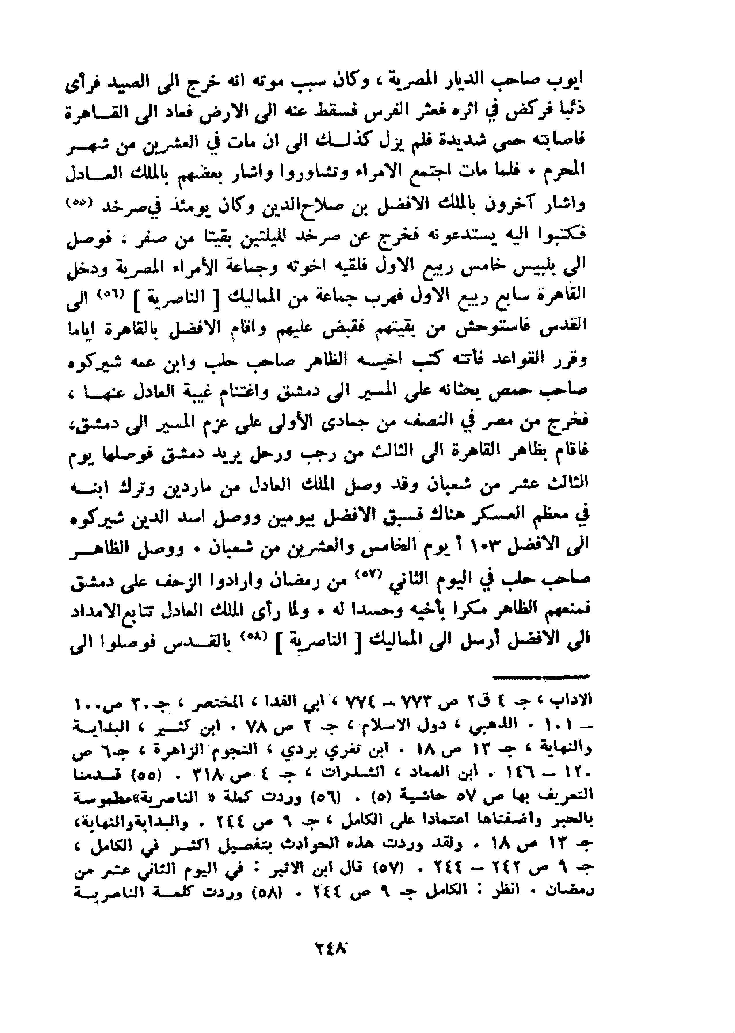ايوب صاحب الديار المصرية، وكان سبب موته انه خرج الى الصيد فرأى ذئبا فركض في اثره فعثر الفرس فسقط عنه الى الارض فعاد الى القاهرة فاصابته حمى شديدة فلم يزل كذلك الى ان مات في العشرين من شهر المحرم. فلما مات اجتمع الامراء وتشاوروا واشار بعضهم بالملك العادل واشار آخرون بالملك الافضل بن صلاح الدين وكان يومئذ في صرخد 55 فكتبوا اليه يستدعونه فخرج عن صرخد لليلتين بقيتا من صفر، فوصل الى بلبيس خامس ربيع الاول فلقيه اخوته وجماعة الأمراء المصرية ودخل القاهرة سابع ربيع الاول فهرب جماعة من المماليك [الناصرية] 56 الى القدس فاستوحش من بقيتهم فقبض عليهم واقام الافضل بالقاهرة اياما وقرر القواعد فأتته كتب اخيه الظاهر صاحب حلب وابن عمه شيركوه صاحب حمص يحثانه على المسير الى دمشق واغتنام غيبة العادل عنها، فخرج من مصر في النصف من جمادى الأولى على عزم المسير الى دمشق، فاقام بظاهر القاهرة الى الثالث من رجب ورحل يريد دمشق فوصلها يوم الثالث عشر من شعبان وقد وصل الملك العادل من ماردين وترك ابنه في معظم العسكر هناك فسبق الافضل بيومين ووصل اسد الدين شيركوه الى الافضل 103 أ يوم الخامس والعشرين من شعبان. ووصل الظاهر صاحب حلب في اليوم الثاني 57 من رمضان وارادوا الزحف على دمشق فمنعهم الظاهر مكرا بأخيه وحسدا له. ولما رأى الملك العادل تتابع الامداد الى الافضل أرسل الى المماليك [الناصرية] 58 بالقدس فوصلوا الى