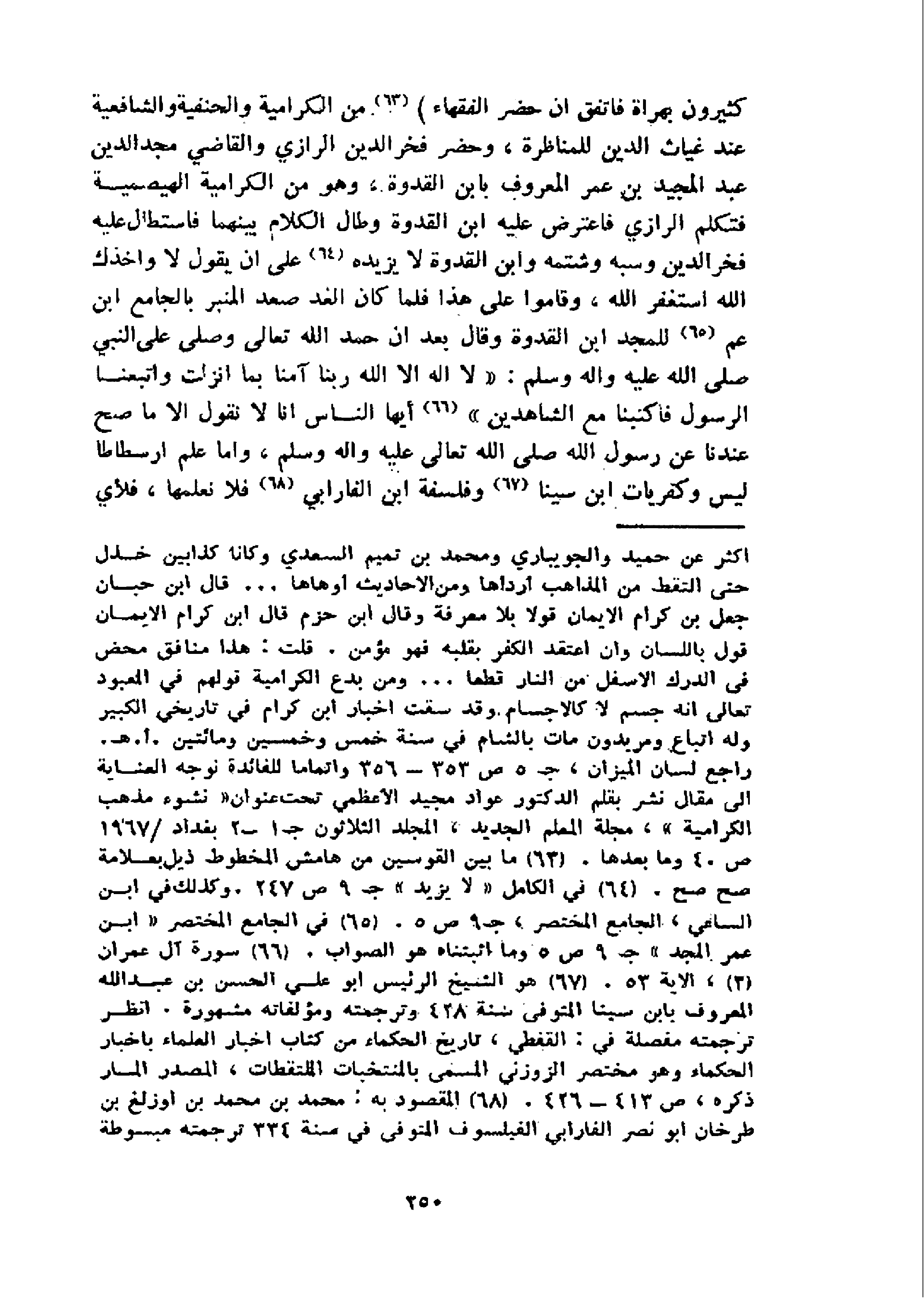 كثيرون بهراة فاتفق ان حضر الفقهاء) 63 من الكرامية والحنفية والشافعية عند غياث الدين للمناظرة، وحضر فخر الدين الرازي والقاضي مجد الدين عبد المجيد بن عمر المعروف بابن القدوة، وهو من الكرامية الهيصمية فتكلم الرازي فاعترض عليه ابن القدوة وطال الكلام بينهما فاستطال عليه فخر الدين وسبه وشتمه وابن القدوة لا يزيده 64 على ان يقول لا واخذك الله استغفر الله، وقاموا على هذا فلما كان الغد صعد المنبر بالجامع ابن عم 65 للمجد ابن القدوة وقال بعد ان حمد الله تعالى وصلى على النبي صلى الله عليه واله وسلم: «لا اله الا الله رَبَّنا آمَنّا بِما أَنْزَلْتَ وَ اِتَّبَعْنَا اَلرَّسُولَ فَاكْتُبْنا مَعَ اَلشّاهِدِينَ» 66 أيها الناس انا لا نقول الا ما صح عندنا عن رسول الله صلى الله تعالى عليه واله وسلم، واما علم ارسطاطا ليس وكفريات ابن سينا 67 و فلسفة ابن الفارابي 68 فلا نعلمها، فلأي
