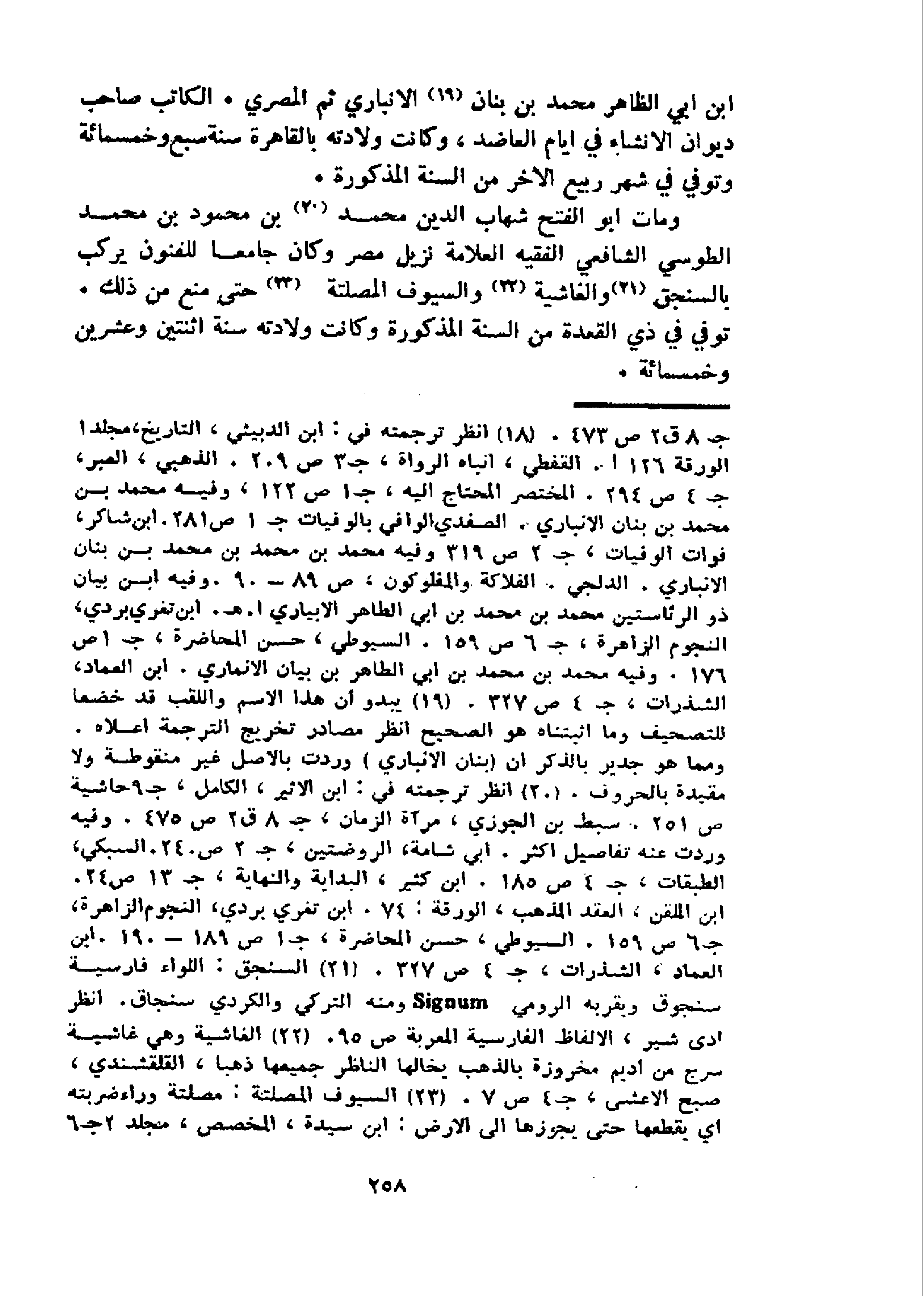و مات ابو الفتح شهاب الدين محمد 20 بن محمود بن محمد الطوسي الشافعي الفقيه العلامة نزيل مصر وكان جامعا للفنون يركب بالسنجق 21 و الغاشية 22 و السيوف المصلتة 23 حتى منع من ذلك.