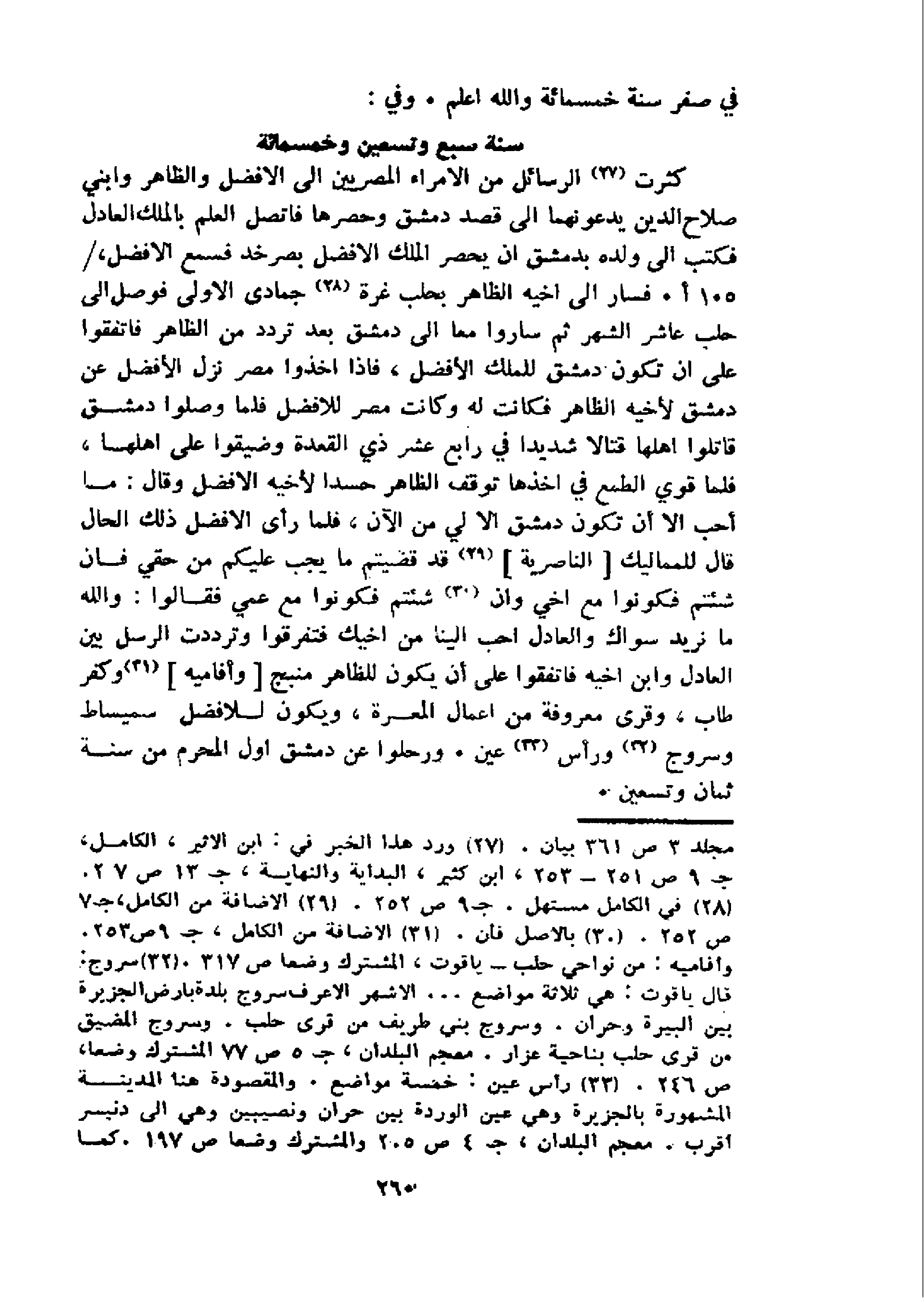كثرت 27 الرسائل من الامراء المصريين الى الافضل والظاهر وابني صلاح الدين يدعونهما الى قصد دمشق وحصرها فاتصل العلم بالملك العادل فكتب الى ولده بدمشق ان يحصر الملك الافضل بصرخد فسمع الافضل، / 105 أ. فسار الى اخيه الظاهر بحلب غرة 28 جمادى الاولى فوصل الى حلب عاشر الشهر ثم ساروا معا الى دمشق بعد تردد من الظاهر فاتفقوا على ان تكون دمشق للملك الأفضل، فاذا اخذوا مصر نزل الأفضل عن دمشق لأخيه الظاهر فكانت له وكانت مصر للافضل فلما وصلوا دمشق قاتلوا اهلها قتالا شديدا في رابع عشر ذي القعدة وضيقوا على اهلها، فلما قوي الطمع في اخذها توقف الظاهر حسدا لأخيه الافضل وقال: ما أحب الا أن تكون دمشق الا لي من الآن، فلما رأى الافضل ذلك الحال قال للمماليك [الناصرية] 29 قد قضيتم ما يجب عليكم من حقي فان شئتم فكونوا مع اخي وان 30 شئتم فكونوا مع عمي فقالوا: والله ما نريد سواك والعادل احب الينا من اخيك فتفرقوا وترددت الرسل بين العادل وابن اخيه فاتفقوا على أن يكون للظاهر منبج [و أفاميه] 31 و كفر طاب، وقرى معروفة من اعمال المعرة، ويكون للافضل سميساط وسروج 32 و رأس 33 عين. ورحلوا عن دمشق اول المحرم من سنة ثمان وتسعين.
