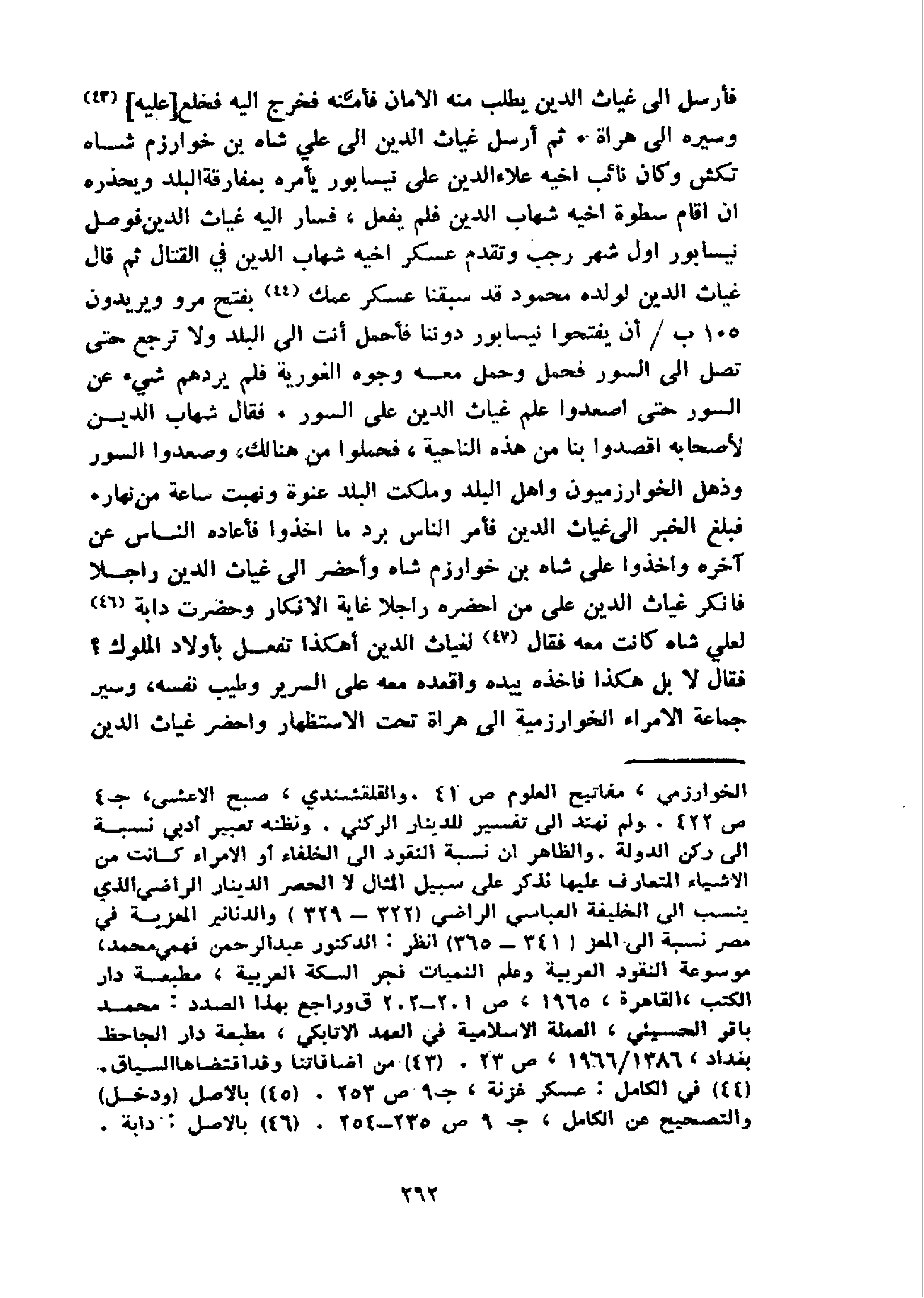 و فبلغ الخبر الى غياث الدين فأمر الناس برد ما اخذوا فأعاده الناس عن آخره واخذوا على شاه بن خوارزمشاه وأحضر الى غياث الدين راجلا فانكر غياث الدين على من احضره راجلا غاية الانكار وحضرت دابة 46 لعلي شاه كانت معه فقال 47 لغياث الدين أهكذا تفعل بأولاد الملوك؟