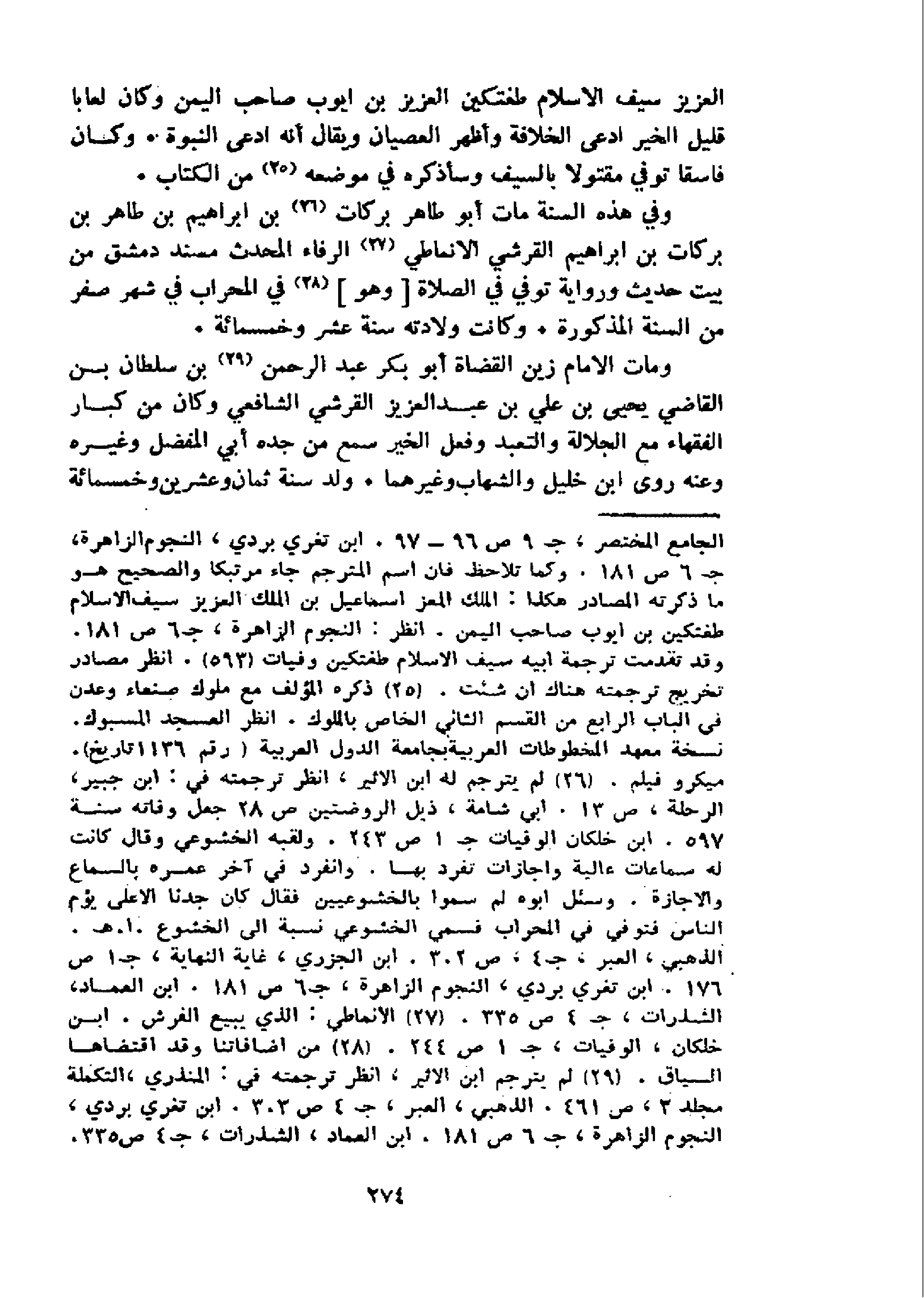 و في هذه السنة مات أبو طاهر بركات 26 بن ابراهيم بن طاهر بن بركات بن ابراهيم القرشي الانماطي 27 الرفاء المحدث مسند دمشق من بيت حديث ورواية توفي في الصلاة [و هو] 28 في المحراب في شهر صفر من السنة المذكورة. وكانت ولادته سنة عشر وخمسمائة.