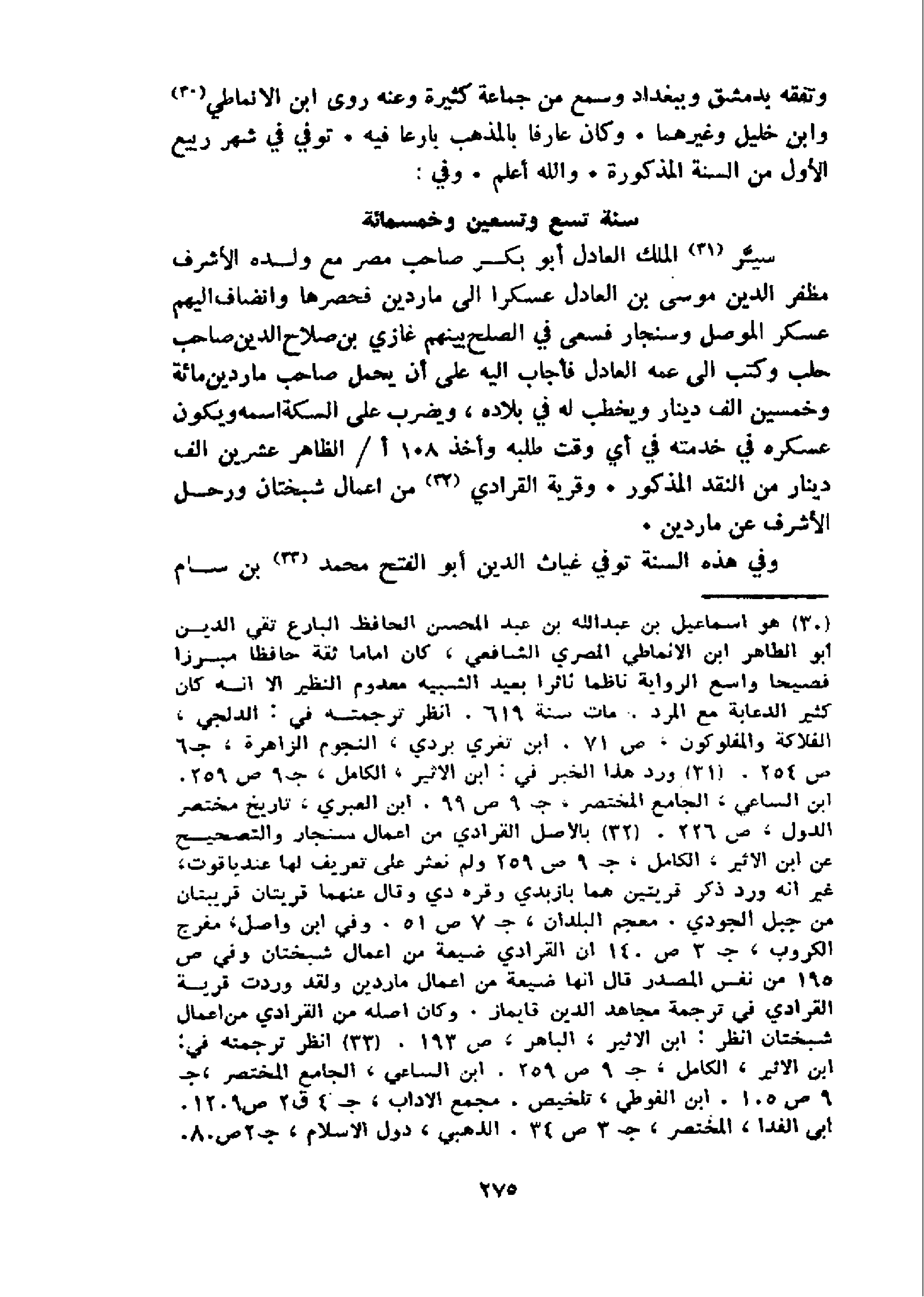 سيّر 31 الملك العادل أبو بكر صاحب مصر مع ولده الأشرف مظفر الدين موسى بن العادل عسكرا الى ماردين فحصرها وانضاف اليهم عسكر الموصل وسنجار فسعى في الصلح بينهم غازي بن صلاح الدين صاحب حلب وكتب الى عمه العادل فأجاب اليه على أن يحمل صاحب ماردين مائة وخمسين الف دينار ويخطب له في بلاده، ويضرب على السكة اسمه ويكون عسكره في خدمته في أي وقت طلبه وأخذ 108 أ/الظاهر عشرين الف دينار من النقد المذكور. وقرية القرادي 32 من اعمال شبختان ورحل الأشرف عن ماردين.