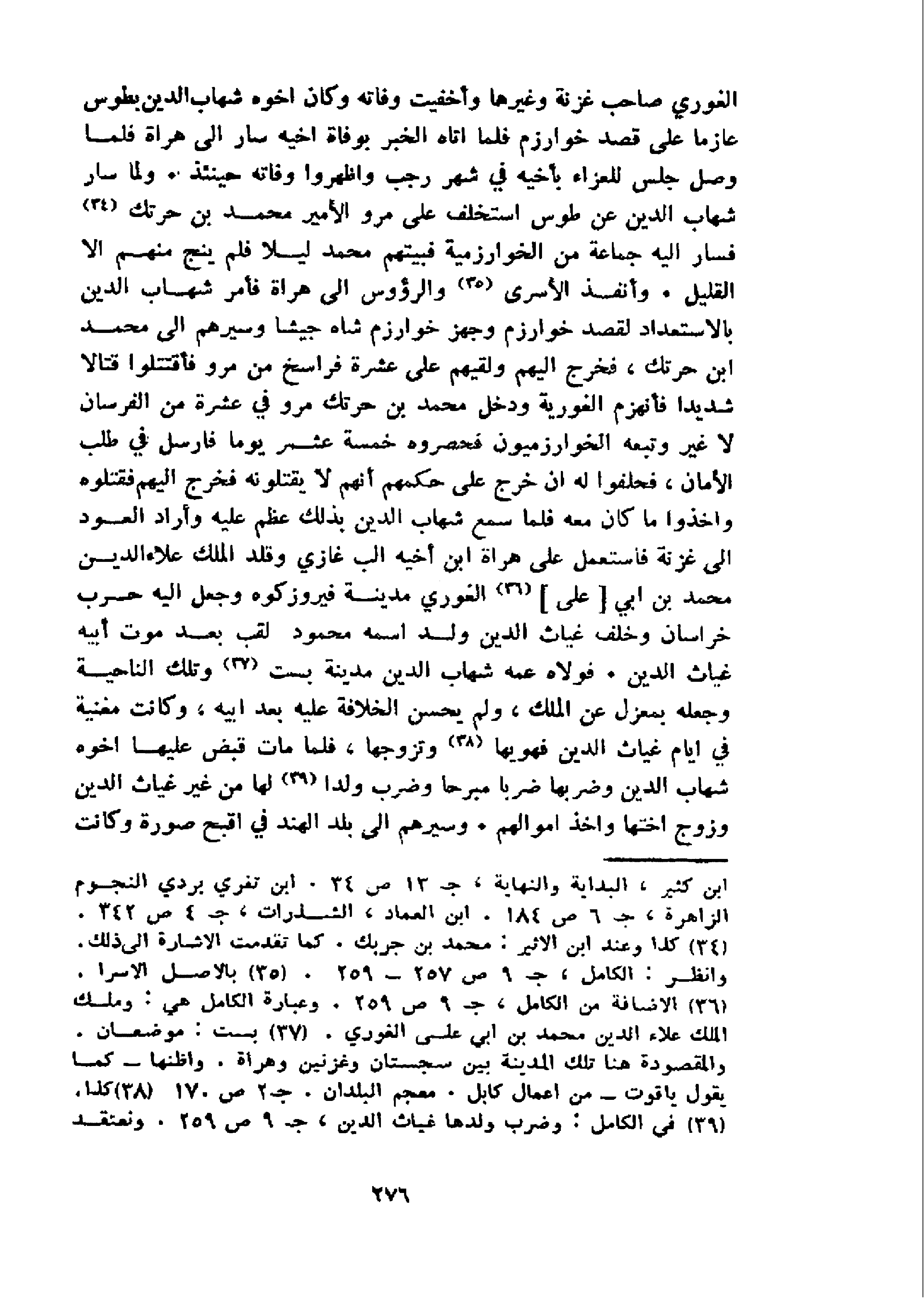 الغوري صاحب غزنة وغيرها وأخفيت وفاته وكان اخوه شهاب الدين بطوس عازما على قصد خوارزم فلما اتاه الخبر بوفاة اخيه سار الى هراة فلما وصل جلس للعزاء بأخيه في شهر رجب واظهروا وفاته حينئذ. ولما سار شهاب الدين عن طوس استخلف على مرو الأمير محمد بن حرتك 34 فسار اليه جماعة من الخوارزمية فبيتهم محمد ليلا فلم ينج منهم الا القليل. وأنفذ الأسرى 35 و الرؤوس الى هراة فأمر شهاب الدين بالاستعداد لقصد خوارزم وجهز خوارزم شاه جيشا وسيرهم الى محمد ابن حرتك، فخرج اليهم ولقيهم على عشرة فراسخ من مرو فأقتتلوا قتالا شديدا فأنهزم الغورية ودخل محمد بن حرتك مرو في عشرة من الفرسان لا غير وتبعه الخوارزميون فحصروه خمسة عشر يوما فارسل في طلب الأمان، فحلفوا له ان خرج على حكمهم أنهم لا يقتلونه فخرج اليهم فقتلوه واخذوا ما كان معه فلما سمع شهاب الدين بذلك عظم عليه وأراد العود الى غزنة فاستعمل على هراة ابن أخيه الب غازي وقلد الملك علاء الدين محمد بن ابي [على] 36 الغوري مدينة فيروزكوه وجعل اليه حرب خراسان وخلف غياث الدين ولد اسمه محمود لقب بعد موت أبيه غياث الدين. فولاه عمه شهاب الدين مدينة بست 37 و تلك الناحية وجعله بمعزل عن الملك، ولم يحسن الخلافة عليه بعد ابيه، وكانت مغنية في ايام غياث الدين فهويها 38 و تزوجها، فلما مات قبض عليها اخوه شهاب الدين وضربها ضربا مبرحا وضرب ولدا 39 لها من غير غياث الدين وزوج اختها واخذ اموالهم. وسيرهم الى بلد الهند في اقبح صورة وكانت