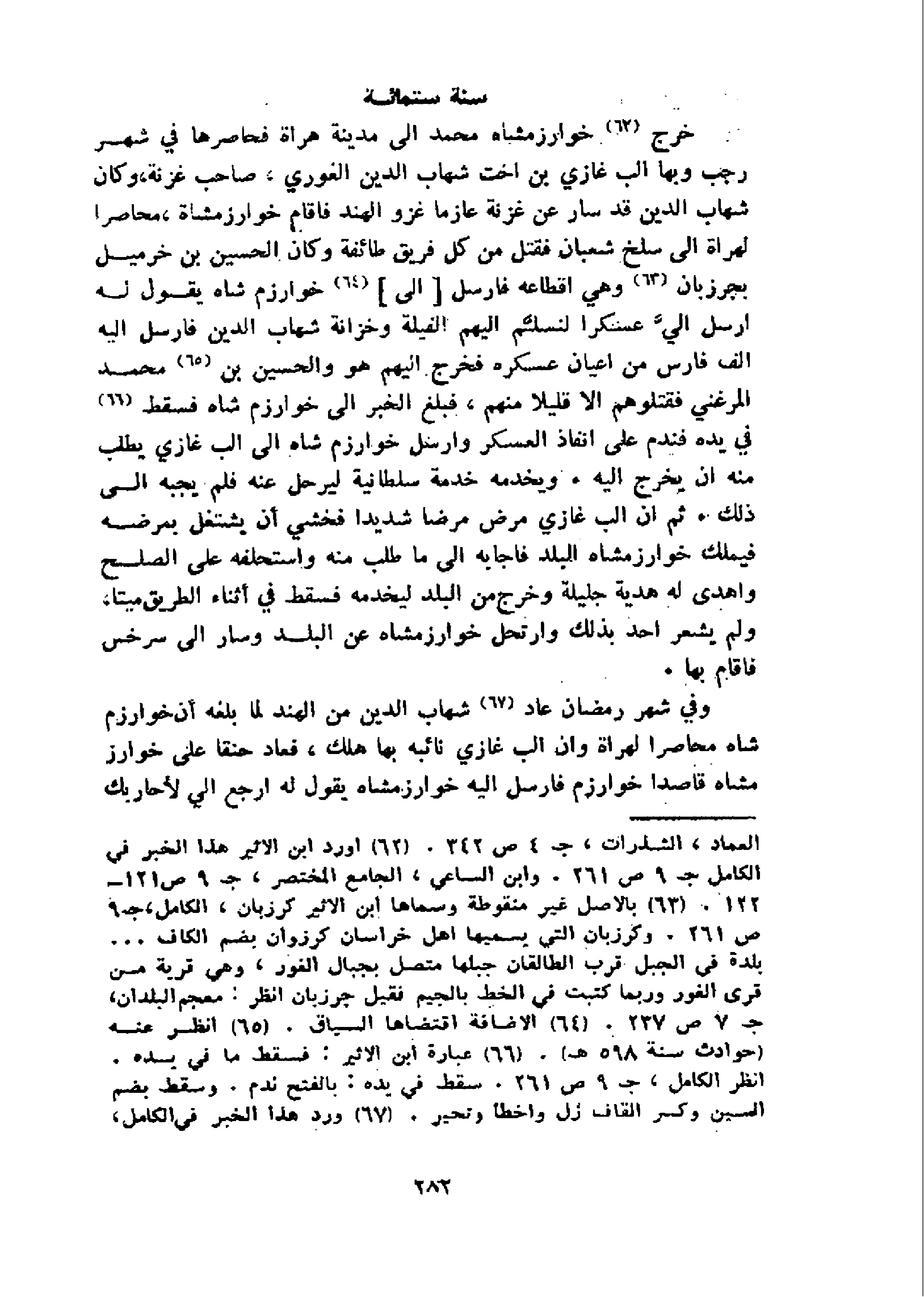 خرج 62 خوارزمشاه محمد الى مدينة هراة فحاصرها في شهر رجب وبها الب غازي بن اخت شهاب الدين الغوري، صاحب غزنة، وكان شهاب الدين قد سار عن غزنة عازما غزو الهند فاقام خوارزمشاة، محاصرا لهراة الى سلخ شعبان فقتل من كل فريق طائفة وكان الحسين بن خرميل بجرزبان 63 و هي اقطاعه فارسل [الى] 64 خوارزم شاه يقول له ارسل اليّ عسكرا لنسلّم اليهم الفيلة وخزانة شهاب الدين فارسل اليه الف فارس من اعيان عسكره فخرج اليهم هو والحسين بن 65 محمد المرغني فقتلوهم الا قليلا منهم، فبلغ الخبر الى خوارزم شاه فسقط 66 في يده فندم على انفاذ العسكر وارسل خوارزم شاه الى الب غازي يطلب منه ان يخرج اليه. ويخدمه خدمة سلطانية ليرحل عنه فلم يجبه الى ذلك. ثم ان الب غازي مرض مرضا شديدا فخشي أن يشتغل بمرضه فيملك خوارزمشاه البلد فاجابه الى ما طلب منه واستحلفه على الصلح واهدى له هدية جليلة وخرج من البلد ليخدمه فسقط في أثناء الطريق ميتا، ولم يشعر احد بذلك وارتحل خوارزمشاه عن البلد وسار الى سرخس فاقام بها.
