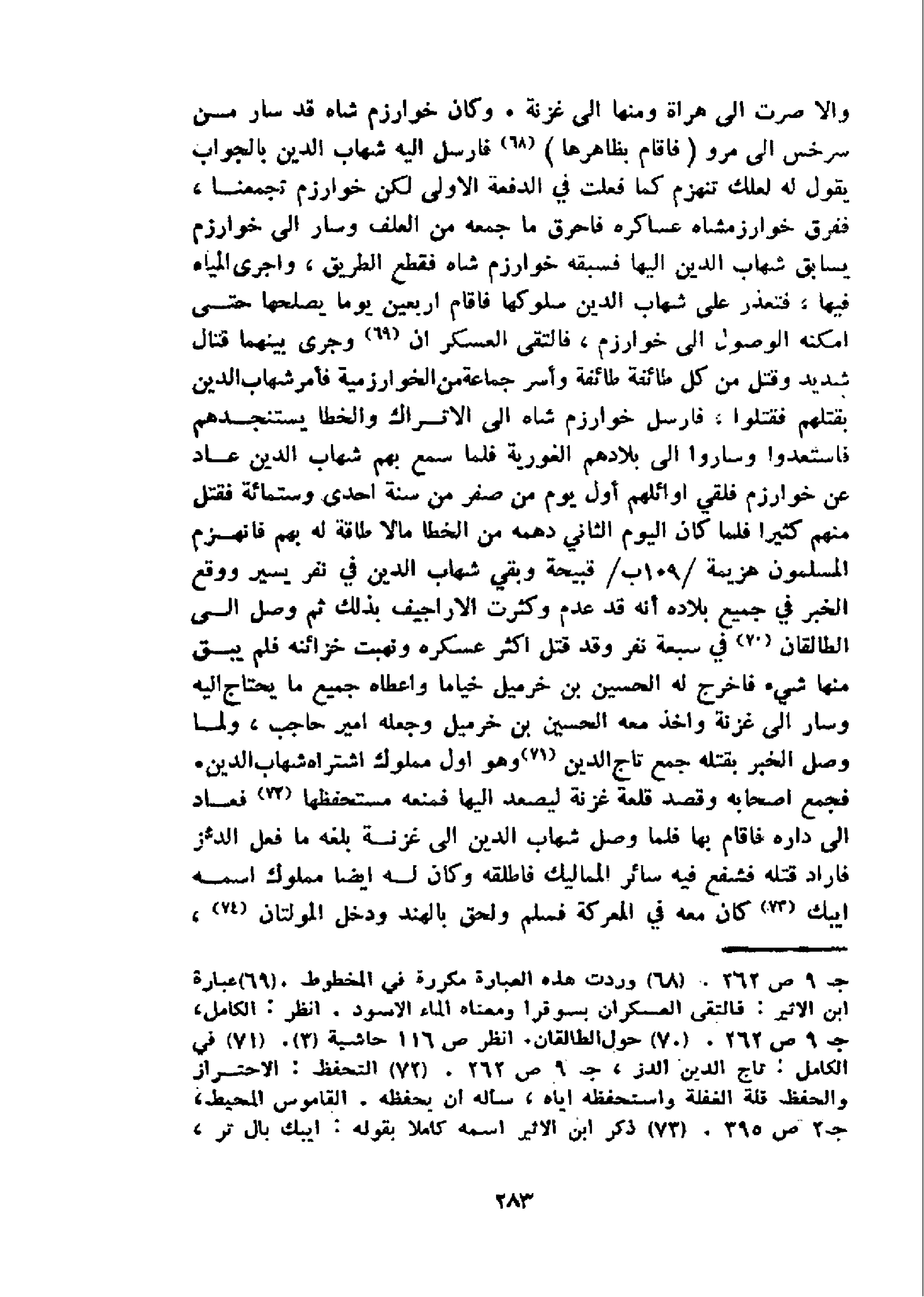 و الا صرت الى هراة ومنها الى غزنة. وكان خوارزم شاه قد سار من سرخس الى مرو (فاقام بظاهرها) 68 فارسل اليه شهاب الدين بالجواب يقول له لعلك تنهزم كما فعلت في الدفعة الاولى لكن خوارزم تجمعنا، ففرق خوارزمشاه عساكره فاحرق ما جمعه من العلف وسار الى خوارزم يسابق شهاب الدين اليها فسبقه خوارزم شاه فقطع الطريق، واجرى المياه فيها، فتعذر على شهاب الدين سلوكها فاقام اربعين يوما يصلحها حتى امكنه الوصول الى خوارزم، فالتقى العسكران 69 و جرى بينهما قتال شديد وقتل من كل طائفة طائفة وأسر جماعة من الخوارزمية فأمر شهاب الدين بقتلهم فقتلوا، فارسل خوارزم شاه الى الاتراك والخطا يستنجدهم فاستعدوا وساروا الى بلادهم الغورية فلما سمع بهم شهاب الدين عاد عن خوارزم فلقي اوائلهم أول يوم من صفر من سنة احدى وستمائة فقتل منهم كثيرا فلما كان اليوم الثاني دهمه من الخطا ما لا طاقة له بهم فانهزم المسلمون هزيمة 109 / ب/قبيحة وبقي شهاب الدين في نفر يسير ووقع الخبر في جميع بلاده أنه قد عدم وكثرت الاراجيف بذلك ثم وصل الى الطالقان 70 في سبعة نفر وقد قتل اكثر عسكره ونهبت خزائنه فلم يبق منها شيء فاخرج له الحسين بن خرميل خياما واعطاه جميع ما يحتاج اليه وسار الى غزنة واخذ معه الحسين بن خرميل وجعله امير حاجب، ولما وصل الخبر بقتله جمع تاج الدين 71 و هو اول مملوك اشتراه شهاب الدين.