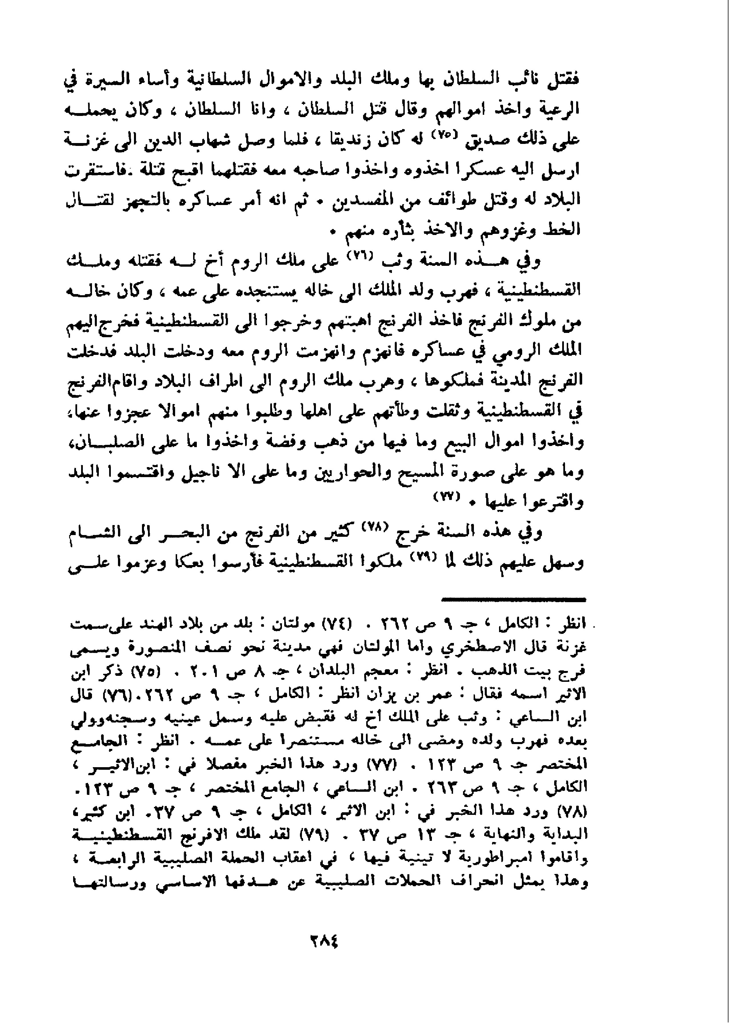 و في هذه السنة وثب 76 على ملك الروم أخ له فقتله وملك القسطنطينية، فهرب ولد الملك الى خاله يستنجده على عمه، وكان خاله من ملوك الفرنج فاخذ الفرنج اهبتهم وخرجوا الى القسطنطينية فخرج اليهم الملك الرومي في عساكره فانهزم وانهزمت الروم معه ودخلت البلد فدخلت الفرنج المدينة فملكوها، وهرب ملك الروم الى اطراف البلاد واقام الفرنج في القسطنطينية وثقلت وطأتهم على اهلها وطلبوا منهم اموالا عجزوا عنها، واخذوا اموال البيع وما فيها من ذهب وفضة واخذوا ما على الصلبان، وما هو على صورة المسيح والحواريين وما على الا ناجيل واقتسموا البلد واقترعوا عليها. 77