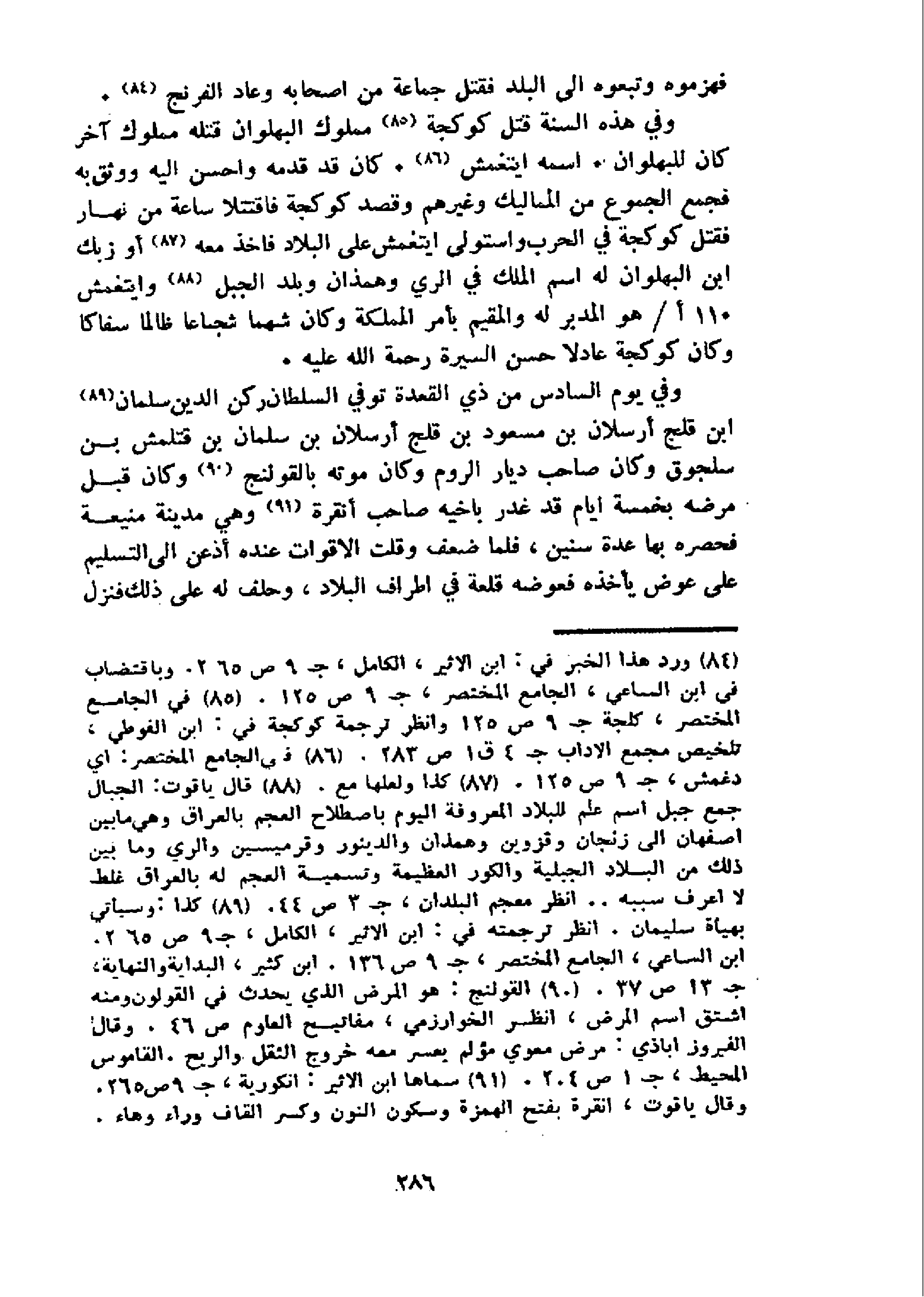 و في يوم السادس من ذي القعدة توفي السلطان ركن الدين سلمان 89 ابن قلج أرسلان بن مسعود بن قلج أرسلان بن سلمان بن قتلمش بن سلجوق وكان صاحب ديار الروم وكان موته بالقولنج 90 و كان قبل مرضه بخمسة ايام قد غدر باخيه صاحب أنقرة 91 و هي مدينة منيعة فحصره بها عدة سنين، فلما ضعف وقلت الاقوات عنده أذعن الى التسليم على عوض يأخذه فعوضه قلعة في اطراف البلاد، وحلف له على ذلك فنزل