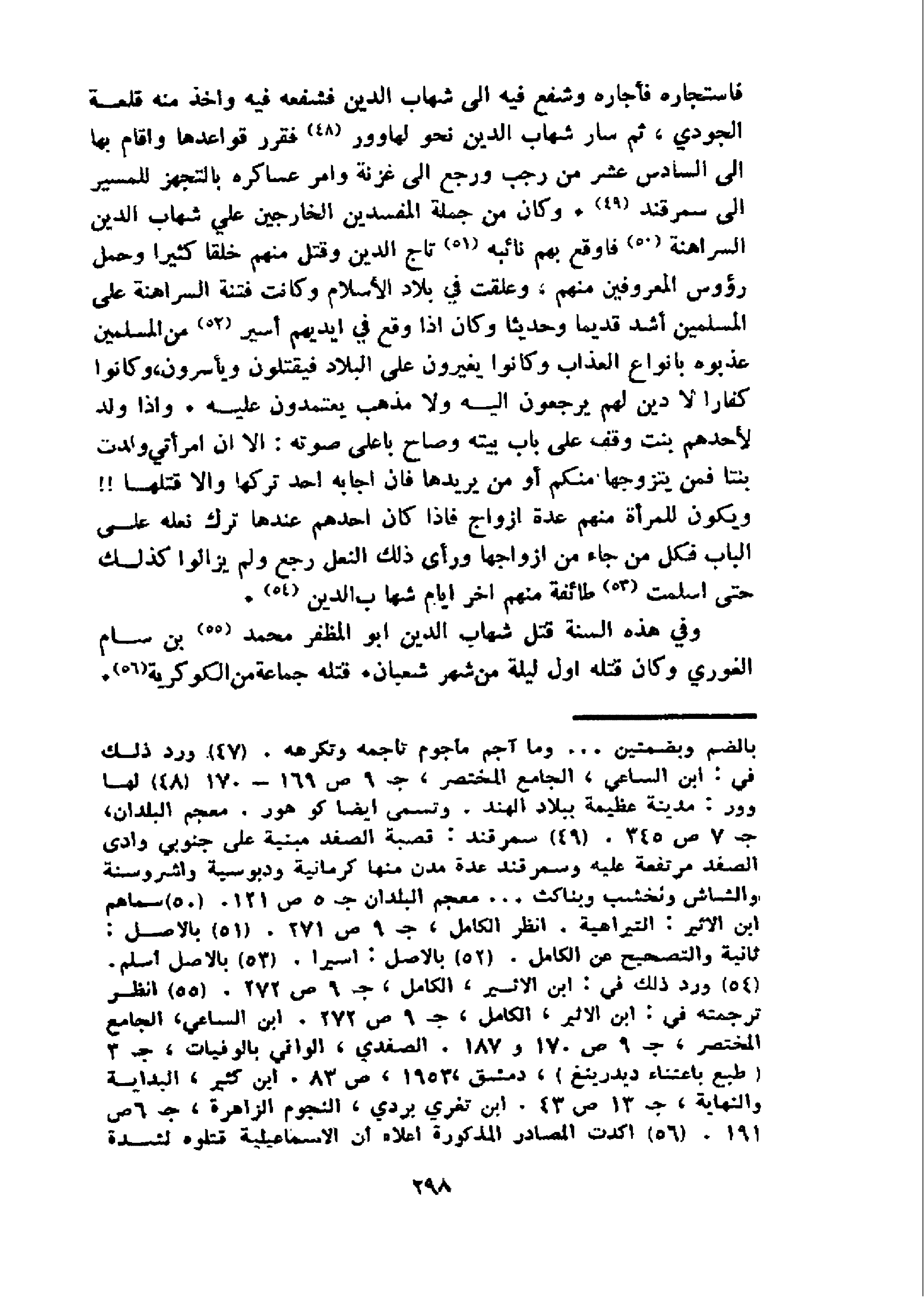فاستجاره فأجاره وشفع فيه الى شهاب الدين فشفعه فيه واخذ منه قلعة الجودي، ثم سار شهاب الدين نحو لهاوور 48 فقرر قواعدها واقام بها الى السادس عشر من رجب ورجع الى غزنة وامر عساكره بالتجهز للمسير الى سمرقند 49.و كان من جملة المفسدين الخارجين علي شهاب الدين السراهنة 50 فاوقع بهم نائبه 51 تاج الدين وقتل منهم خلقا كثيرا وحمل رؤوس المعروفين منهم، وعلقت في بلاد الأسلام وكانت فتنة السراهنة على المسلمين أشد قديما وحديثا وكان اذا وقع في ايديهم أسير 52 من المسلمين عذبوه بانواع العذاب وكانوا يغيرون على البلاد فيقتلون ويأسرون، وكانوا كفارا لا دين لهم يرجعون اليه ولا مذهب يعتمدون عليه. واذا ولد لأحدهم بنت وقف على باب بيته وصاح باعلى صوته: الا ان امرأتي ولدت بنتا فمن يتزوجها منكم أو من يريدها فان اجابه احد تركها والا قتلها!!