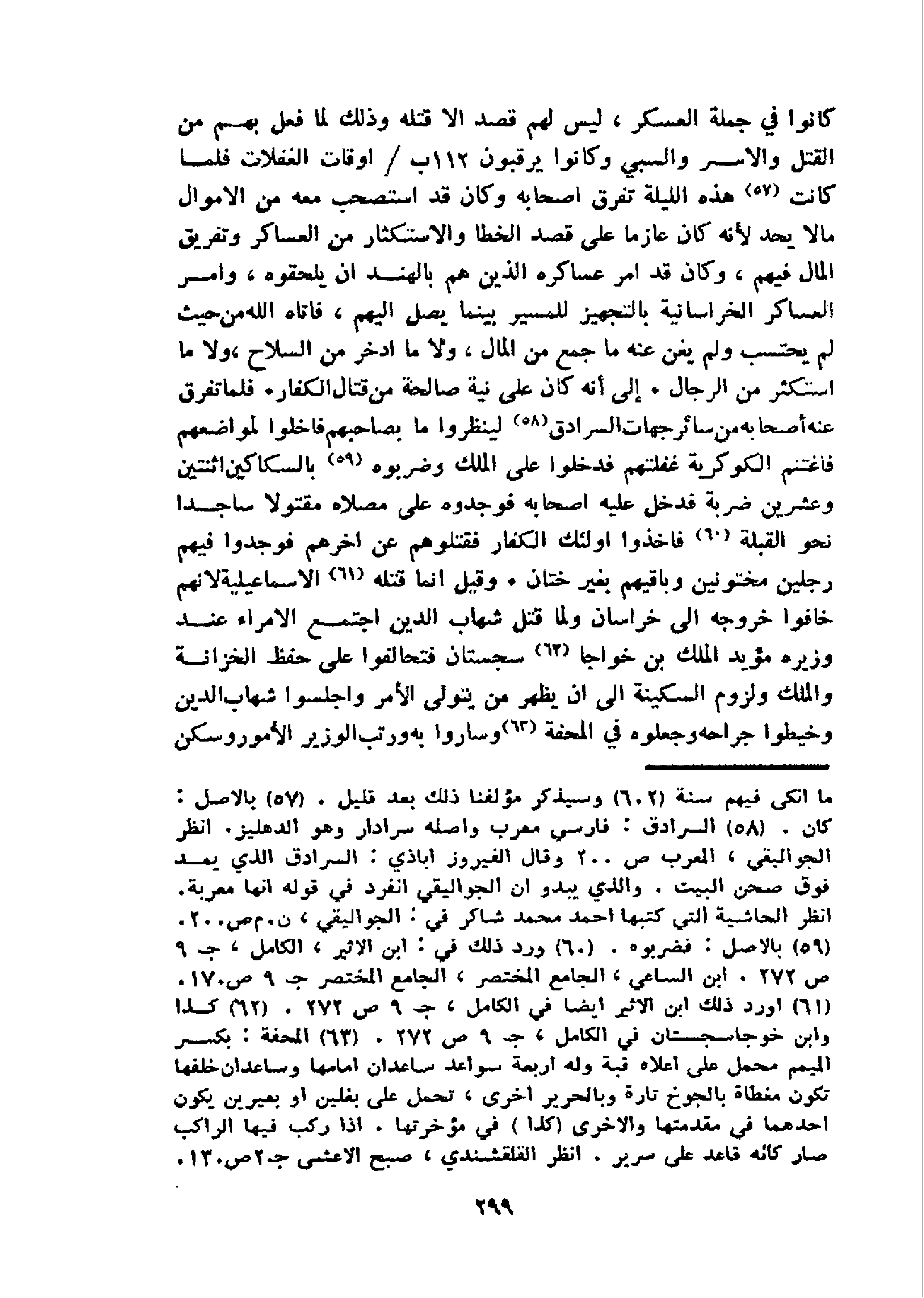 كانوا في جملة العسكر ليس لهم قصد إلا قتله؛ وذلك لما فعل بهم من القتل والأسر والسبي وكانوا يرقبون 112 ب/ أوقات الغفلات فلما كانت 57 هذه الليلة تفرق أصحابه وكان قد استصحب معه من الأموال ما لا يحد لأنه كان عازمًا على قصد الخطا والاستكثار من العساكر وتفريق المال فيهم، وكان قد أمر عساكره الذين هم بالهند أن يلحقوه، وأمر العساكر الخراسانية بالتجهيز للمسير بينما يصل إليهم، فأتاه الله من حيث لم يحتسب ولم يغن عنه ما جمع من المال، ولا ما ادخر من السلاح ولا ما استكثر من الرجال، إلى أن كان على نية صالحة من قتال الكفار، فلما تفرق عنه أصحابه من سائر جهات السرادق 58 لينظروا ما بصاحبهم فاخلوا لمواضعهم فاغتنم الكوكرية غفلتهم فدخلوا على الملك وضربوه 59 بالسكاكين اثنتين وعشرين ضربة فدخل عليه أصحابه فوجدوه على مصلاه مقتولا ساجدًا نحو القبلة 60 فأخذوا أولئك الكفار فقتلوهم عن آخرهم فوجدوا فيهم رجلين مختونين وباقيهم بغير ختان.