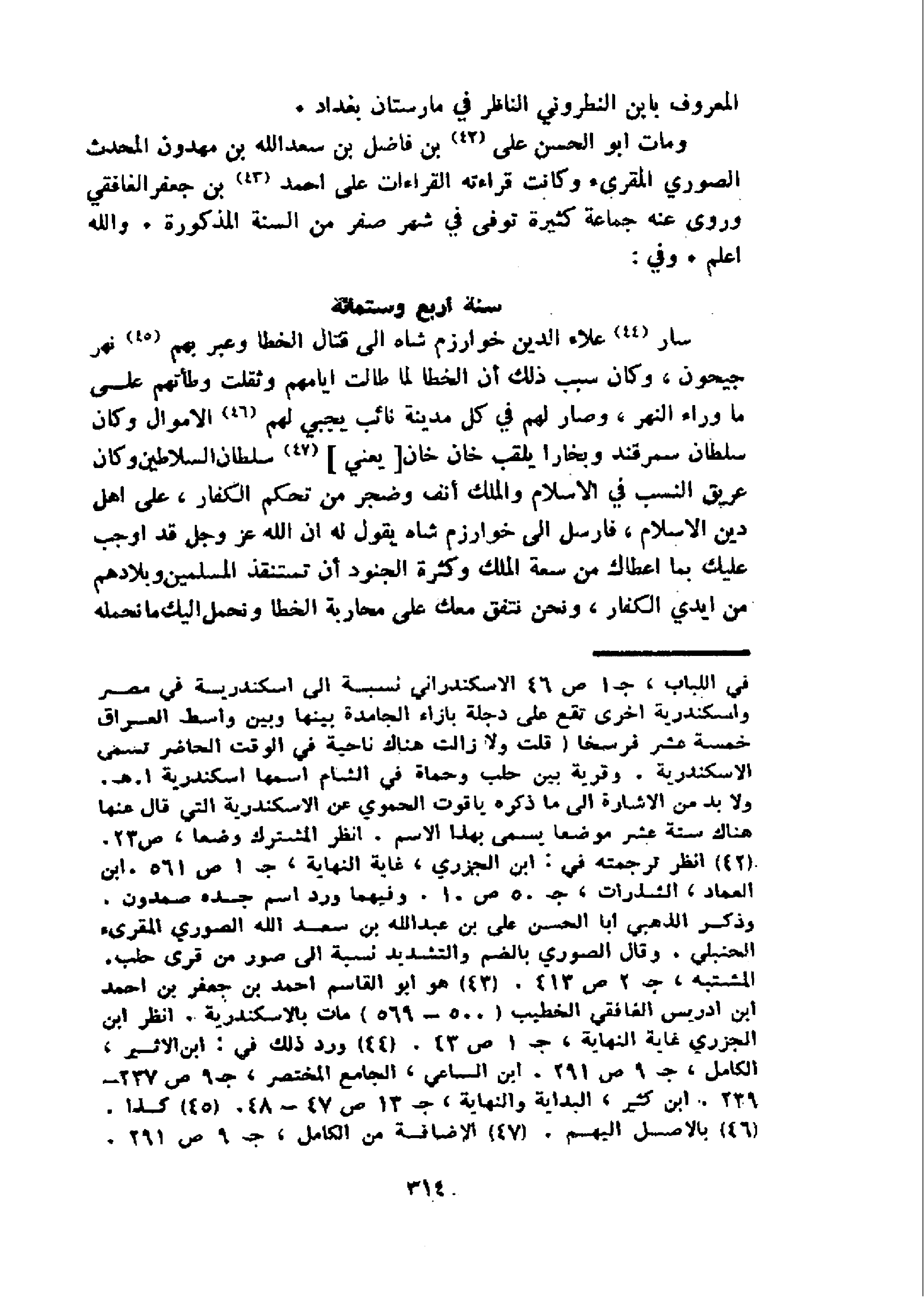 سار 44 علاء الدين خوارزم شاه الى قتال الخطا وعبر بهم 45 نهر جيحون، وكان سبب ذلك أن الخطا لما طالت ايامهم وثقلت وطأتهم على ماوراء النهر، وصار لهم في كل مدينة نائب يجبي لهم 46 الاموال وكان سلطان سمرقند وبخارا يلقب خان خان [يعني] 47 سلطان السلاطين وكان عريق النسب في الاسلام والملك أنف وضجر من تحكم الكفار، على اهل دين الاسلام، فارسل الى خوارزم شاه يقول له ان الله عز وجل قد اوجب عليك بما اعطاك من سعة الملك وكثرة الجنود أن تستنقذ المسلمين وبلادهم من ايدي الكفار، ونحن نتفق معك على محاربة الخطا ونحمل اليك ما نحمله