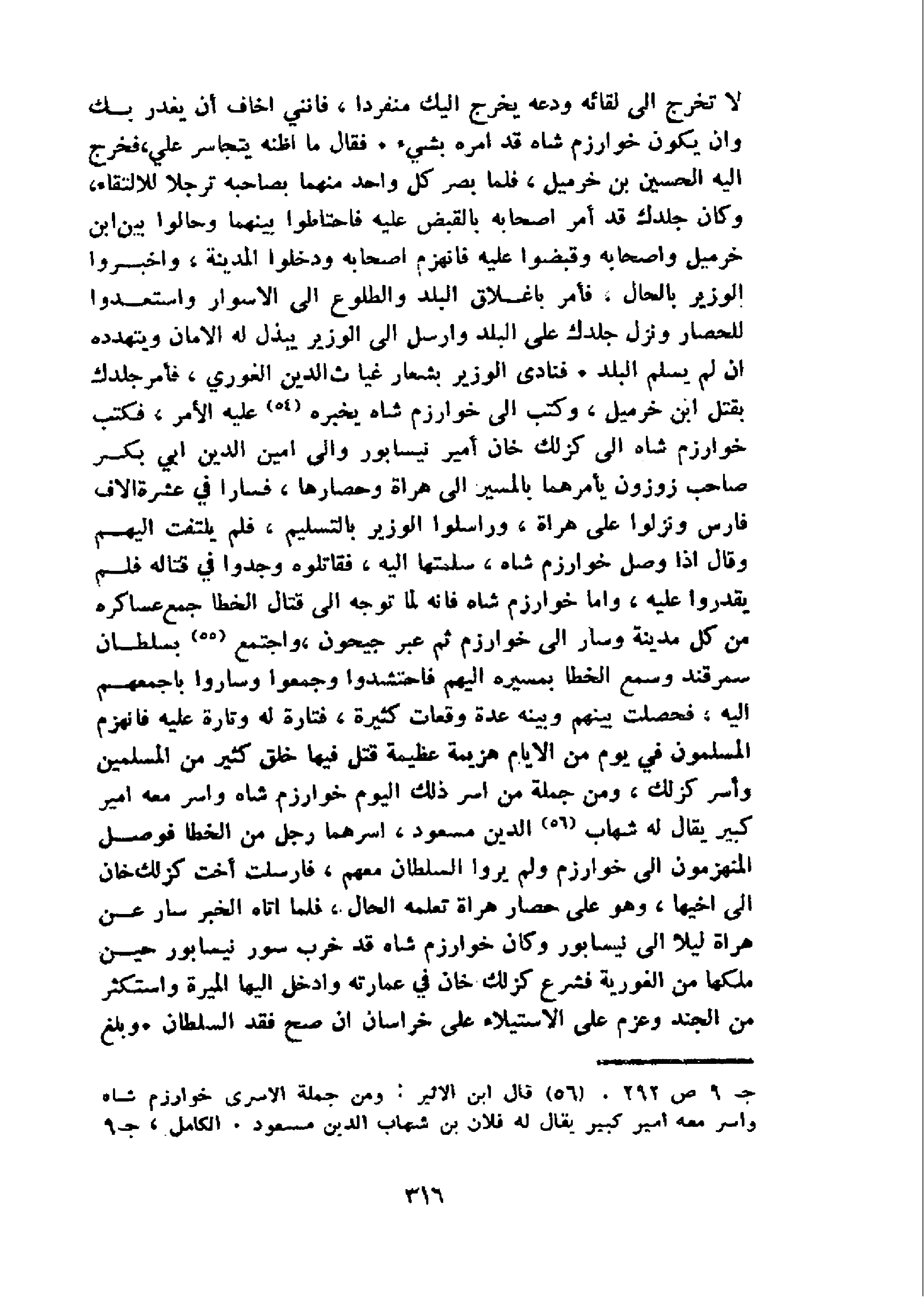 لا تخرج الى لقائه ودعه يخرج اليك منفردا، فانني اخاف أن يغدر بك وان يكون خوارزم شاه قد امره بشي ء. فقال ما اظنه يتجاسر علي، فخرج اليه الحسين بن خرميل، فلما بصر كل واحد منهما بصاحبه ترجلا للالتقاء، وكان جلدك قد أمر اصحابه بالقبض عليه فاحتاطوا بينهما وحالوا بين ابن خرميل واصحابه وقبضوا عليه فانهزم اصحابه ودخلوا المدينة، واخبروا الوزير بالحال، فأمر باغلاق البلد والطلوع الى الاسوار واستعدوا للحصار ونزل جلدك على البلد وارسل الى الوزير يبذل له الامان ويتهدده ان لم يسلم البلد. فنادى الوزير بشعار غياث الدين الغوري، فأمر جلدك بقتل ابن خرميل، وكتب الى خوارزم شاه يخبره 54 عليه الأمر، فكتب خوارزم شاه الى كزلك خان أمير نيسابور والى امين الدين ابي بكر صاحب زوزون يأمرهما بالمسير الى هراة وحصارها، فسارا في عشرة الاف فارس ونزلوا على هراة، وراسلوا الوزير بالتسليم، فلم يلتفت اليهم وقال اذا وصل خوارزم شاه، سلمتها اليه، فقاتلوه وجدوا في قتاله فلم يقدروا عليه، واما خوارزم شاه فانه لما توجه الى قتال الخطا جمع عساكره من كل مدينة وسار الى خوارزم ثم عبر جيحون، واجتمع 55 بسلطان سمرقند وسمع الخطا بمسيره اليهم فاحتشدوا وجمعوا وساروا باجمعهم اليه، فحصلت بينهم وبينه عدة وقعات كثيرة، فتارة له وتارة عليه فانهزم المسلمون في يوم من الايام هزيمة عظيمة قتل فيها خلق كثير من المسلمين وأسر كزلك، ومن جملة من اسر ذلك اليوم خوارزم شاه واسر معه امير كبير يقال له شهاب 56 الدين مسعود، اسرهما رجل من الخطا فوصل المنهزمون الى خوارزم ولم يروا السلطان معهم، فارسلت أخت كزلك خان الى اخيها، وهو على حصار هراة تعلمه الحال، فلما اتاه الخبر سار عن هراة ليلا الى نيسابور وكان خوارزم شاه قد خرب سور نيسابور حين ملكها من الغورية فشرع كزلك خان في عمارته وادخل اليها الميرة واستكثر من الجند وعزم على الاستيلاء على خراسان ان صح فقد السلطان. وبلغ