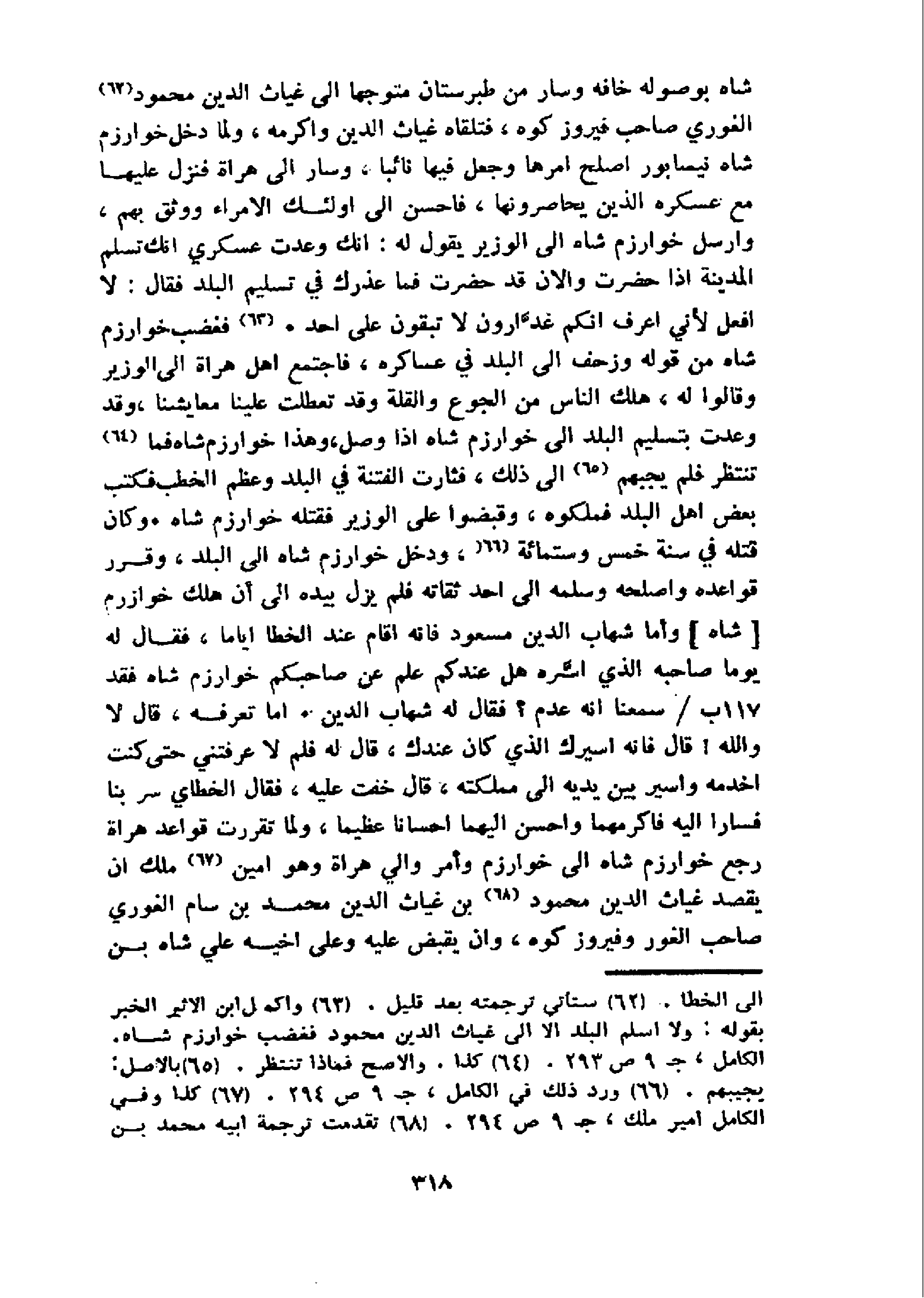 شاه بوصوله خافه وسار من طبرستان متوجها الى غياث الدين محمود 62 الغوري صاحب فيروزكوه، فتلقاه غياث الدين واكرمه، ولما دخل خوارزم شاه نيسابور اصلح امرها وجعل فيها نائبا، وسار الى هراة فنزل عليها مع عسكره الذين يحاصرونها، فاحسن الى اولئك الامراء ووثق بهم، وارسل خوارزم شاه الى الوزير يقول له: انك وعدت عسكري انك تسلم المدينة اذا حضرت والان قد حضرت فما عذرك في تسليم البلد فقال: لا افعل لأني اعرف انكم غدّارون لا تبقون على احد. 63 فغضب خوارزم شاه من قوله وزحف الى البلد في عساكره، فاجتمع اهل هراة الى الوزير وقالوا له، هلك الناس من الجوع والقلة وقد تعطلت علينا معايشنا، وقد وعدت بتسليم البلد الى خوارزم شاه اذا وصل، وهذا خوارزم شاه فما 64 تنتظر فلم يجبهم 65 الى ذلك، فثارت الفتنة في البلد وعظم الخطب فكتب بعض اهل البلد فملكوه، وقبضوا على الوزير فقتله خوارزم شاه. وكان قتله في سنة خمس وستمائة 66، و دخل خوارزم شاه الى البلد، وقرر قواعده واصلحه وسلمه الى احد ثقاته فلم يزل بيده الى أن هلك خوارزم [شاه] وأما شهاب الدين مسعود فانه اقام عند الخطا اياما، فقال له يوما صاحبه الذي اسّره هل عندكم علم عن صاحبكم خوارزم شاه فقد 117 ب/سمعنا انه عدم؟ فقال له شهاب الدين. اما تعرفه، قال لا والله! قال فانه اسيرك الذي كان عندك، قال له فلم لا عرفتني حتى كنت اخدمه واسير بين يديه الى مملكته، قال خفت عليه، فقال الخطاي سر بنا فسارا اليه فاكرمهما واحسن اليهما احسانا عظيما، ولما تقررت قواعد هراة رجع خوارزم شاه الى خوارزم وأمر والي هراة وهو امين 67 ملك ان يقصد غياث الدين محمود 68 بن غياث الدين محمد بن سام الغوري صاحب الغور وفيروزكوه، وان يقبض عليه وعلى اخيه علي شاه بن