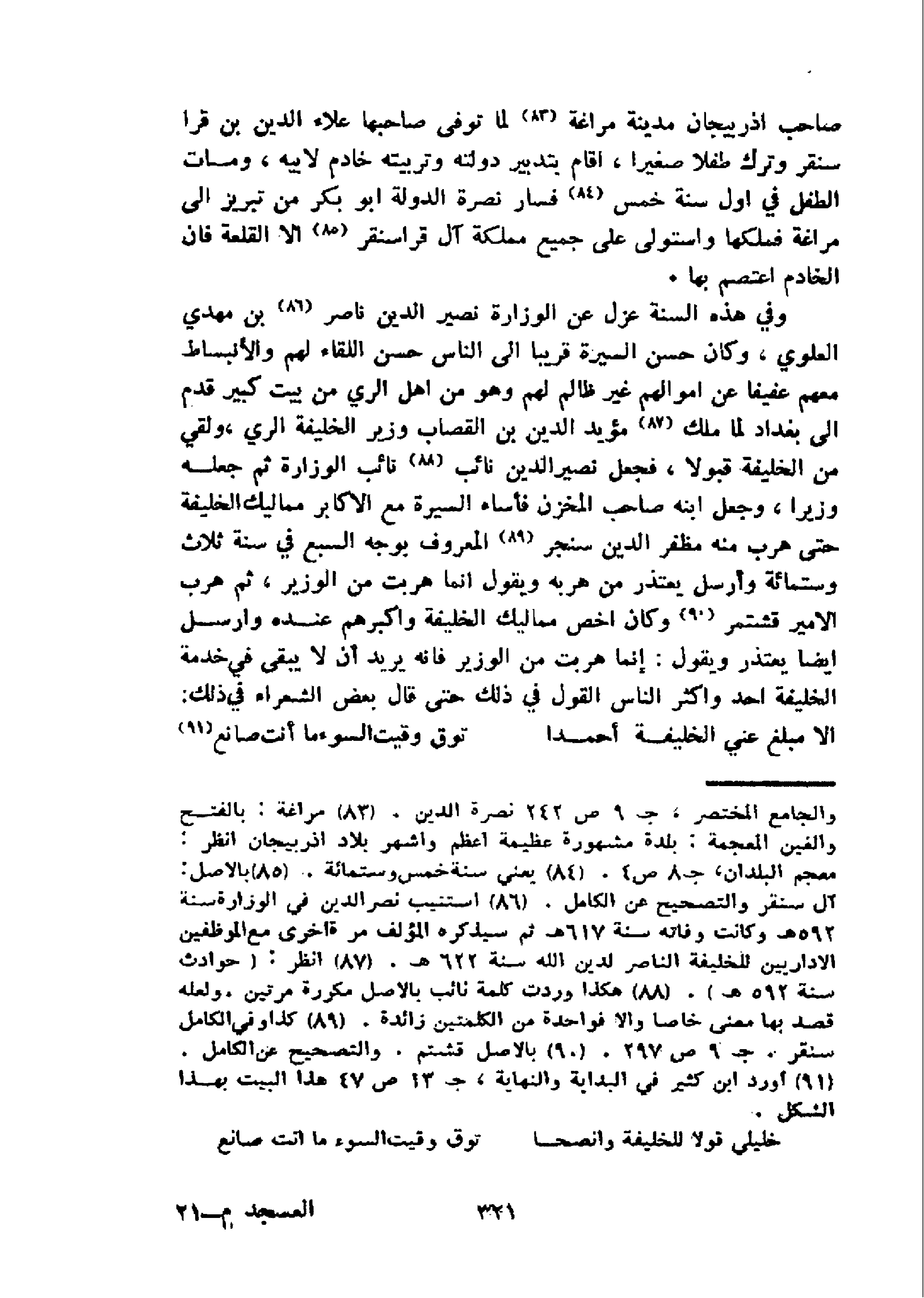 و في هذه السنة عزل عن الوزارة نصير الدين ناصر 86 بن مهدي العلوي، وكان حسن السيرة قريبا الى الناس حسن اللقاء لهم والأنبساط معهم عفيفا عن اموالهم غير ظالم لهم وهو من اهل الري من بيت كبير قدم الى بغداد لما ملك 87 مؤيد الدين بن القصاب وزير الخليفة الري، ولقي من الخليفة قبولا، فجعل نصير الدين نائب 88 نائب الوزارة ثم جعله وزيرا، وجعل ابنه صاحب المخزن فأساء السيرة مع الاكابر مماليك الخليفة حتى هرب منه مظفر الدين سنجر 89 المعروف بوجه السبع في سنة ثلاث وستمائة وأرسل يعتذر من هربه ويقول انما هربت من الوزير، ثم هرب الامير قشتمر 90 و كان اخص مماليك الخليفة واكبرهم عنده وارسل ايضا يعتذر ويقول: إنما هربت من الوزير فانه يريد أن لا يبقى في خدمة الخليفة احد واكثر الناس القول في ذلك حتى قال بعض الشعراء في ذلك: