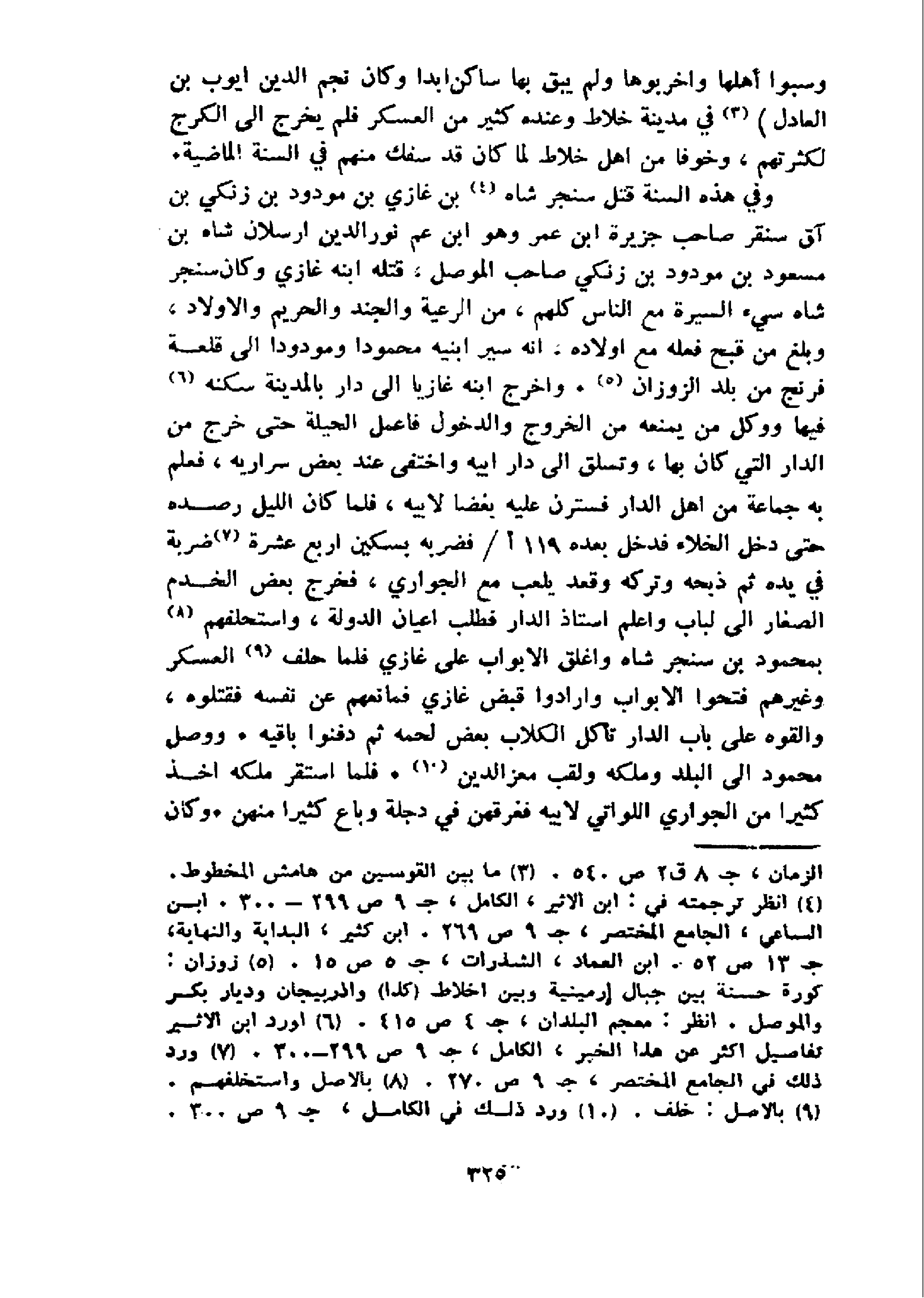 و في هذه السنة قتل سنجر شاه 4 بن غازي بن مودود بن زنكي بن آق سنقر صاحب جزيرة ابن عمر وهو ابن عم نور الدين ارسلان شاه بن مسعود بن مودود بن زنكي صاحب الموصل، قتله ابنه غازي وكان سنجر شاه سيء السيرة مع الناس كلهم، من الرعية والجند والحريم والاولاد، وبلغ من قبح فعله مع اولاده، انه سير ابنيه محمودا ومودودا الى قلعة فرنج من بلد الزوزان 5.و اخرج ابنه غازيا الى دار بالمدينة سكنه 6 فيها ووكل من يمنعه من الخروج والدخول فاعمل الحيلة حتى خرج من الدار التي كان بها، وتسلق الى دار ابيه واختفى عند بعض سراريه، فعلم به جماعة من اهل الدار فسترن عليه بغضا لابيه، فلما كان الليل رصده حتى دخل الخلاء فدخل بعده 119 أ/فضربه بسكين اربع عشرة 7 ضربة في يده ثم ذبحه وتركه وقعد يلعب مع الجواري، فخرج بعض الخدم الصغار الى لباب واعلم استاذ الدار فطلب اعيان الدولة، واستحلفهم 8 بمحمود بن سنجر شاه واغلق الابواب على غازي فلما حلف 9 العسكر وغيرهم فتحوا الابواب وارادوا قبض غازي فمانعهم عن نفسه فقتلوه، والقوه على باب الدار تأكل الكلاب بعض لحمه ثم دفنوا باقيه. ووصل محمود الى البلد وملكه ولقب معز الدين 10.فلما استقر ملكه اخذ كثيرا من الجواري اللواتي لابيه فغرقهن في دجلة وباع كثيرا منهن. وكان