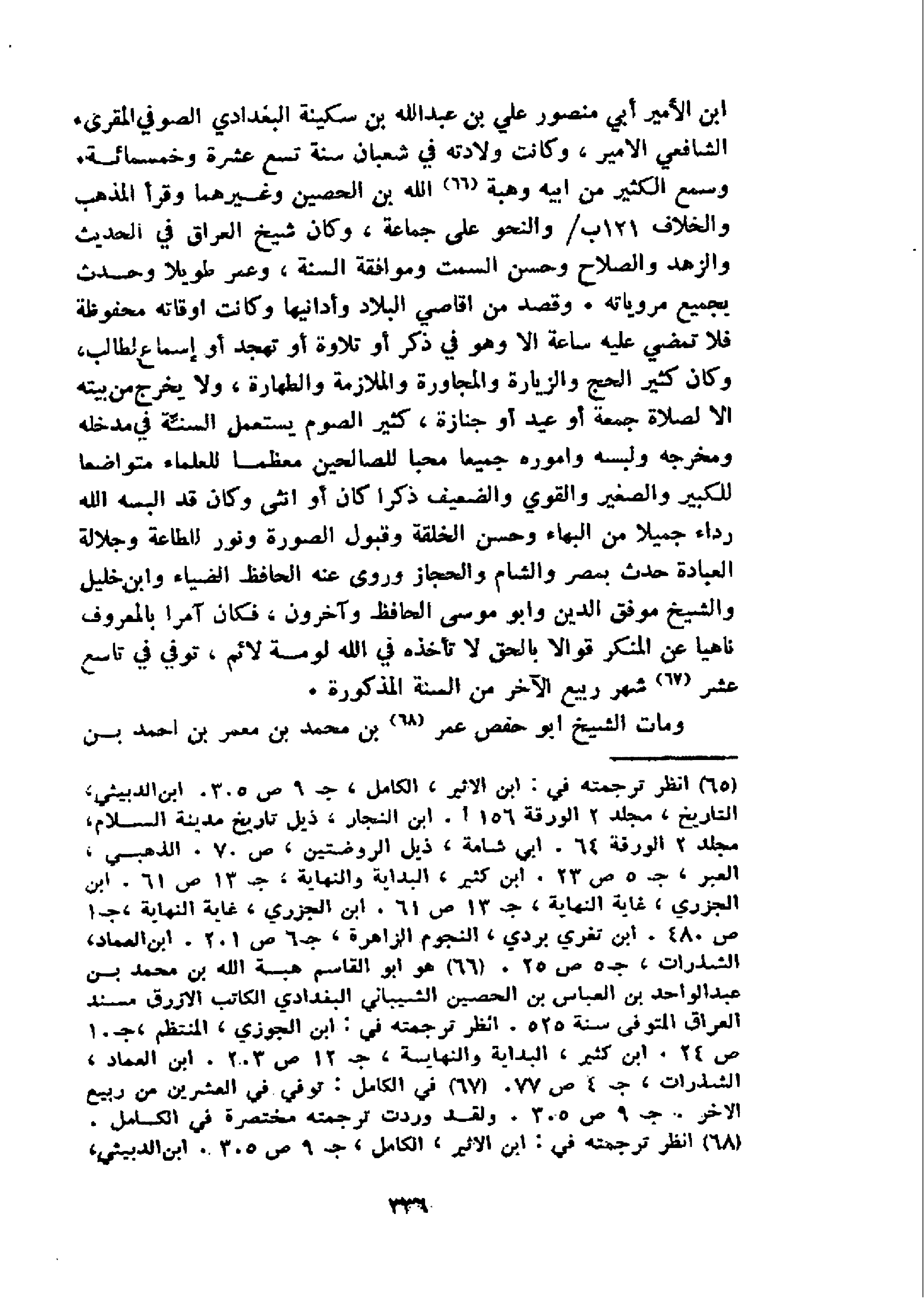 و سمع الكثير من ابيه وهبة 66 الله بن الحصين وغيرهما وقرأ المذهب والخلاف 121 ب/و النحو على جماعة، وكان شيخ العراق في الحديث والزهد والصلاح وحسن السمت وموافقة السنة، وعمر طويلا وحدث بجميع مروياته. وقصد من اقاصي البلاد وأدانيها وكانت اوقاته محفوظة فلا تمضي عليه ساعة الا وهو في ذكر أو تلاوة أو تهجد أو إسماع لطالب، وكان كثير الحج والزيارة والمجاورة والملازمة والطهارة، ولا يخرج من بيته الا لصلاة جمعة أو عيد أو جنازة، كثير الصوم يستعمل السنّة في مدخله ومخرجه ولبسه واموره جميعا محبا للصالحين معظما للعلماء متواضعا للكبير والصغير والقوي والضعيف ذكرا كان أو انثى وكان قد البسه الله رداء جميلا من البهاء وحسن الخلقة وقبول الصورة ونور للطاعة وجلالة العبادة حدث بمصر والشام والحجاز وروى عنه الحافظ الضياء وابن خليل والشيخ موفق الدين وابو موسى الحافظ وآخرون، فكان آمرا بالمعروف ناهيا عن المنكر قوالا بالحق لا تأخذه في الله لومة لائم، توفي في تاسع عشر 67 شهر ربيع الآخر من السنة المذكورة.