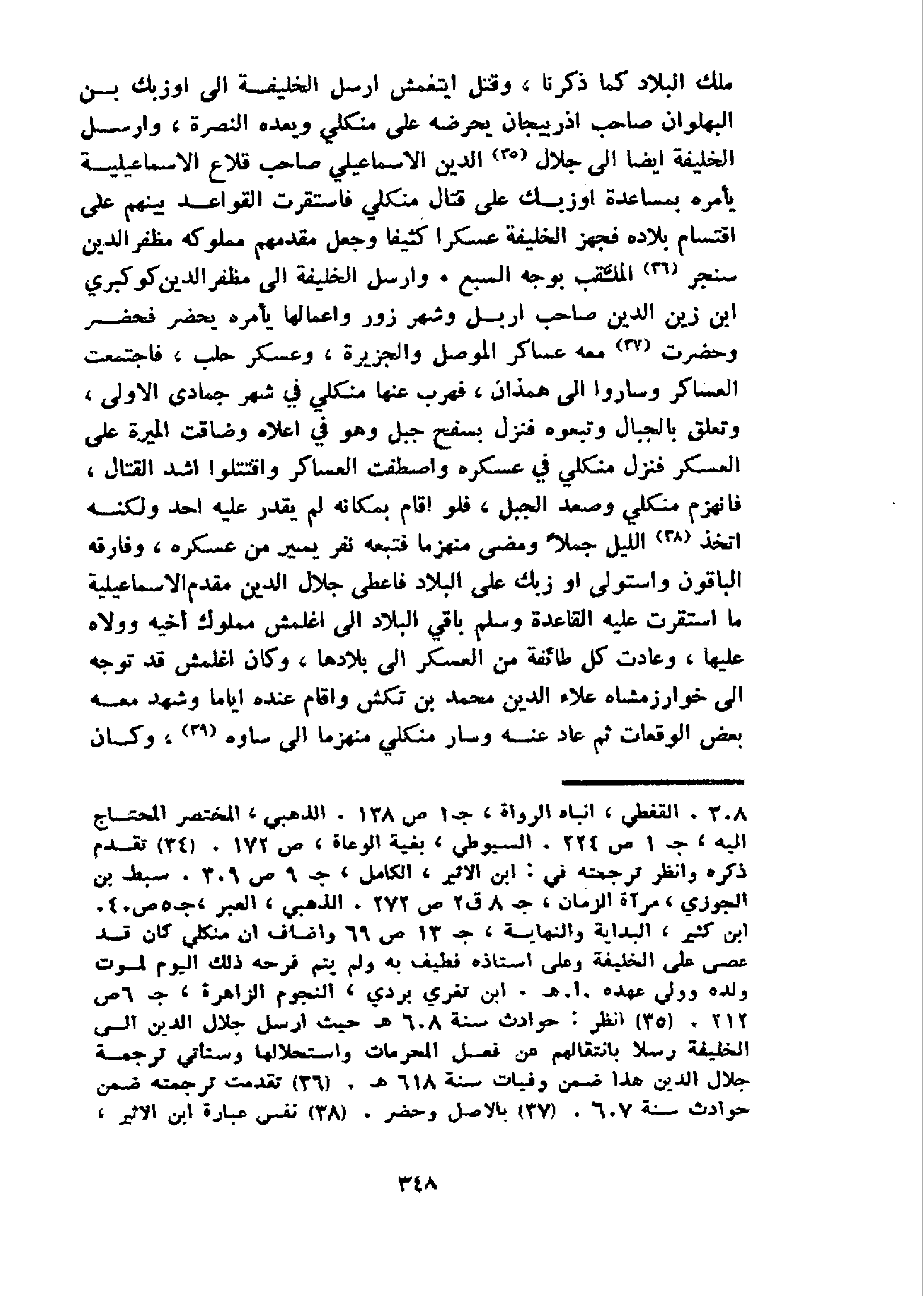 ملك البلاد كما ذكرنا، وقتل ايتغمش ارسل الخليفة الى اوزبك بن البهلوان صاحب اذربيجان يحرضه على منكلي ويعده النصرة، وارسل الخليفة ايضا الى جلال 35 الدين الاسماعيلي صاحب قلاع الاسماعيلية يأمره بمساعدة اوزبك على قتال منكلي فاستقرت القواعد بينهم على اقتسام بلاده فجهز الخليفة عسكرا كثيفا وجعل مقدمهم مملوكه مظفر الدين سنجر 36 الملقّب بوجه السبع. وارسل الخليفة الى مظفر الدين كوكبري ابن زين الدين صاحب اربل وشهرزور واعمالها يأمره يحضر فحضر وحضرت 37 معه عساكر الموصل والجزيرة، وعسكر حلب، فاجتمعت العساكر وساروا الى همذان، فهرب عنها منكلي في شهر جمادى الاولى، وتعلق بالجبال وتبعوه فنزل بسفح جبل وهو في اعلاه وضاقت الميرة على العسكر فنزل منكلي في عسكره واصطفت العساكر واقتتلوا اشد القتال، فانهزم منكلي وصعد الجبل، فلو اقام بمكانه لم يقدر عليه احد ولكنه اتخذ 38 الليل جملا ومضى منهزما فتبعه نفر يسير من عسكره، وفارقه الباقون واستولى اوزبك على البلاد فاعطى جلال الدين مقدم الاسماعيلية ما استقرت عليه القاعدة وسلم باقي البلاد الى اغلمش مملوك أخيه وولاه عليها، وعادت كل طائفة من العسكر الى بلادها، وكان اغلمش قد توجه الى خوارزمشاه علاء الدين محمد بن تكش واقام عنده اياما وشهد معه بعض الوقعات ثم عاد عنه وسار منكلي منهزما الى ساوه 39، و كان