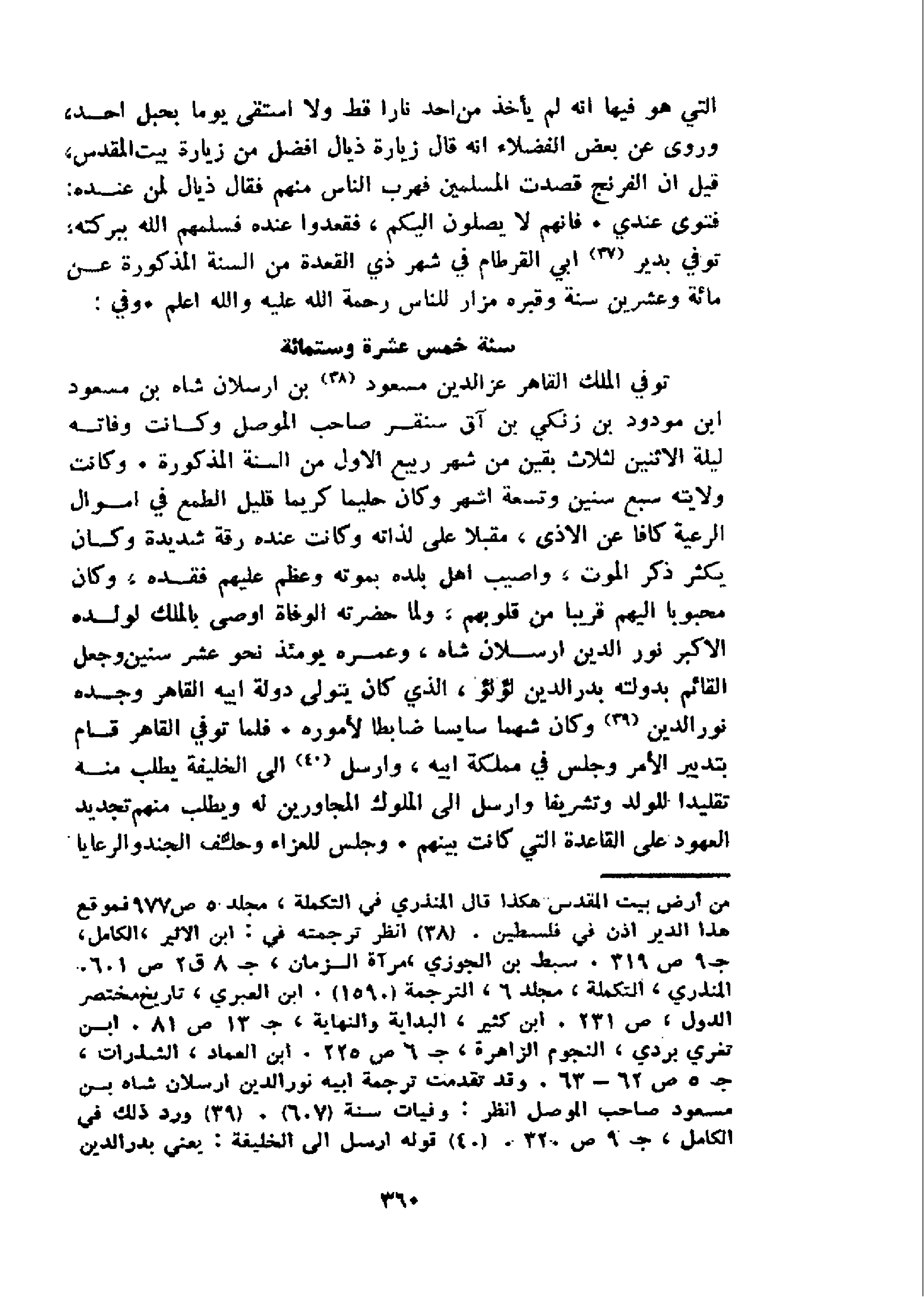 توفي الملك القاهر عز الدين مسعود 38 بن ارسلان شاه بن مسعود ابن مودود بن زنكي بن آق سنقر صاحب الموصل وكانت وفاته ليلة الاثنين لثلاث بقين من شهر ربيع الاول من السنة المذكورة. وكانت ولايته سبع سنين وتسعة اشهر وكان حليما كريما قليل الطمع في اموال الرعية كافا عن الاذى، مقبلا على لذاته وكانت عنده رقة شديدة وكان يكثر ذكر الموت، واصيب اهل بلده بموته وعظم عليهم فقده، وكان محبوبا اليهم قريبا من قلوبهم، ولما حضرته الوفاة اوصى بالملك لولده الاكبر نور الدين ارسلان شاه، وعمره يومئذ نحو عشر سنين وجعل القائم بدولته بدر الدين لؤلؤ، الذي كان يتولى دولة ابيه القاهر وجده نور الدين 39 و كان شهما سايسا ضابطا لأموره. فلما توفي القاهر قام بتدبير الأمر وجلس في مملكة ابيه، وارسل 40 الى الخليفة يطلب منه تقليدا للولد وتشريفا وارسل الى الملوك المجاورين له ويطلب منهم تجديد العهود على القاعدة التي كانت بينهم. وجلس للعزاء وحلّف الجند والرعايا