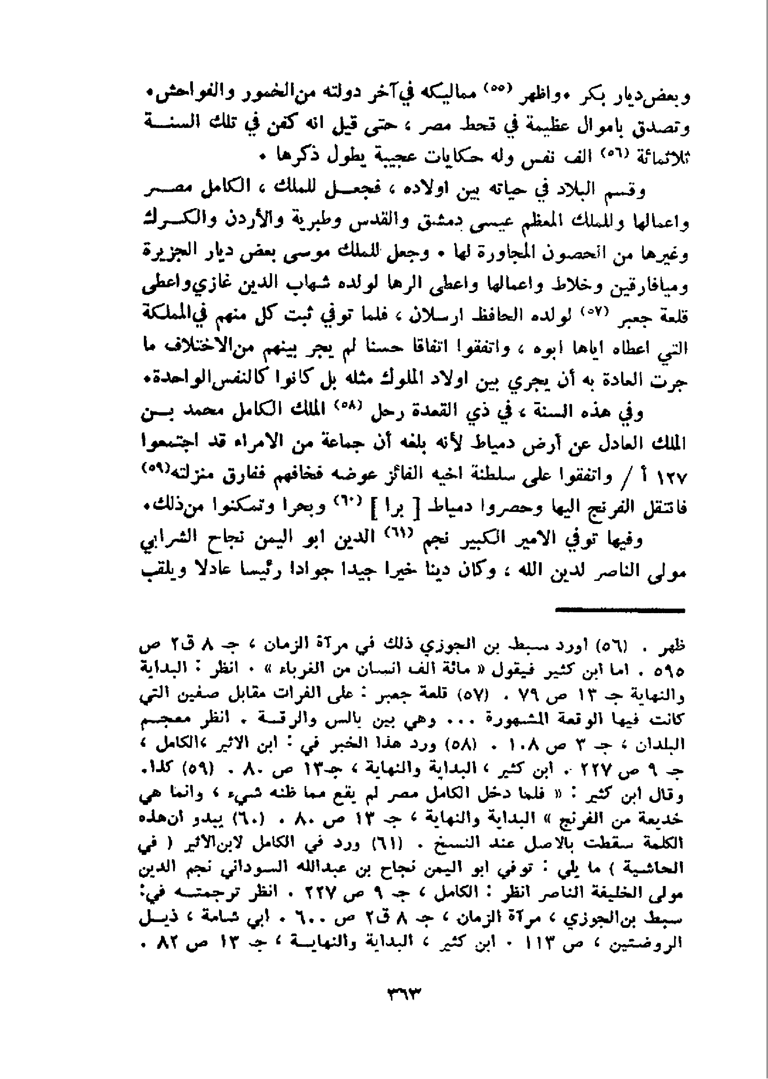 و في هذه السنة، في ذي القعدة رحل 58 الملك الكامل محمد بن الملك العادل عن أرض دمياط لأنه بلغه أن جماعة من الامراء قد اجتمعوا 127 أ/و اتفقوا على سلطنة اخيه الفائز عوضه فخافهم ففارق منزلته 59 فانتقل الفرنج اليها وحصروا دمياط [برا] 60 و بحرا وتمكنوا من ذلك.
