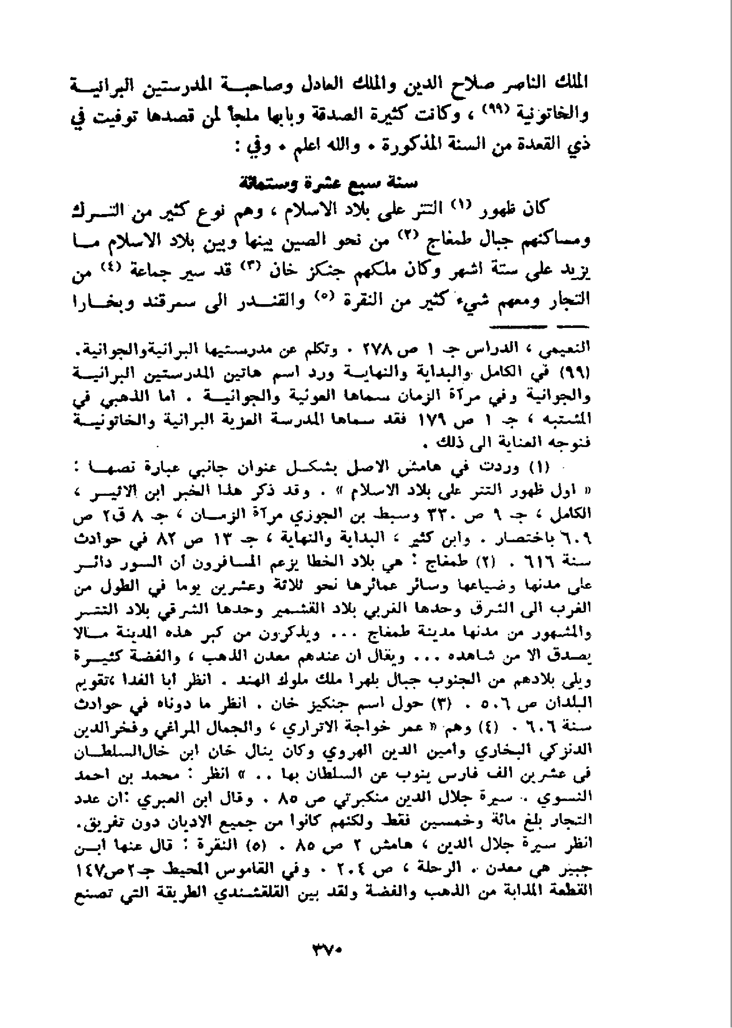 كان ظهور 1 التتر على بلاد الاسلام، وهم نوع كثير من الترك ومساكنهم جبال طمغاج 2 من نحو الصين بينها وبين بلاد الاسلام ما يزيد على ستة اشهر وكان ملكهم جنكز خان 3 قد سير جماعة 4 من التجار ومعهم شيء كثير من النقرة 5 والقندر الى سمرقند وبخارا