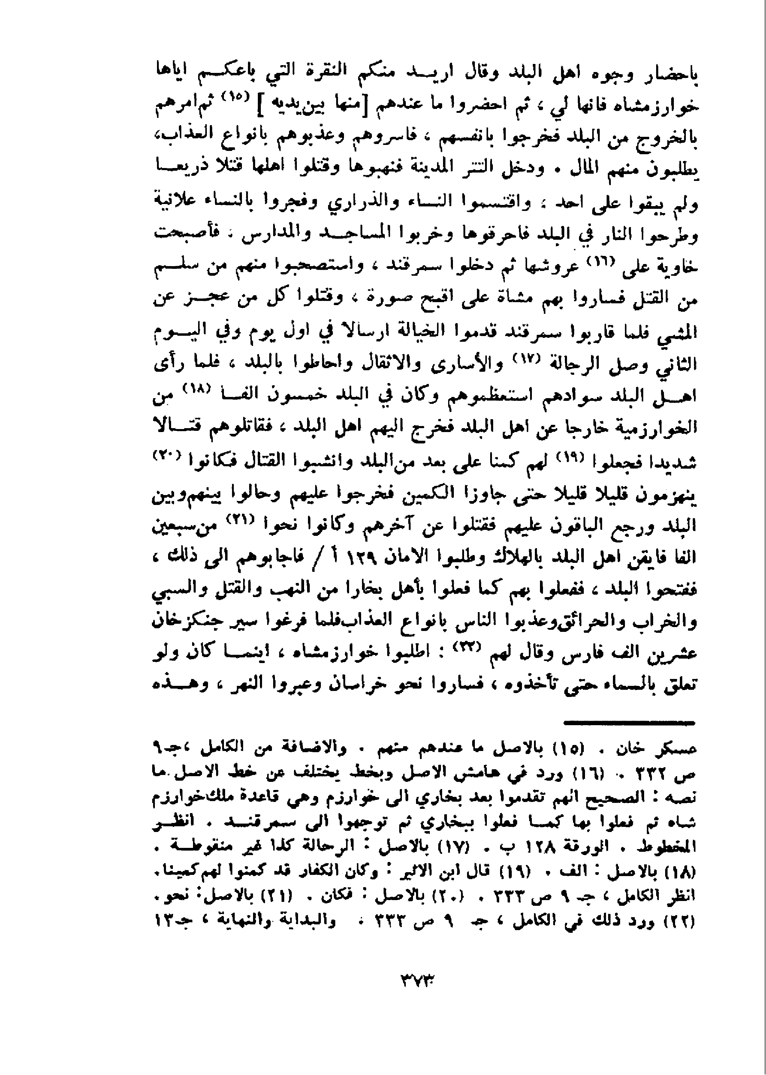 باحضار وجوه اهل البلد وقال اريد منكم النقرة التي باعكم اياها خوارزمشاه فانها لي، ثم احضروا ما عندهم [منها بين يديه] 15 ثم امرهم بالخروج من البلد فخرجوا بانفسهم، فاسروهم وعذبوهم بانواع العذاب، يطلبون منهم المال. ودخل التتر المدينة فنهبوها وقتلوا اهلها قتلا ذريعا ولم يبقوا على احد، واقتسموا النساء والذراري وفجروا بالنساء علانية وطرحوا النار في البلد فاحرقوها وخربوا المساجد والمدارس، فأصبحت خاوية على 16 عروشها ثم دخلوا سمرقند، واستصحبوا منهم من سلم من القتل فساروا بهم مشاة على اقبح صورة، وقتلوا كل من عجز عن المشي فلما قاربوا سمرقند قدموا الخيالة ارسالا في اول يوم وفي اليوم الثاني وصل الرجالة 17 و الأسارى والاثقال واحاطوا بالبلد، فلما رأى اهل البلد سوادهم استعظموهم وكان في البلد خمسون الفا 18 من الخوارزمية خارجا عن اهل البلد فخرج اليهم اهل البلد، فقاتلوهم قتالا شديدا فجعلوا 19 لهم كمنا على بعد من البلد وانشبوا القتال فكانوا 20 ينهزمون قليلا قليلا حتى جاوزا الكمين فخرجوا عليهم وحالوا بينهم وبين البلد ورجع الباقون عليهم فقتلوا عن آخرهم وكانوا نحوا 21 من سبعين الفا فايقن اهل البلد بالهلاك وطلبوا الامان 129 أ/فاجابوهم الى ذلك، ففتحوا البلد، ففعلوا بهم كما فعلوا بأهل بخارا من النهب والقتل والسبي والخراب والحرائق وعذبوا الناس بانواع العذاب فلما فرغوا سير جنكز خان عشرين الف فارس وقال لهم 22:اطلبوا خوارزمشاه، اينما كان ولو تعلق بالسماء حتى تأخذوه، فساروا نحو خراسان وعبروا النهر، وهذه