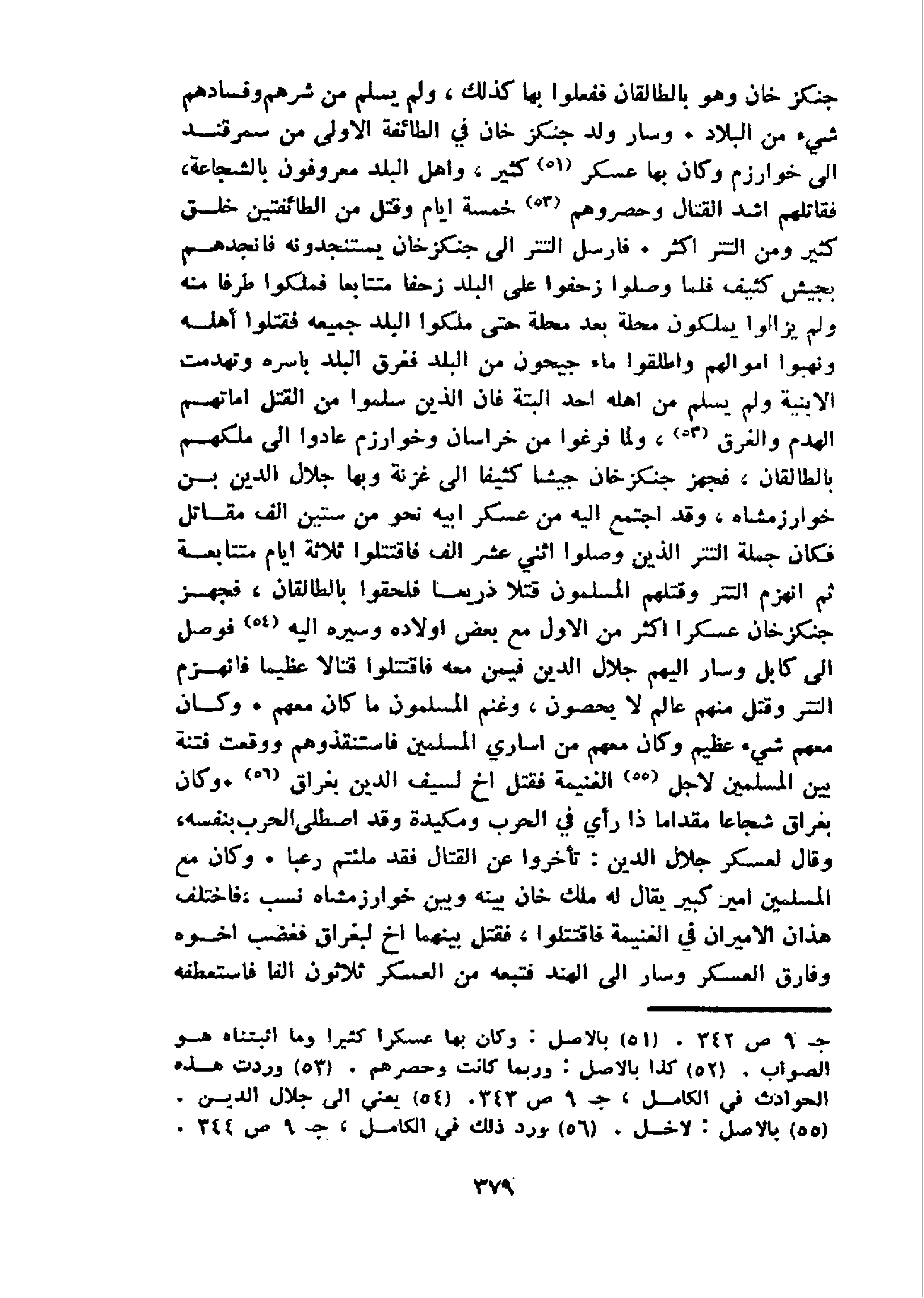جنكز خان وهو بالطالقان ففعلوا بها كذلك، ولم يسلم من شرهم وفسادهم شيء من البلاد. وسار ولد جنكز خان في الطائفة الاولى من سمرقند الى خوارزم وكان بها عسكر 51 كثير، واهل البلد معروفون بالشجاعة، فقاتلهم اشد القتال وحصروهم 52 خمسة ايام وقتل من الطائفتين خلق كثير ومن التتر اكثر. فارسل التتر الى جنكز خان يستنجدونه فانجدهم بجيش كثيف فلما وصلوا زحفوا على البلد زحفا متتابعا فملكوا طرفا منه ولم يزالوا يملكون محلة بعد محلة حتى ملكوا البلد جميعه فقتلوا أهله ونهبوا اموالهم واطلقوا ماء جيحون من البلد فغرق البلد باسره وتهدمت الابنية ولم يسلم من اهله احد البتة فان الذين سلموا من القتل اماتهم الهدم والغرق 53، و لما فرغوا من خراسان وخوارزم عادوا الى ملكهم بالطالقان، فجهز جنكز خان جيشا كثيفا الى غزنة وبها جلال الدين بن خوارزمشاه، وقد اجتمع اليه من عسكر ابيه نحو من ستين الف مقاتل فكان جملة التتر الذين وصلوا اثني عشر الف فاقتتلوا ثلاثة ايام متتابعة ثم انهزم التتر وقتلهم المسلمون قتلا ذريعا فلحقوا بالطالقان، فجهز جنكز خان عسكرا اكثر من الاول مع بعض اولاده وسيره اليه 54 فوصل الى كابل وسار اليهم جلال الدين فيمن معه فاقتتلوا قتالا عظيما فانهزم التتر وقتل منهم عالم لا يحصون، وغنم المسلمون ما كان معهم. وكان معهم شيء عظيم وكان معهم من اساري المسلمين فاستنقذوهم ووقعت فتنة بين المسلمين لاجل 55 الغنيمة فقتل اخ لسيف الدين بغراق 56.و كان بغراق شجاعا مقداما ذا رأي في الحرب ومكيدة وقد اصطلى الحرب بنفسه، وقال لعسكر جلال الدين: تأخروا عن القتال فقد ملئتم رعبا. وكان مع المسلمين امير كبير يقال له ملك خان بينه وبين خوارزمشاه نسب، فاختلف هذان الاميران في الغنيمة فاقتتلوا، فقتل بينهما اخ لبغراق فغضب اخوه وفارق العسكر وسار الى الهند فتبعه من العسكر ثلاثون الفا فاستعطفه