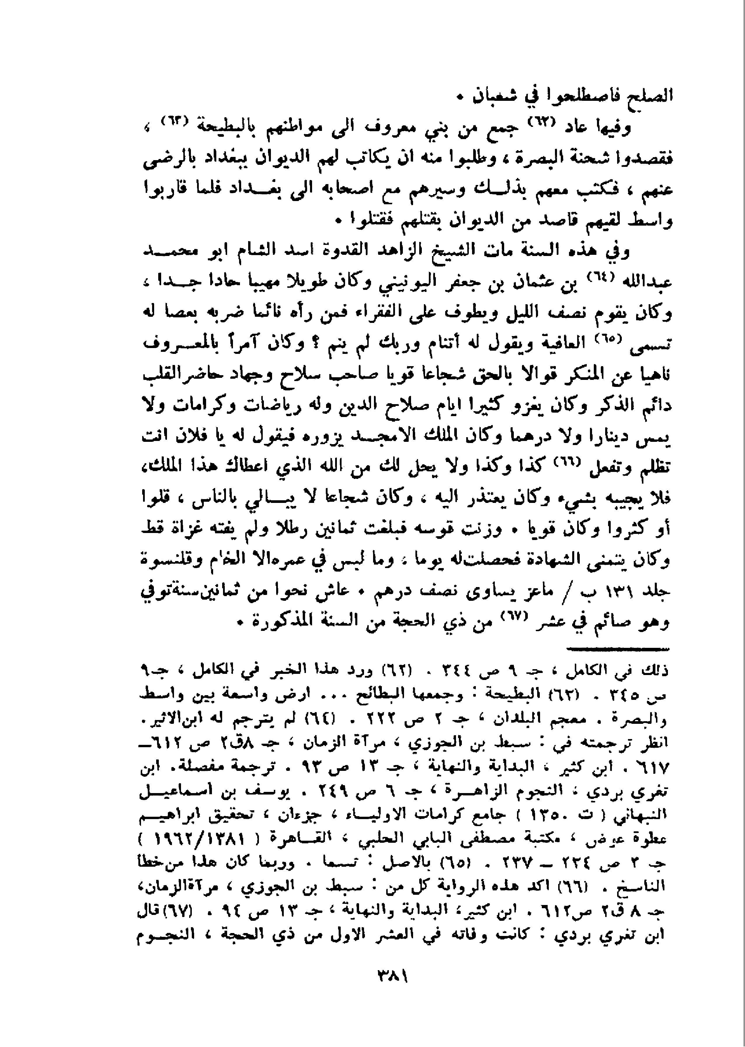 و في هذه السنة مات الشيخ الزاهد القدوة اسد الشام ابو محمد عبد الله 64 بن عثمان بن جعفر اليونيني وكان طويلا مهيبا حادا جدا، وكان يقوم نصف الليل ويطوف على الفقراء فمن رأه نائما ضربه بعصا له تسمى 65 العافية ويقول له أتنام وربك لم ينم؟ وكان آمرا بالمعروف ناهيا عن المنكر قوالا بالحق شجاعا قويا صاحب سلاح وجهاد حاضر القلب دائم الذكر وكان يغزو كثيرا ايام صلاح الدين وله رياضات وكرامات ولا يمس دينارا ولا درهما وكان الملك الامجد يزوره فيقول له يا فلان انت تظلم وتفعل 66 كذا وكذا ولا يحل لك من الله الذي اعطاك هذا الملك، فلا يجيبه بشيء وكان يعتذر اليه، وكان شجاعا لا يبالي بالناس، قلوا أو كثروا وكان قويا. وزنت قوسه فبلغت ثمانين رطلا ولم يفته غزاة قط وكان يتمنى الشهادة فحصلت له يوما، وما لبس في عمره الا الخام وقلنسوة جلد 131 ب/ماعز يساوى نصف درهم. عاش نحوا من ثمانين سنة توفي وهو صائم في عشر 67 من ذي الحجة من السنة المذكورة.